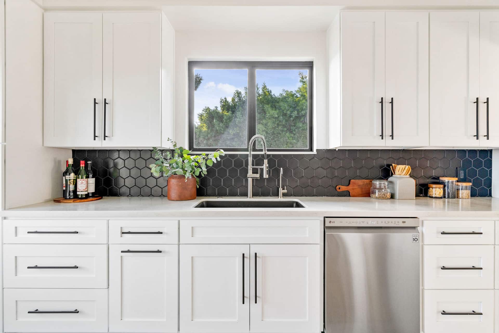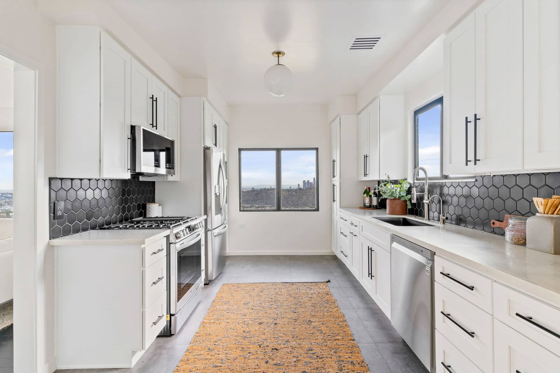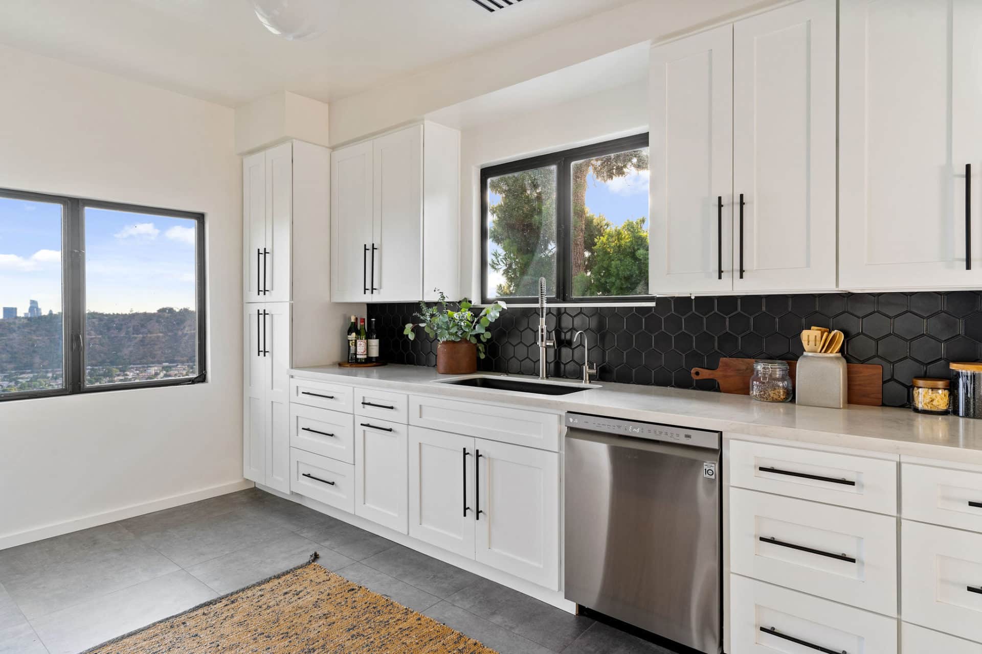 Off the living room is the renovated kitchen outfitted with stainless steel appliances, oversized chic concrete tile floors, white shaker cabinets, and matte black hexagon back splash.