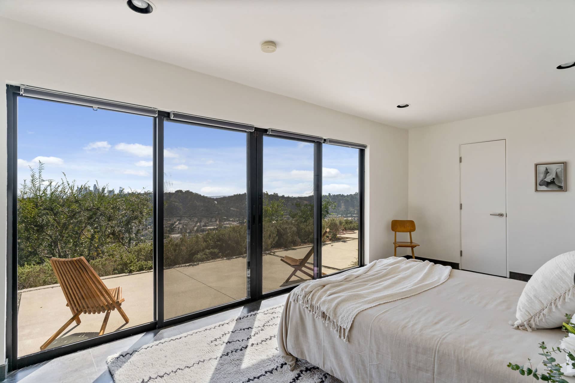 On the lower level, the large 3rd bedroom, an optional master or mother-in-law suite, offers a wall of sliders that open to a concrete terrace – perfect for classic CA indoor/outdoor living, built-in storage, and a full bath with tile shower.