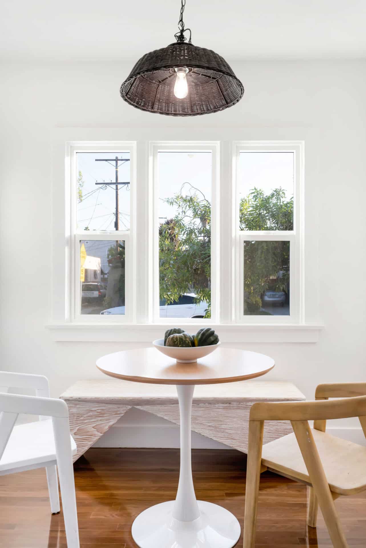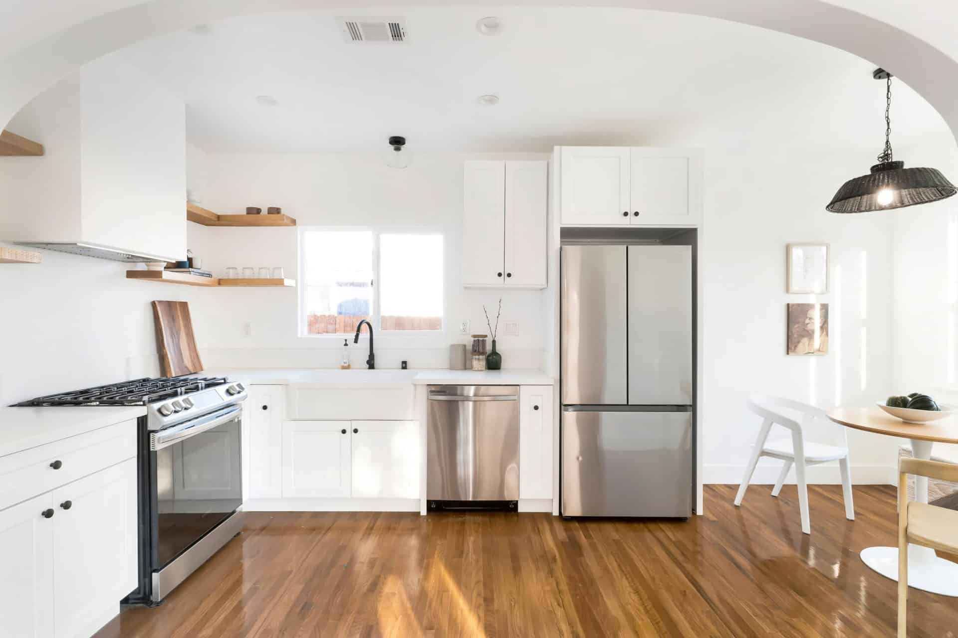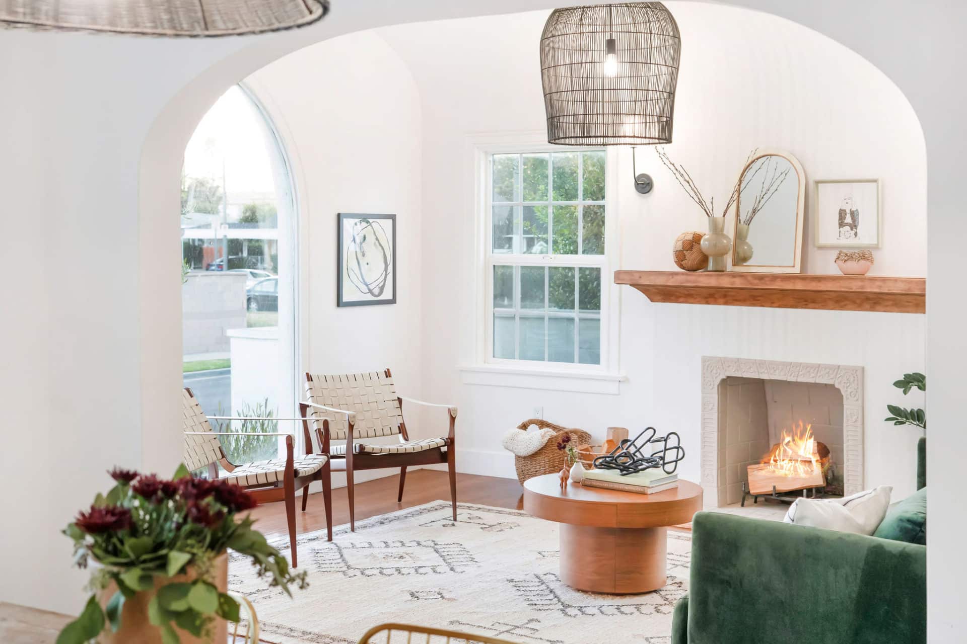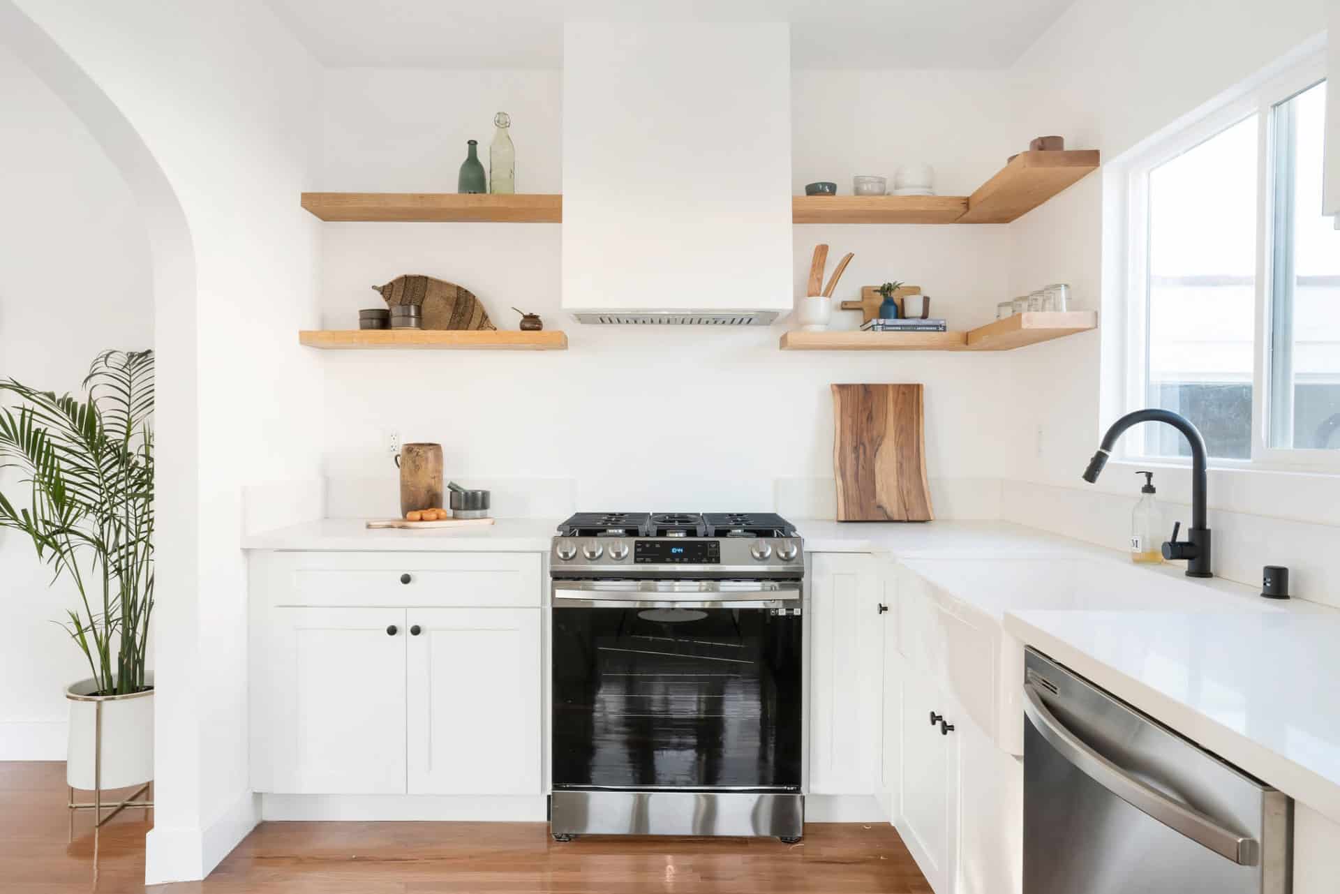 Living room with coved ceilings, huge arched picture window + handsome fireplace crowned with a wood mantle leads you through archways into a charming dining room with tray ceilings. Beyond that, a sun-splashed chef’s kitchen with farmhouse sink, open shelving, integrated hood, stainless steel appliances and an adorable breakfast nook for cozy mornings with a cup of coffee and the daily paper.