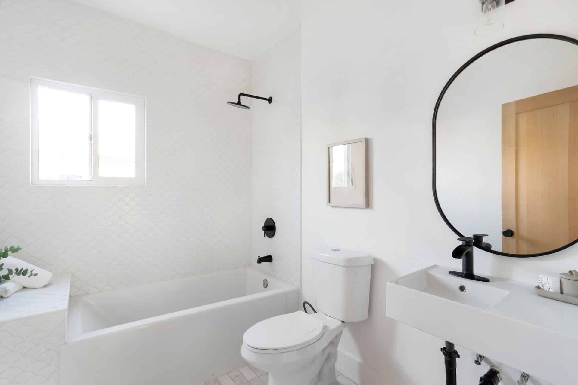 Hall bath with marble tile floors and chic black + white finishes is perfect for guests.