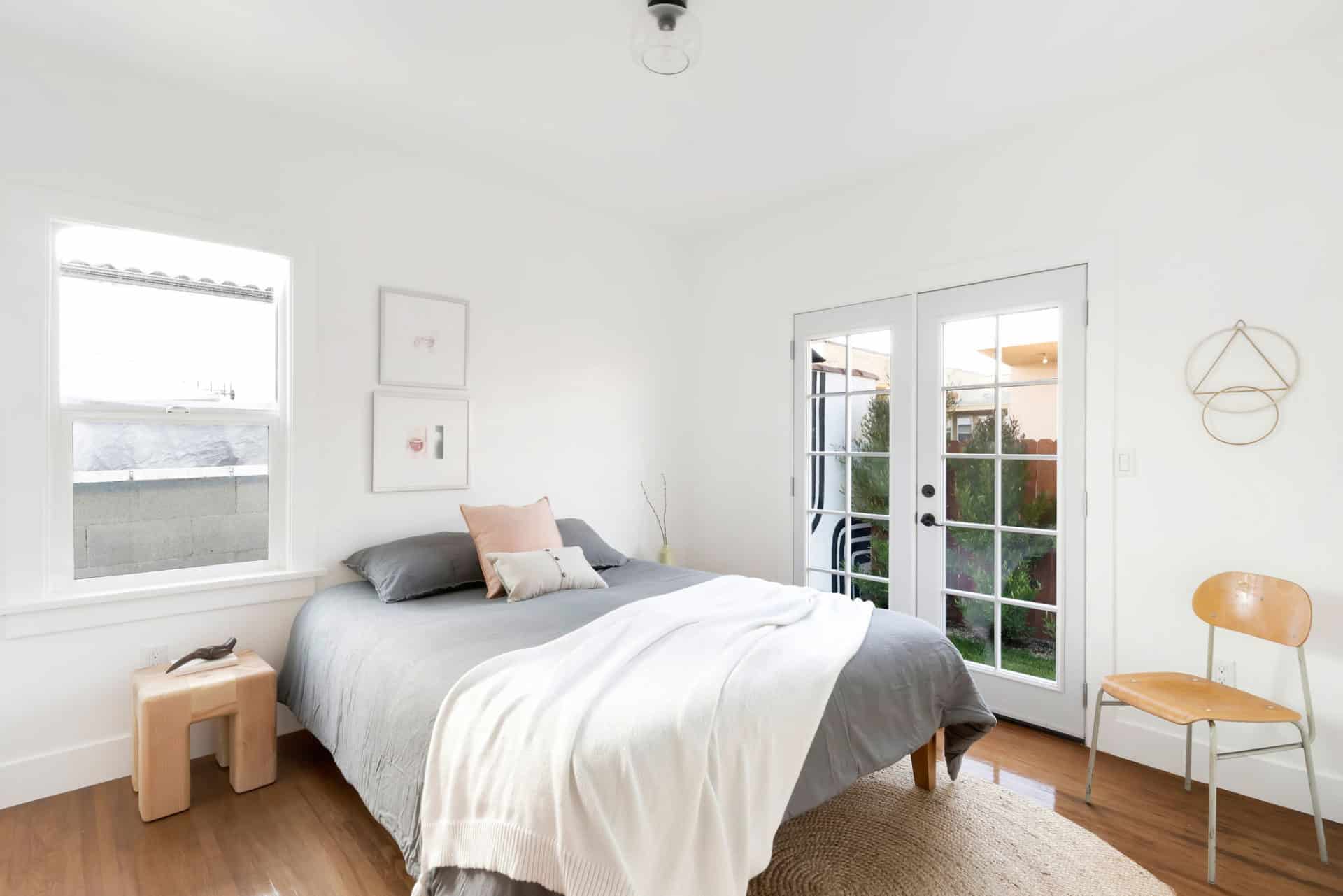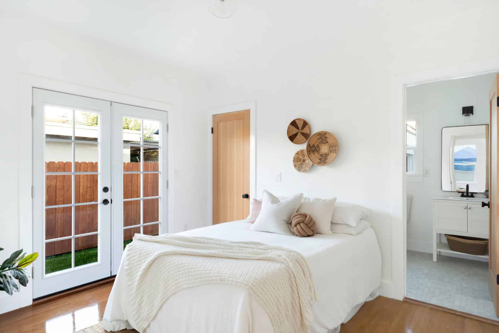 Home features 2 bedrooms with French doors that lead outside, maximizing indoor-outdoor living. Primary bedroom features an ensuite bath with gorgeous grid-laid tilework.