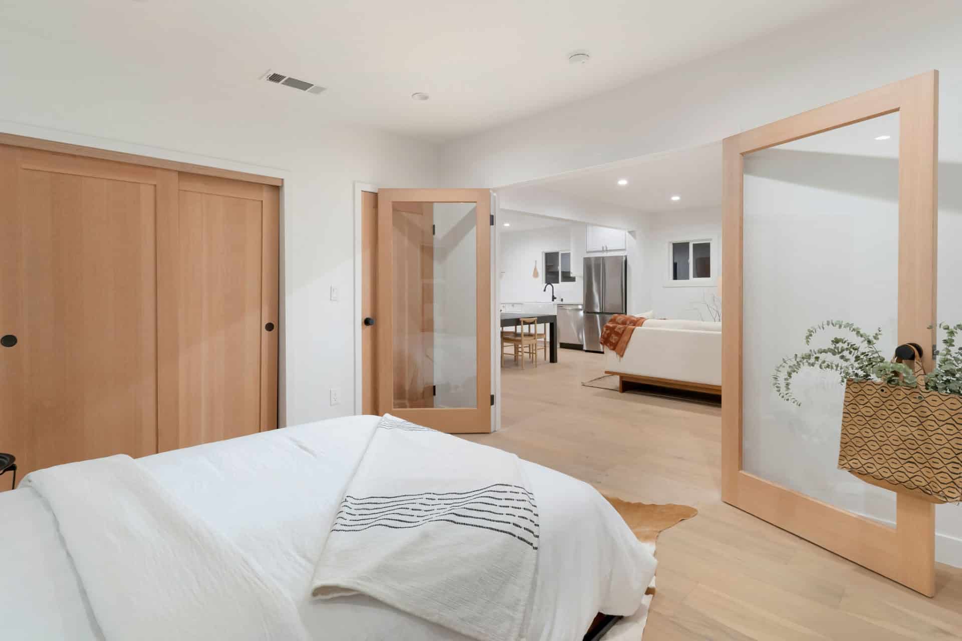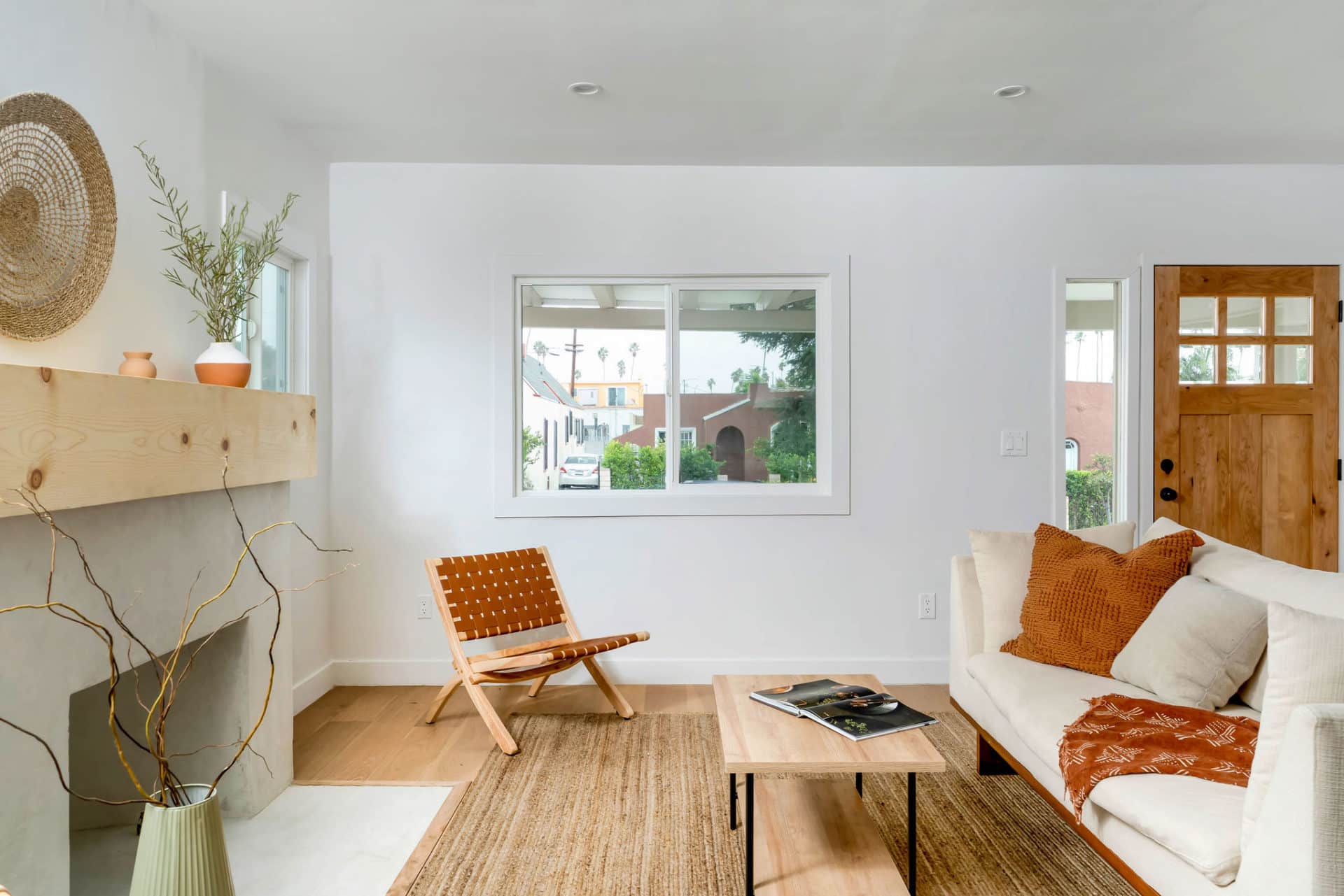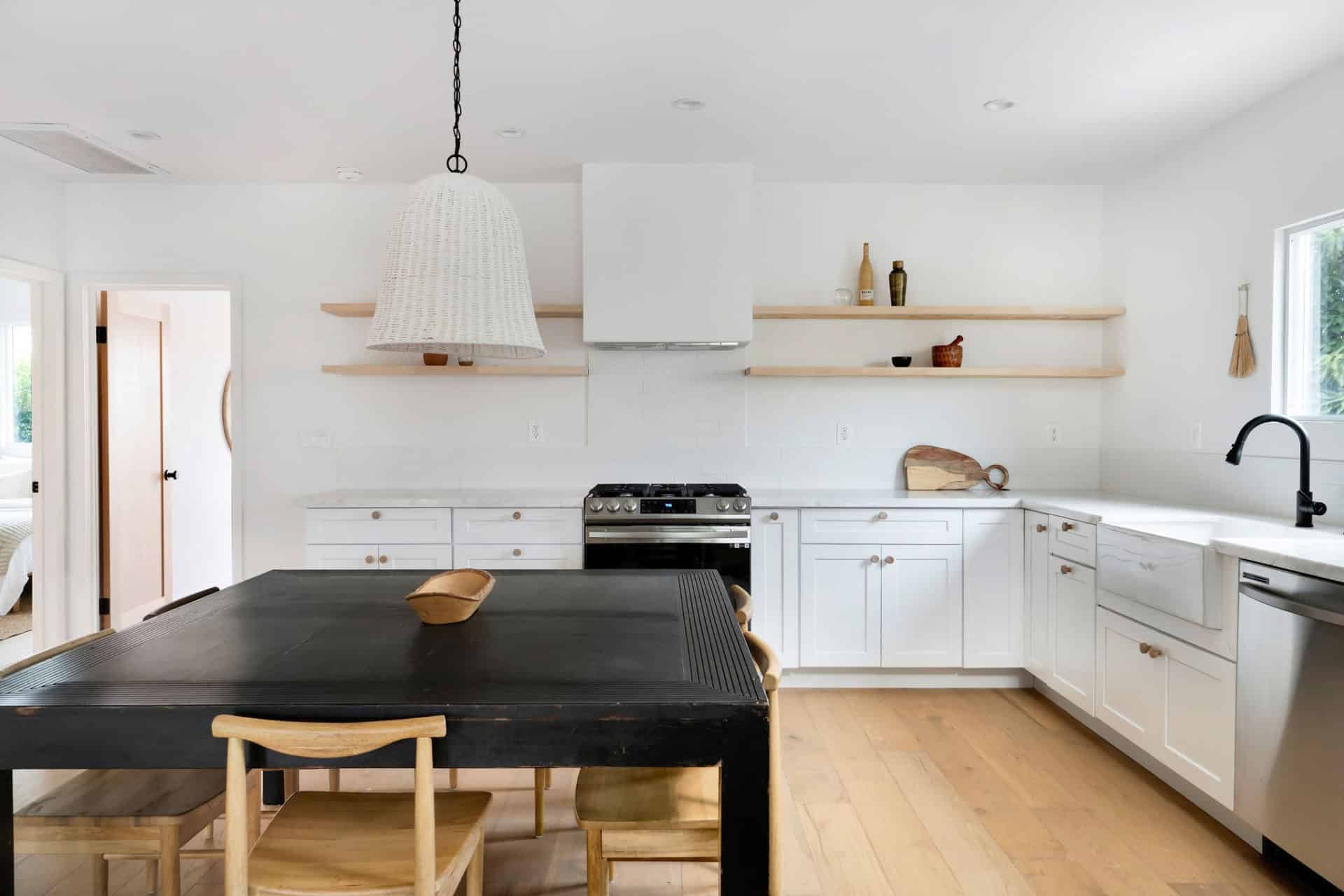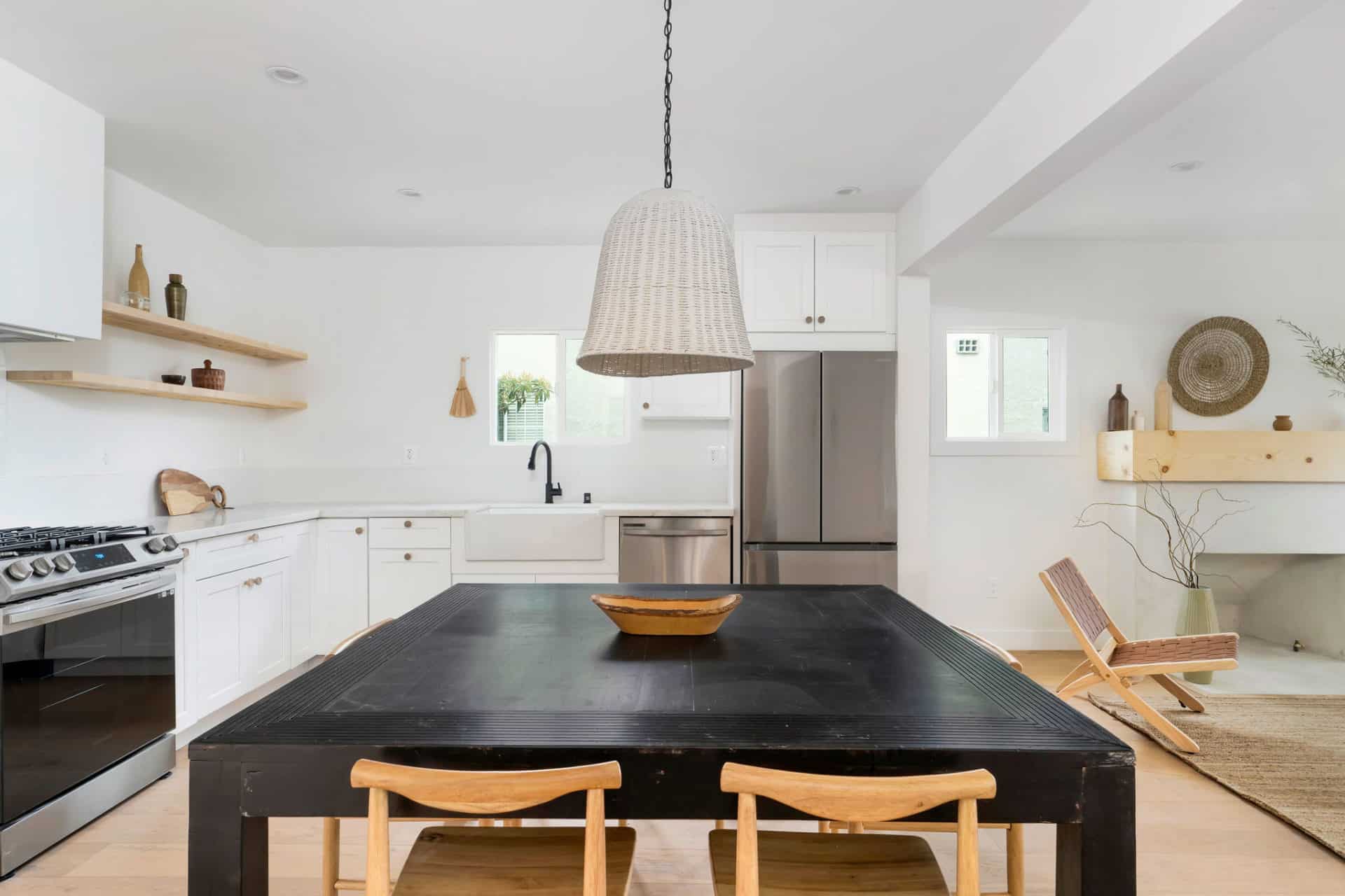 Light oak hardwood floors flow throughout an inspired open concept where the living room with chic stucco + wood decorative fireplace leads into dining room + fresh kitchen featuring custom cabinets, farmhouse sink, stainless steel appliances, open shelving and sleek integrated range hood.