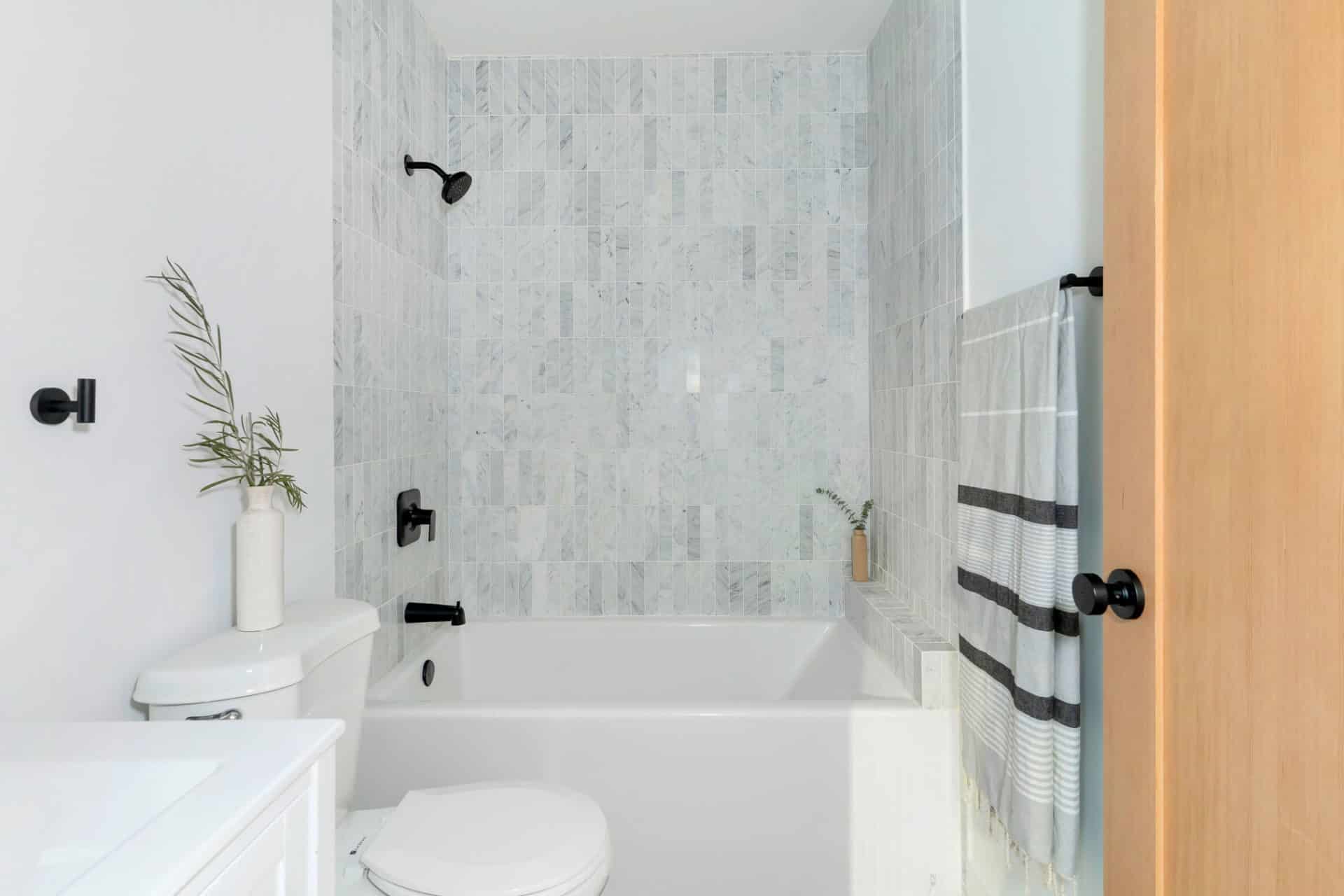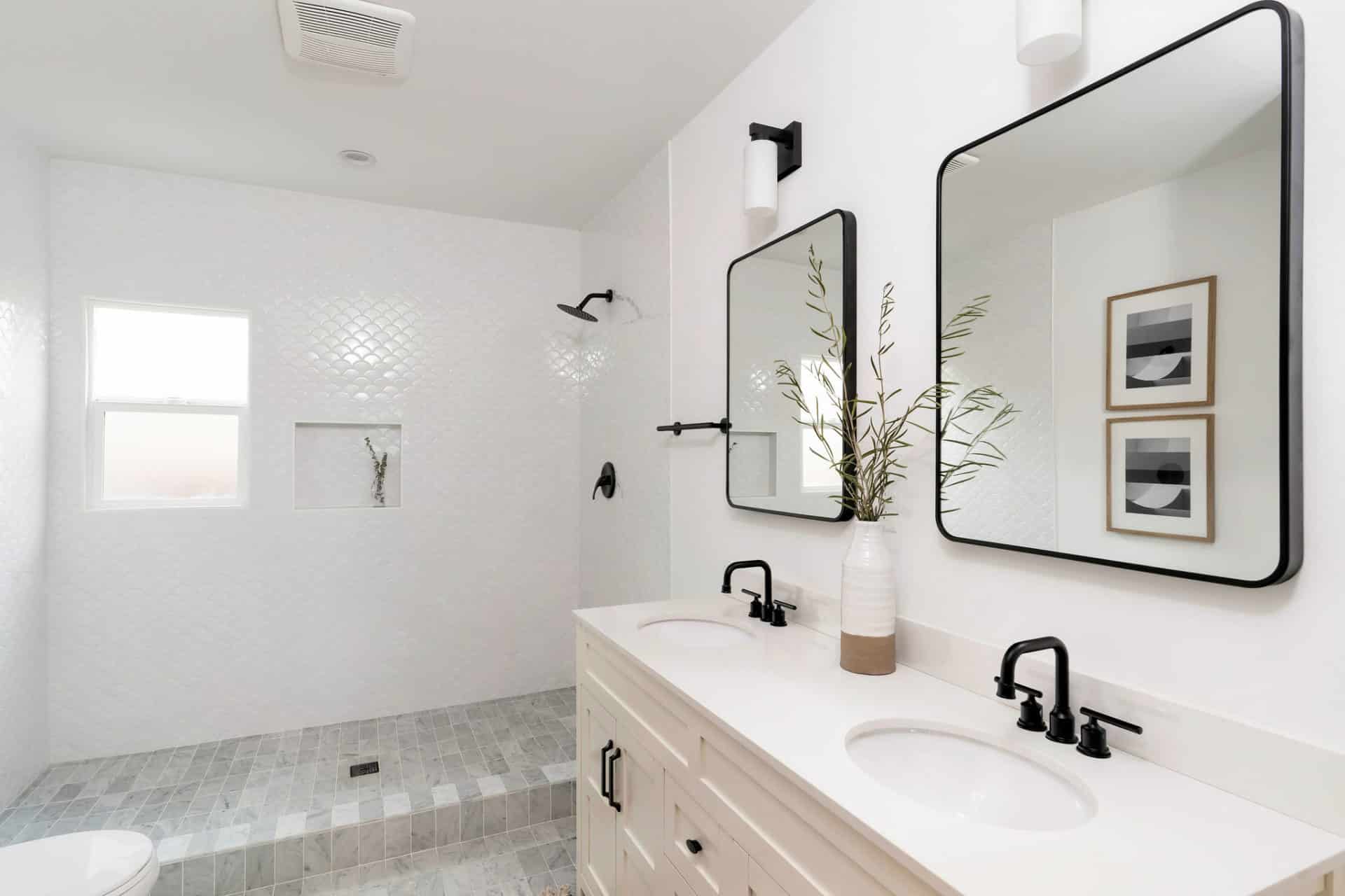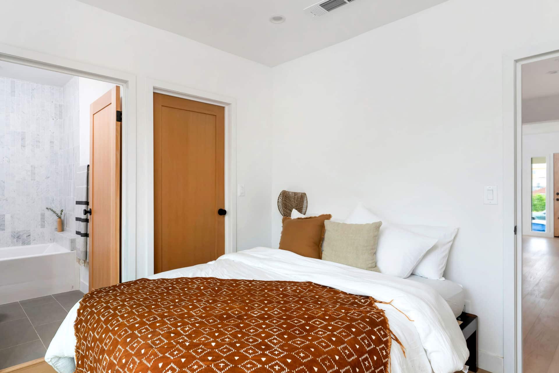 Two additional bedrooms offer ample overflow space, and share a spacious hall bath with dual vanity, stone counters, and clean scallop-tile shower, and new tub.