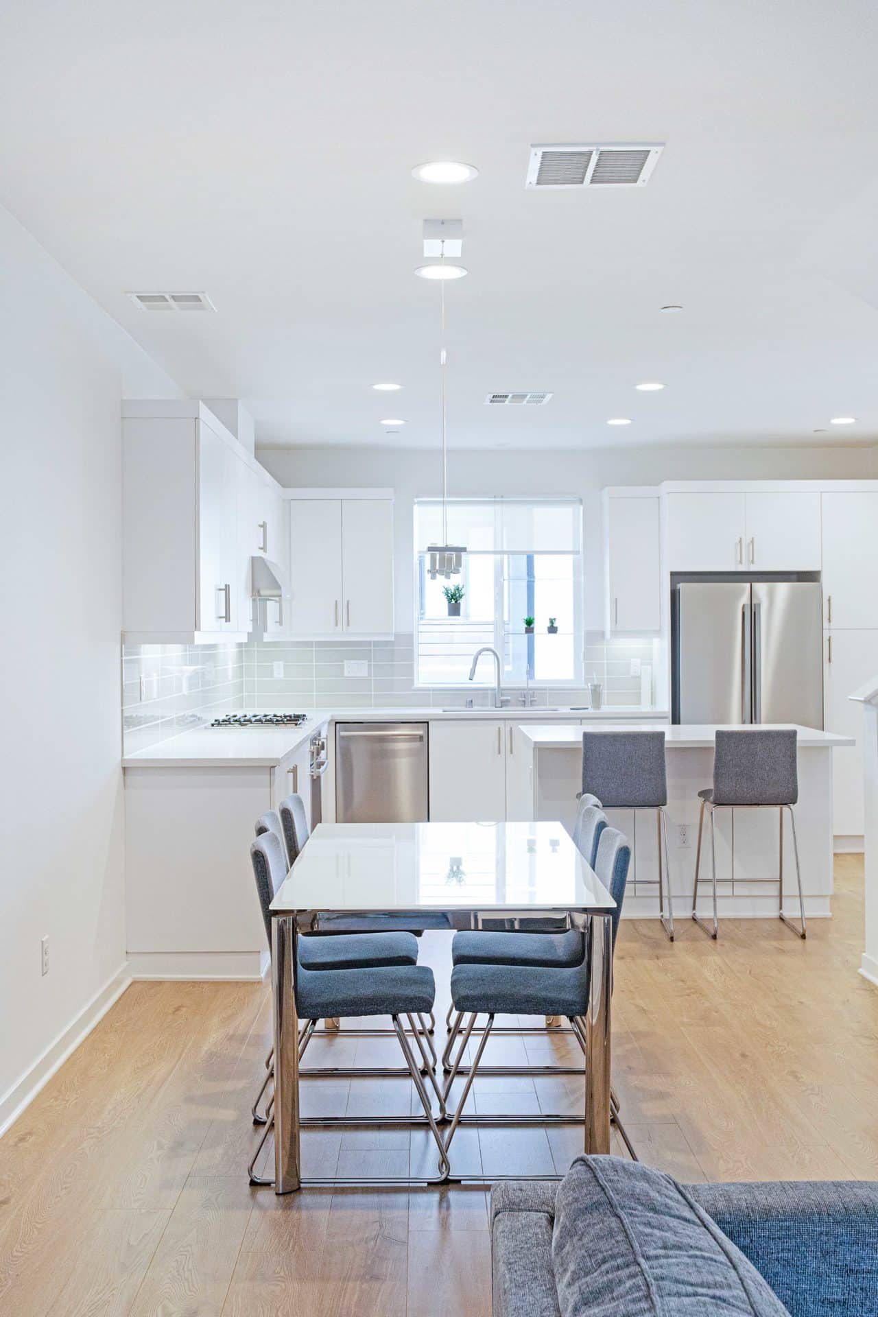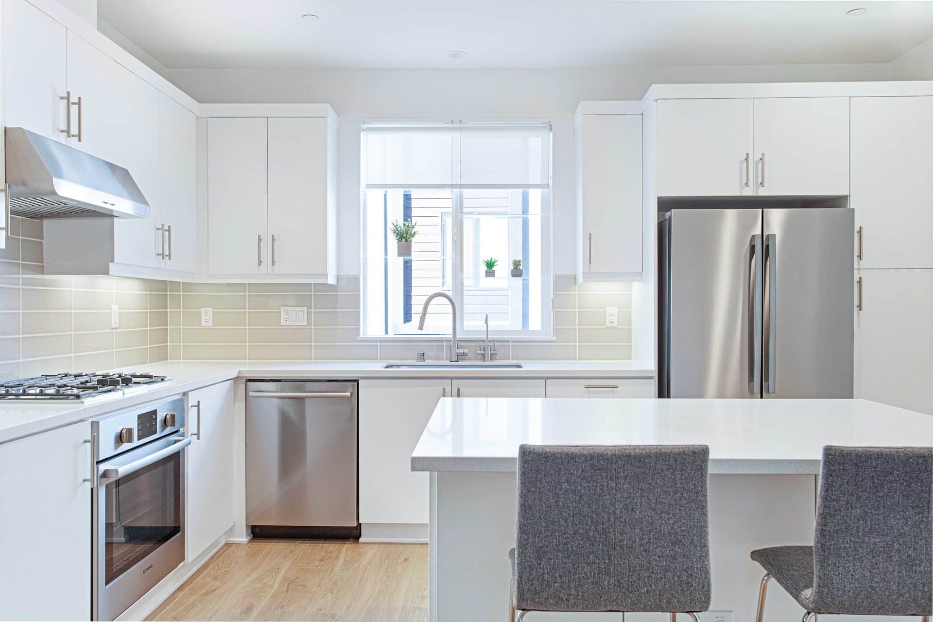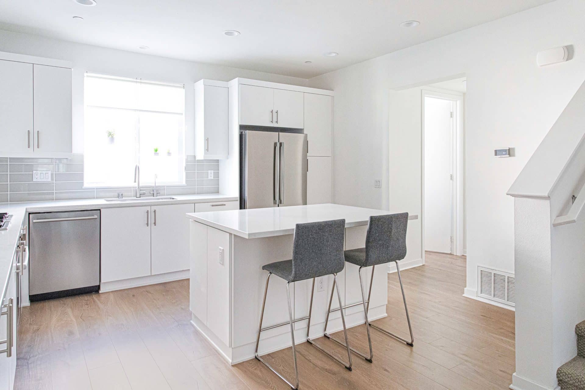 Head up the stairs to the open-concept living room, dining room, powder room and sprawling chef’s kitchen! Stainless steel Bosch appliances, quartz countertops and island seating make the perfect place for entertaining friends or enjoying a cozy holiday meal with family.