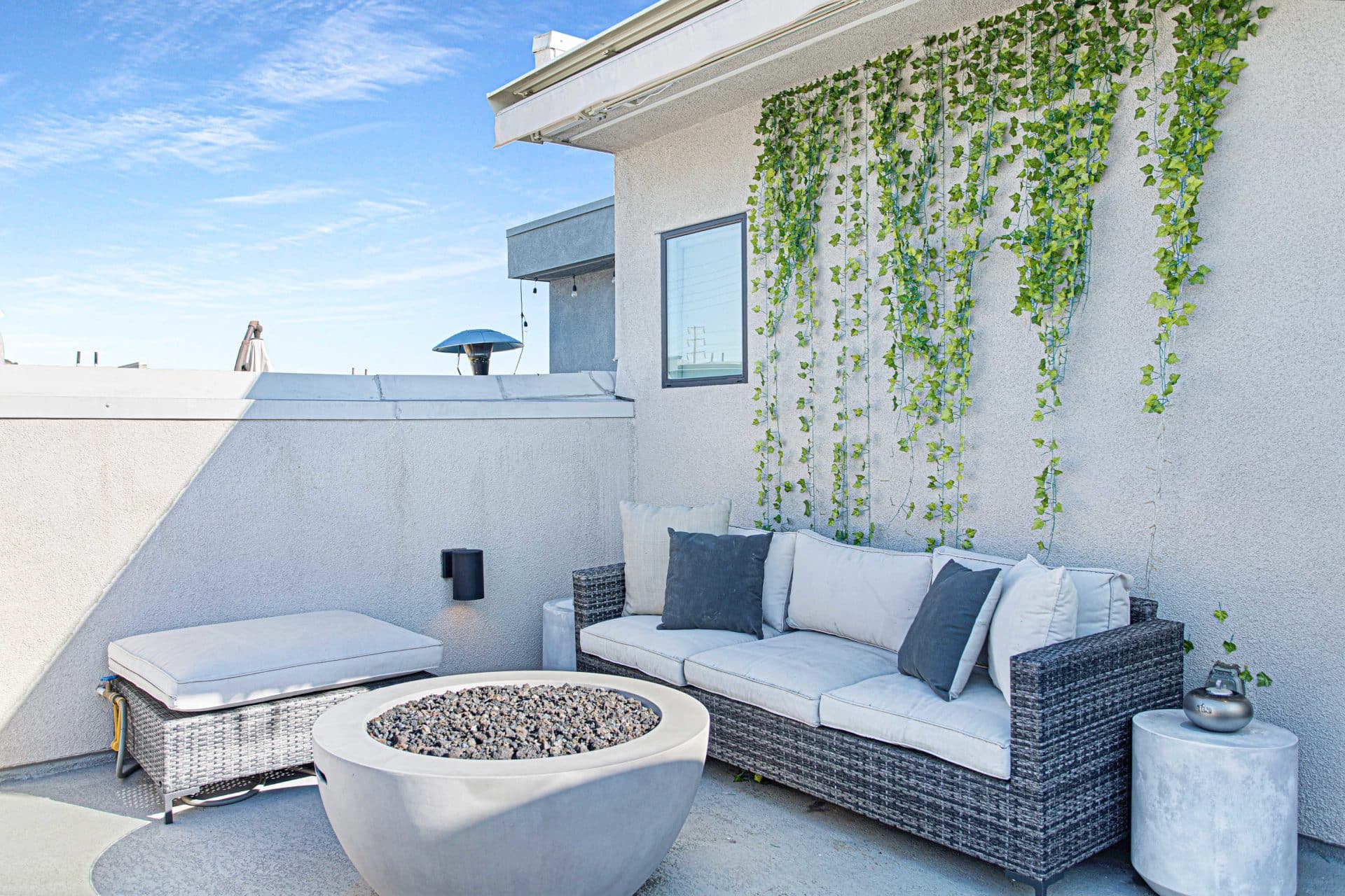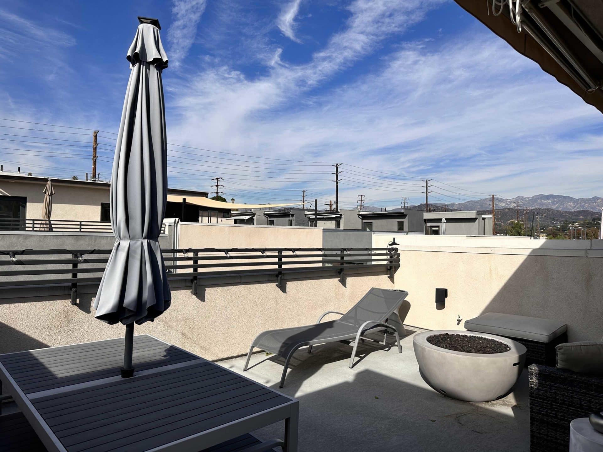 Enjoy quintessential cotton candy LA sunsets from the spectacular rooftop deck! Complete with inviting gas fire pit, BBQ, roomy dining table with umbrella, romantic string lights, plenty of seating, retractable awning for shade, and sweeping, stunning views of the San Gabriel Mountains, you’ll never want to come back inside! Pinch yourself, you’re not dreaming!