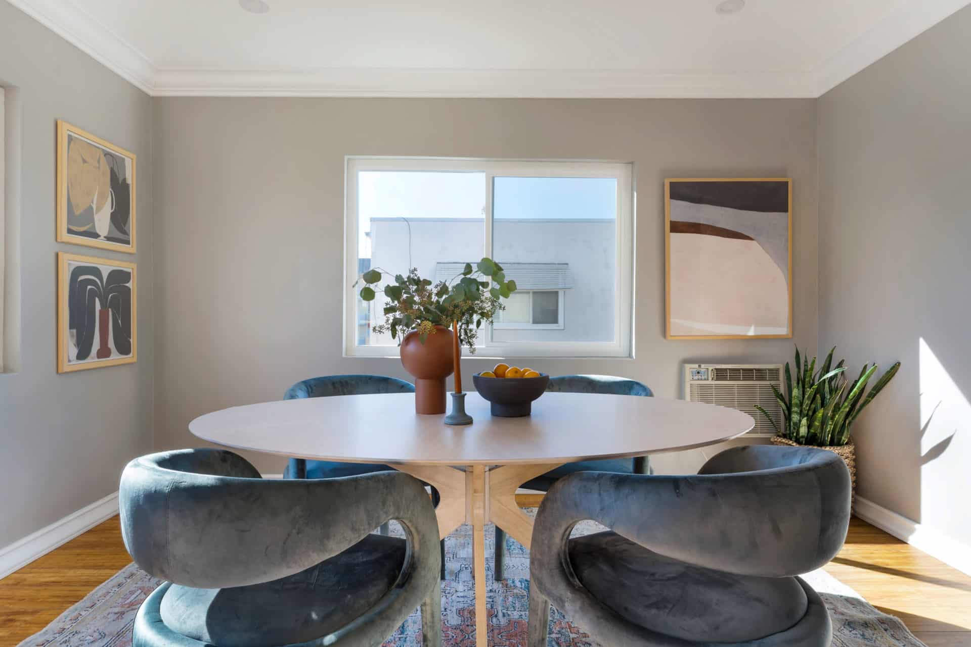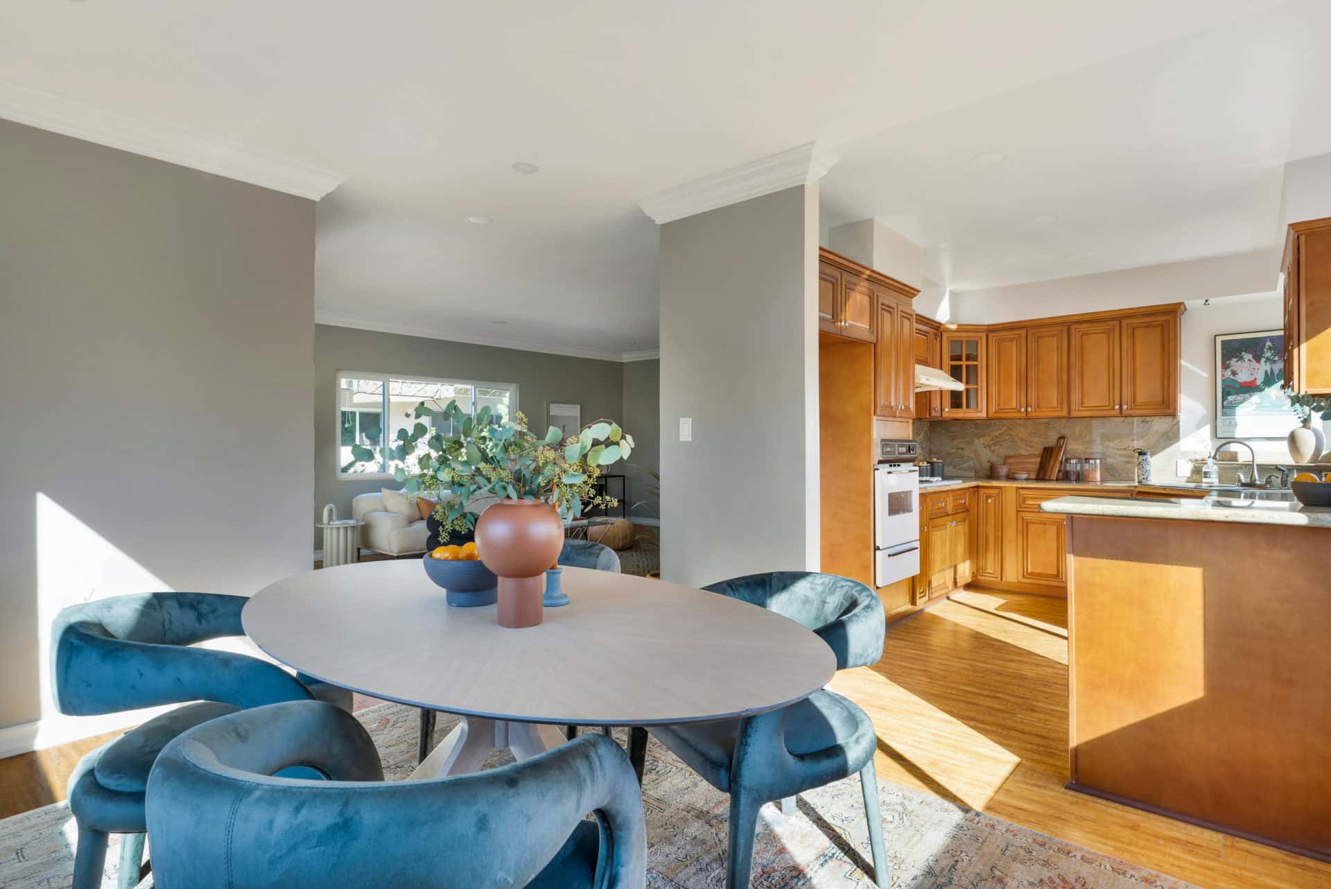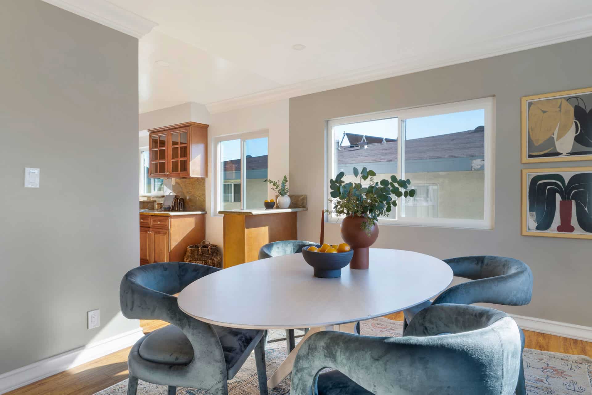 Off of the living room, the dining room awaits upcoming holiday gatherings. Catch the sunset peering through as you sit through an evening meal.