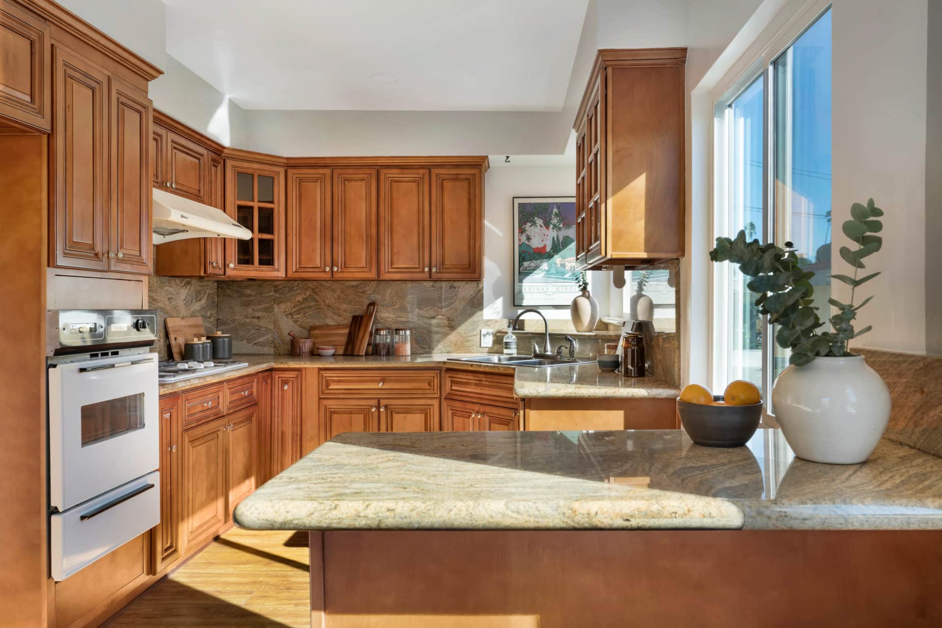 The cozy kitchen features custom cabinetry and stone countertops. Move and cook with ease. Prepare breakfast soaked in the morning light coming through the kitchen windows. Bar top seating off the peninsula.