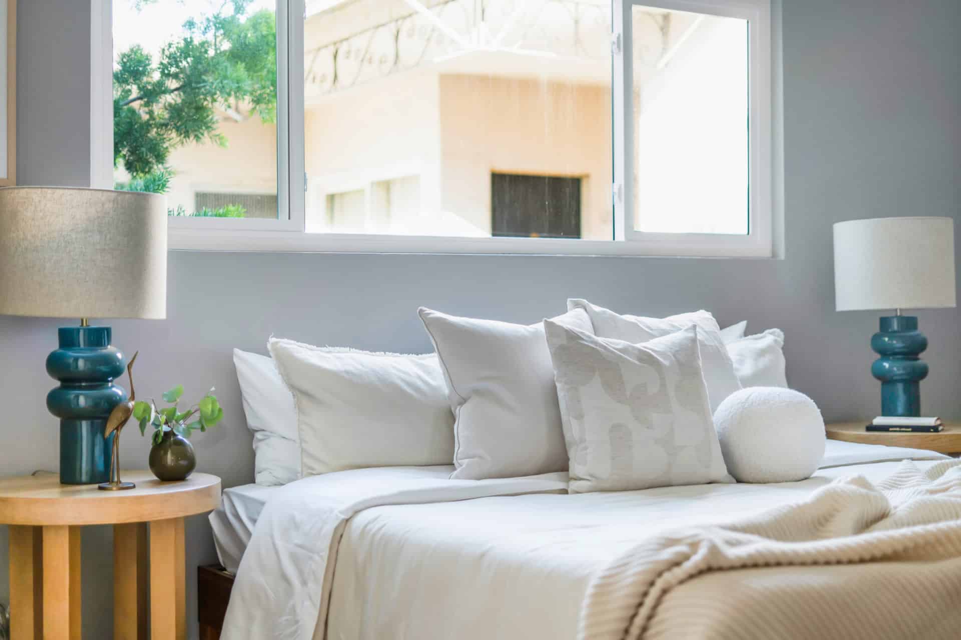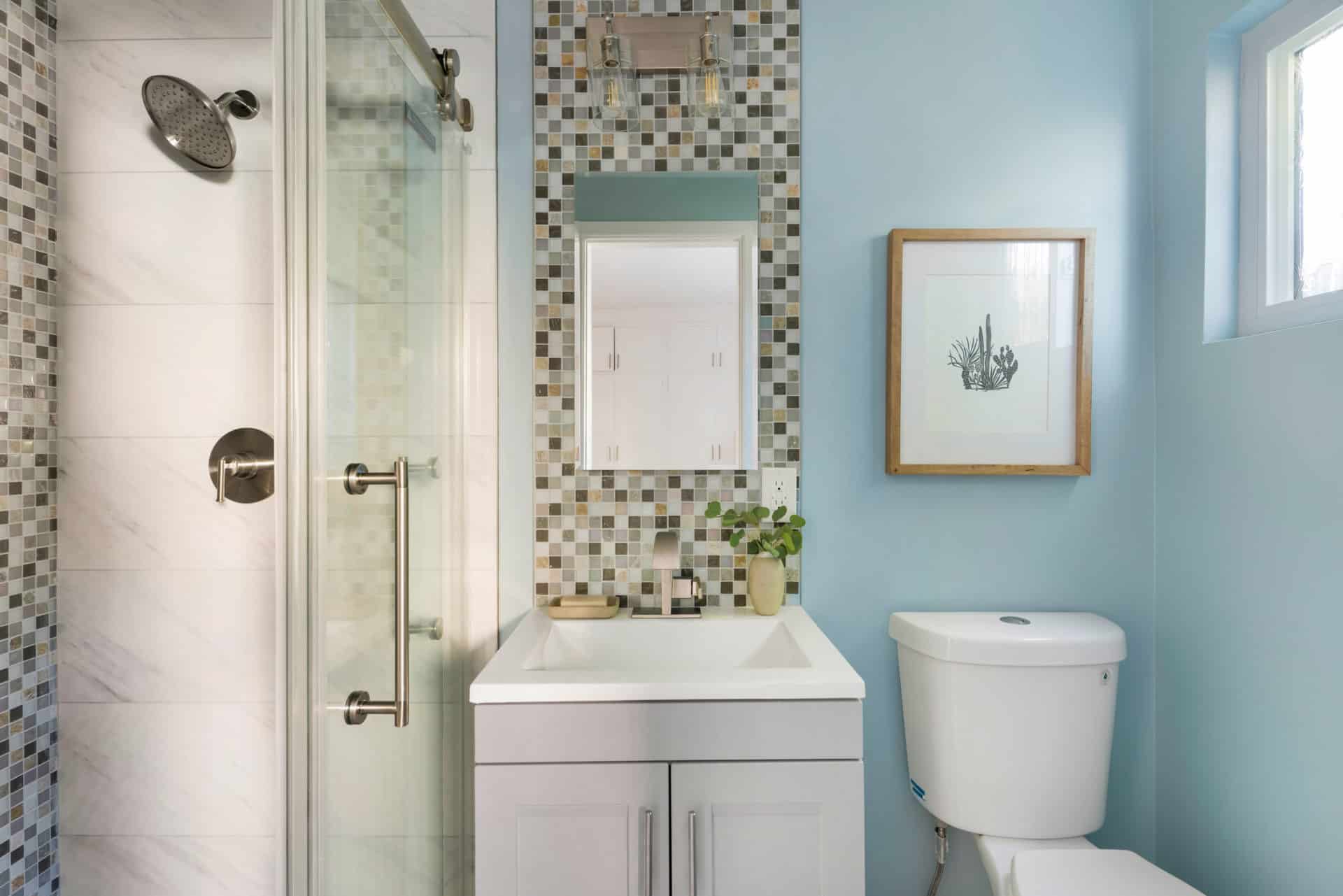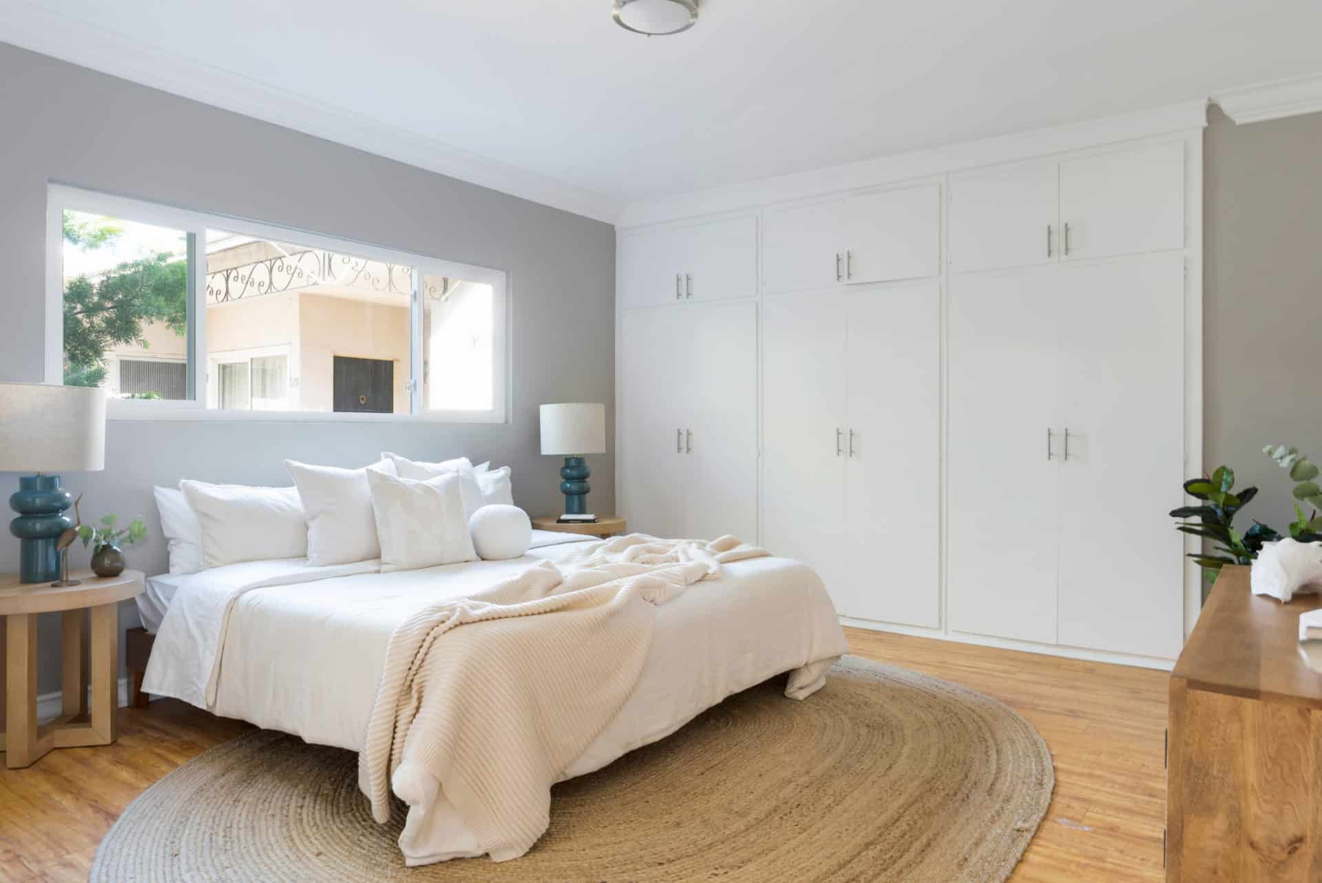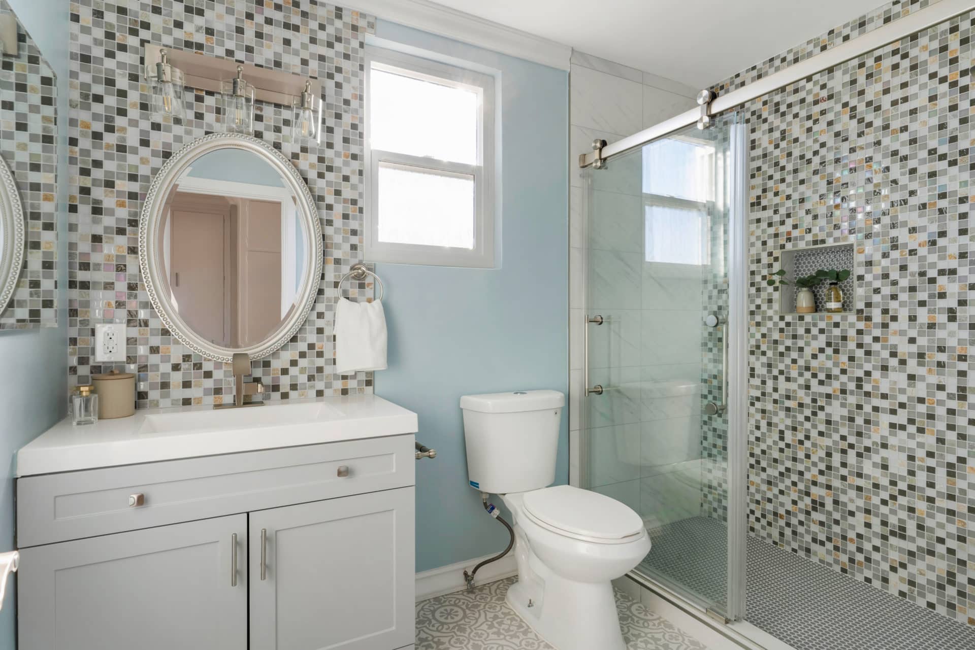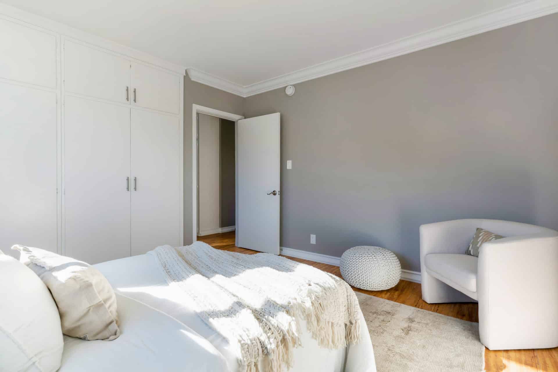 Make your way past the hallway’s ample storage and enter into two dreamy bedrooms with large closet spaces including a primary suite with a renovated designer bathroom offering a free standing shower with tile surround and single vanity.