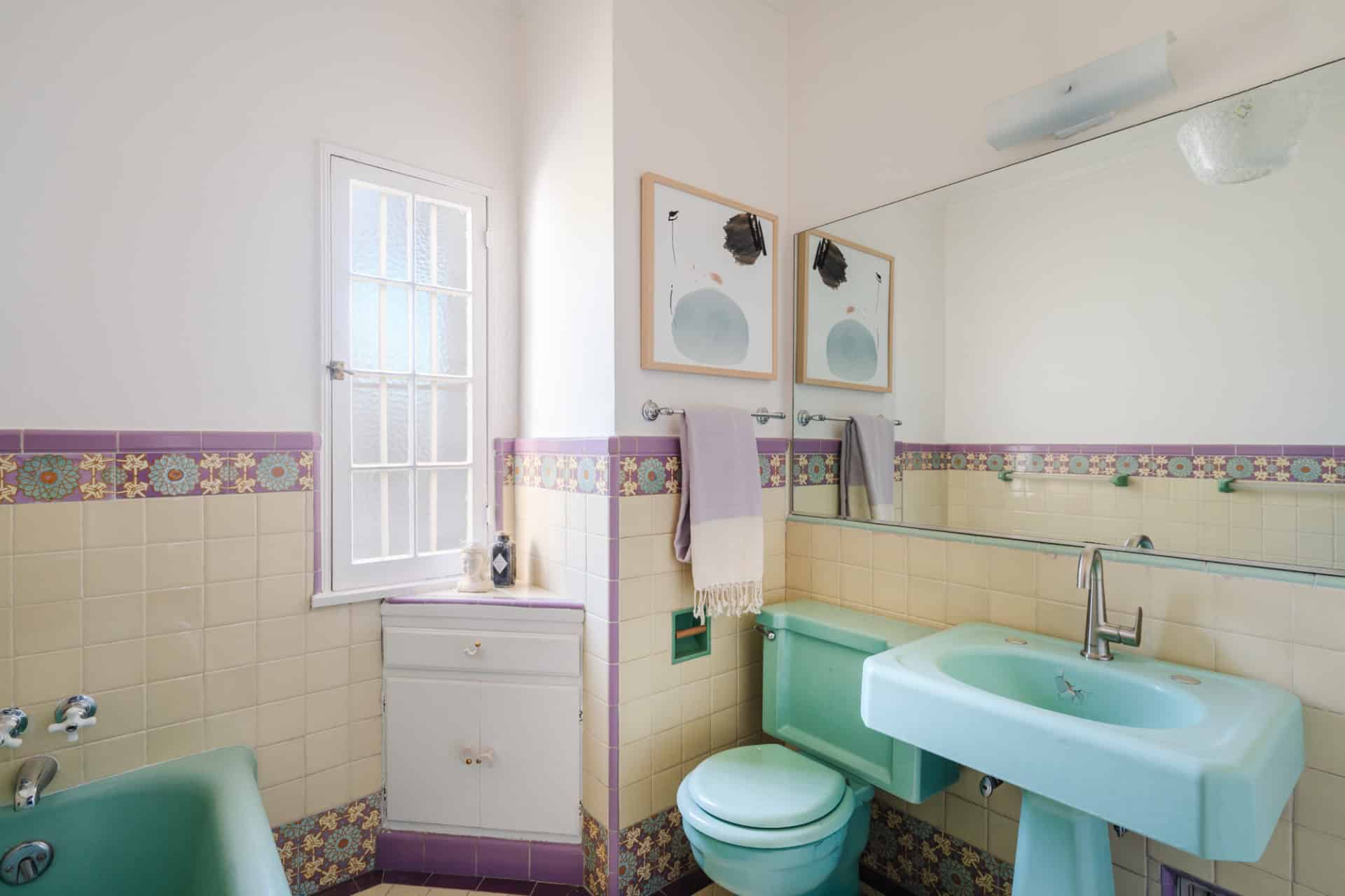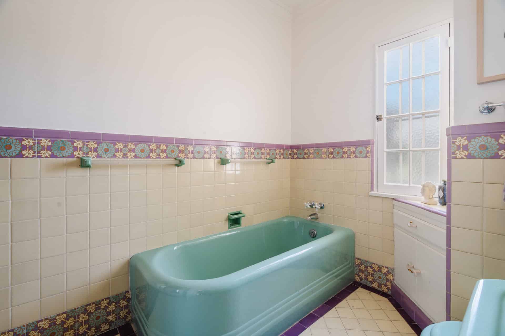 The large bathroom features a walk-in shower and original yellow and purple tile work with a matching green bathtub, toilet, and sink.