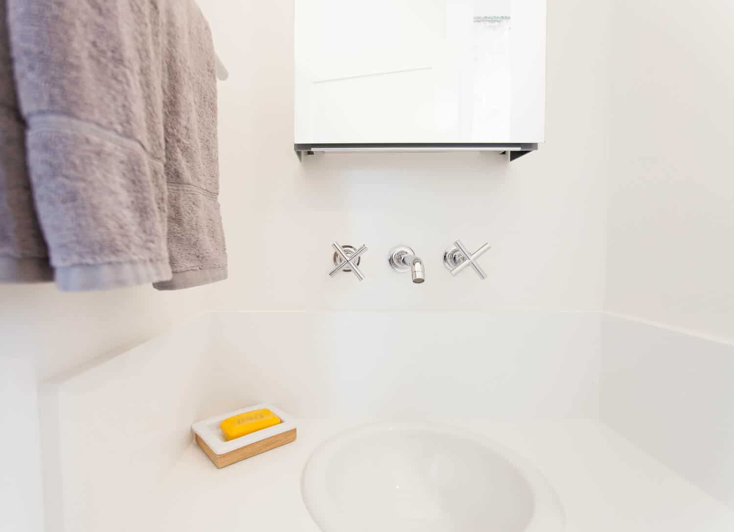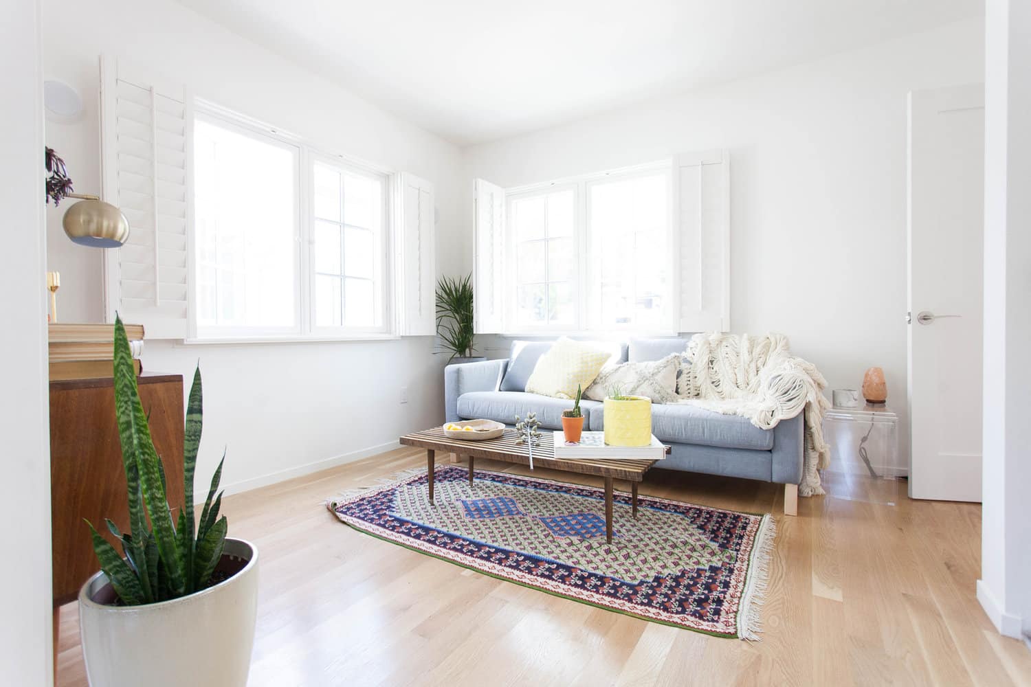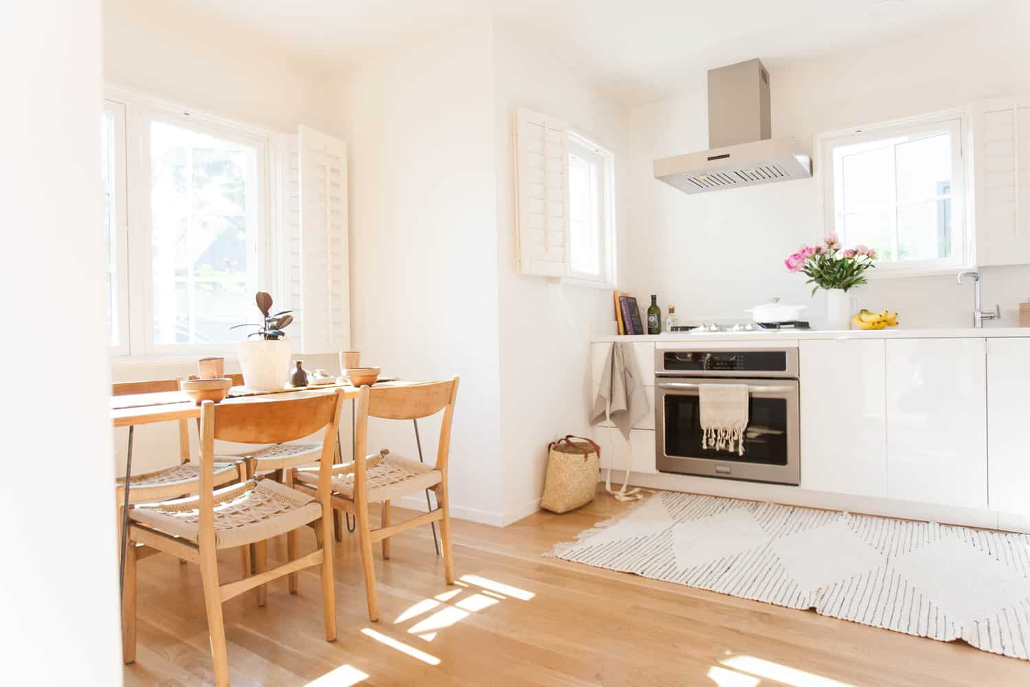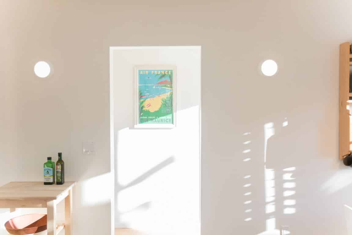 Solid oak floors, wood casement windows, and fresh white walls create a tranquil and bright space throughout.