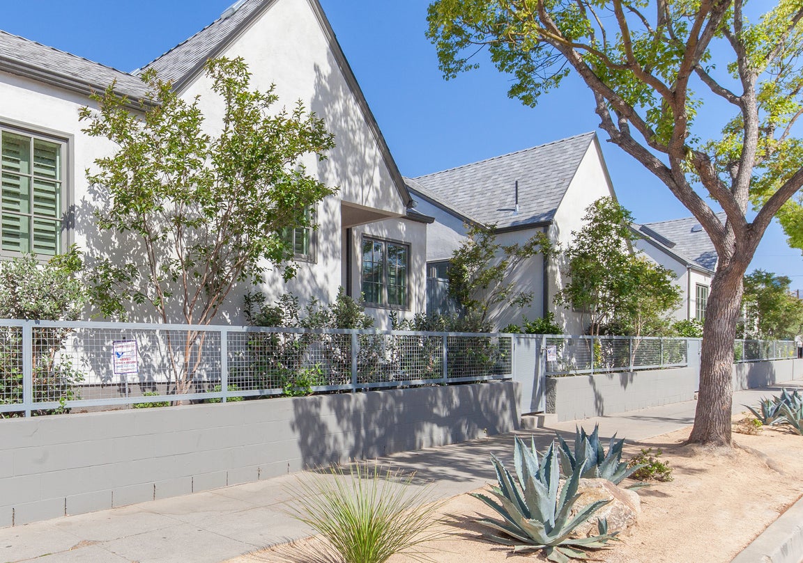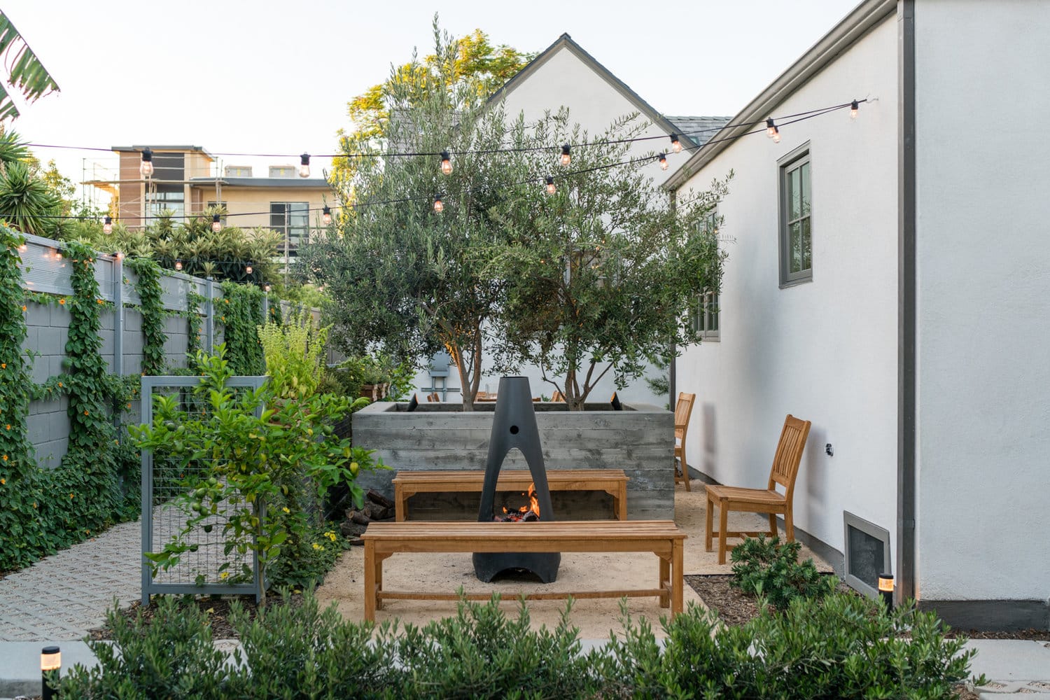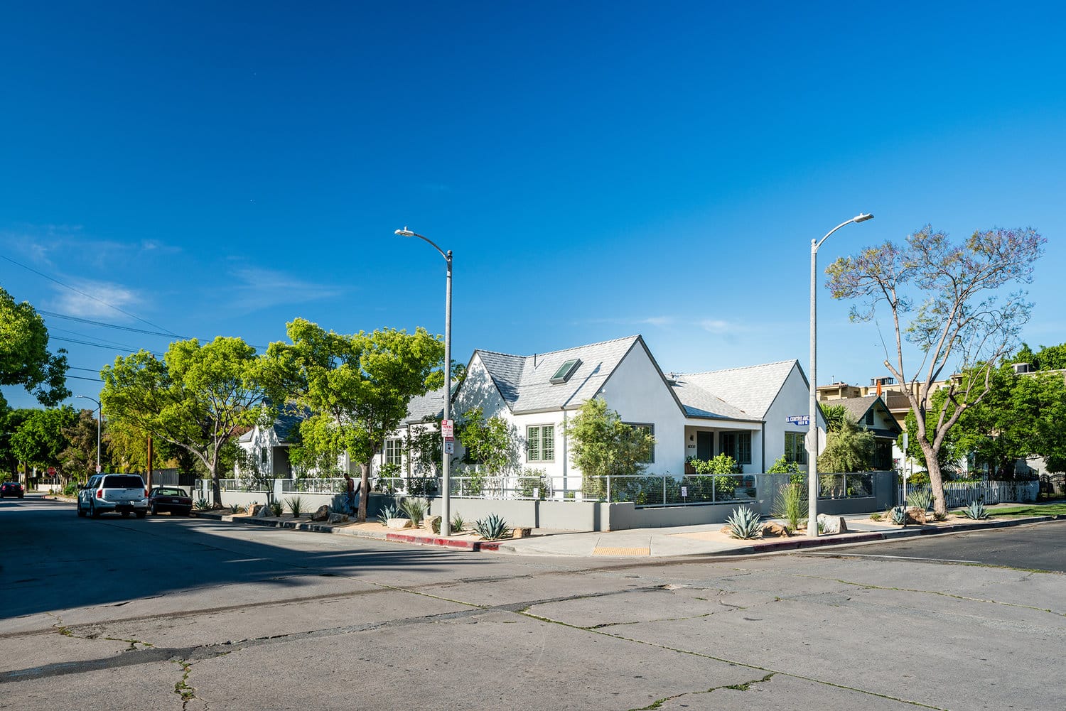 Drought tolerant landscaping alongside mature olive and citrus trees creates a private oasis at the rapidly developing heart of urban Los Angeles.