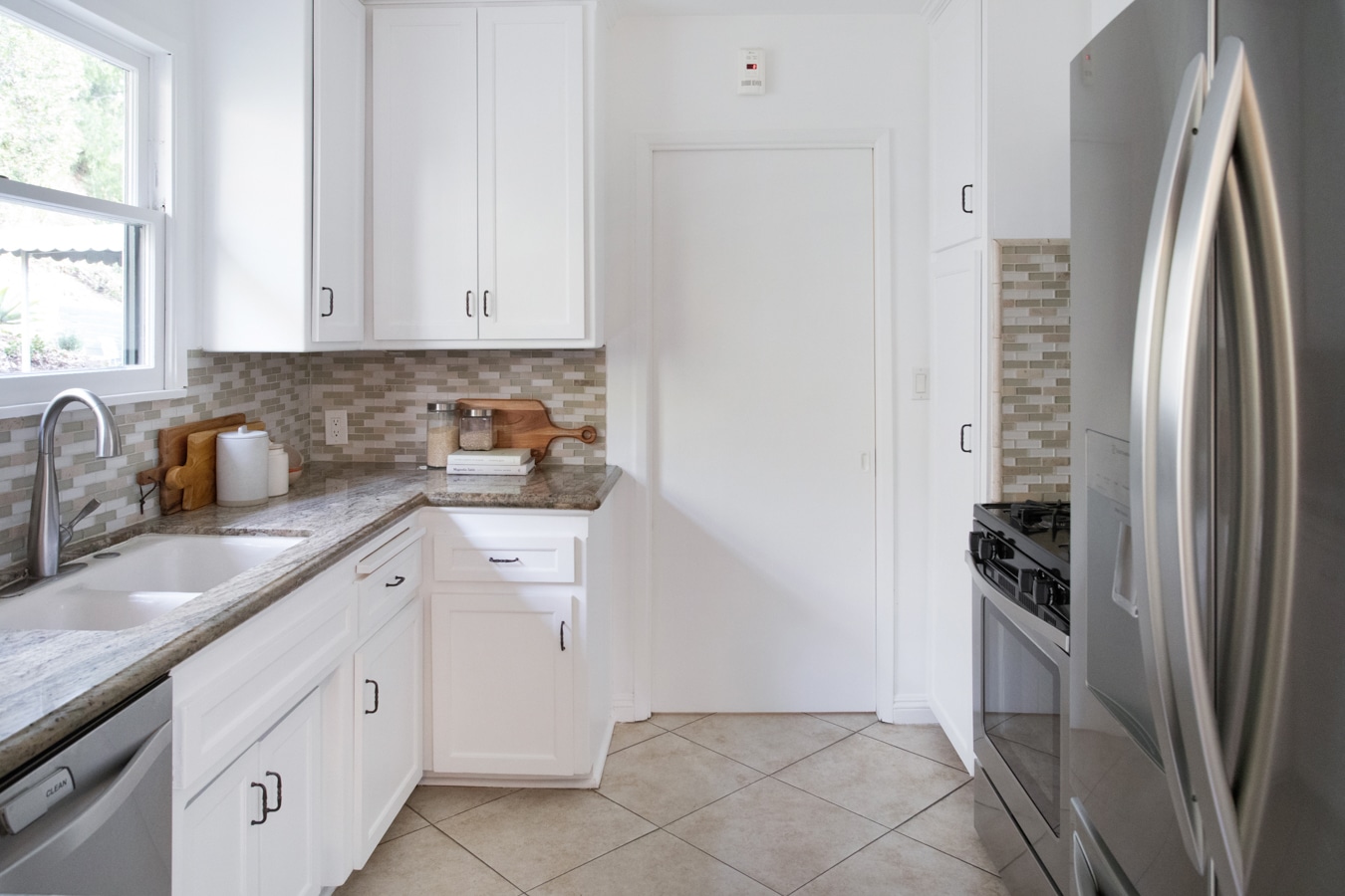 Refreshed galley kitchen which leads to private laundry room behind a pocket door.
