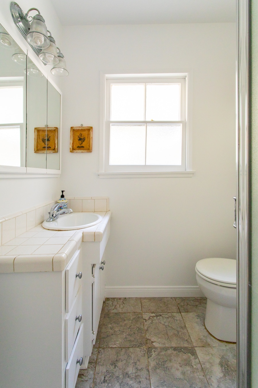 Bathroom #2 features a shower, toilet and vanity with lovely natural light.