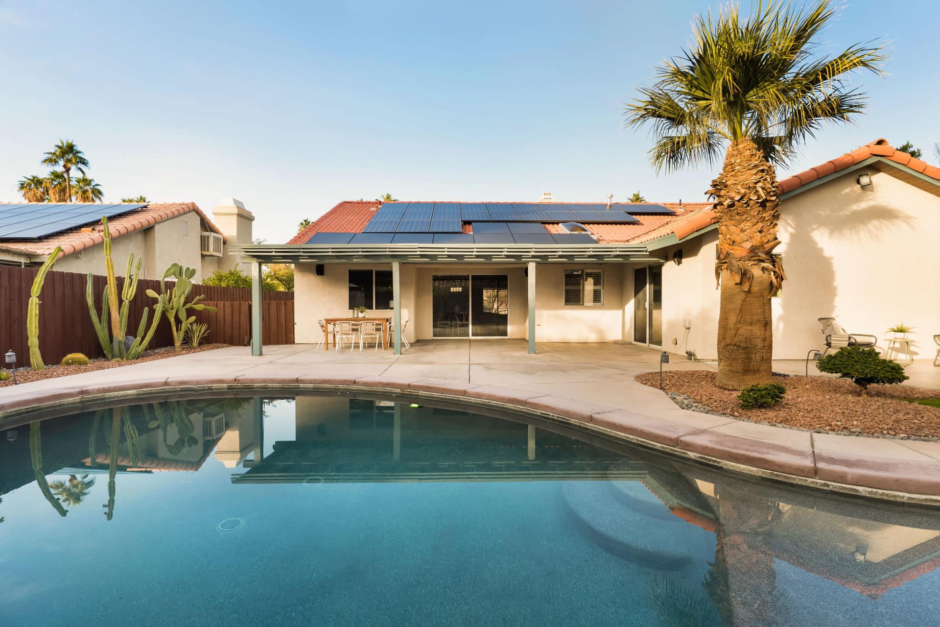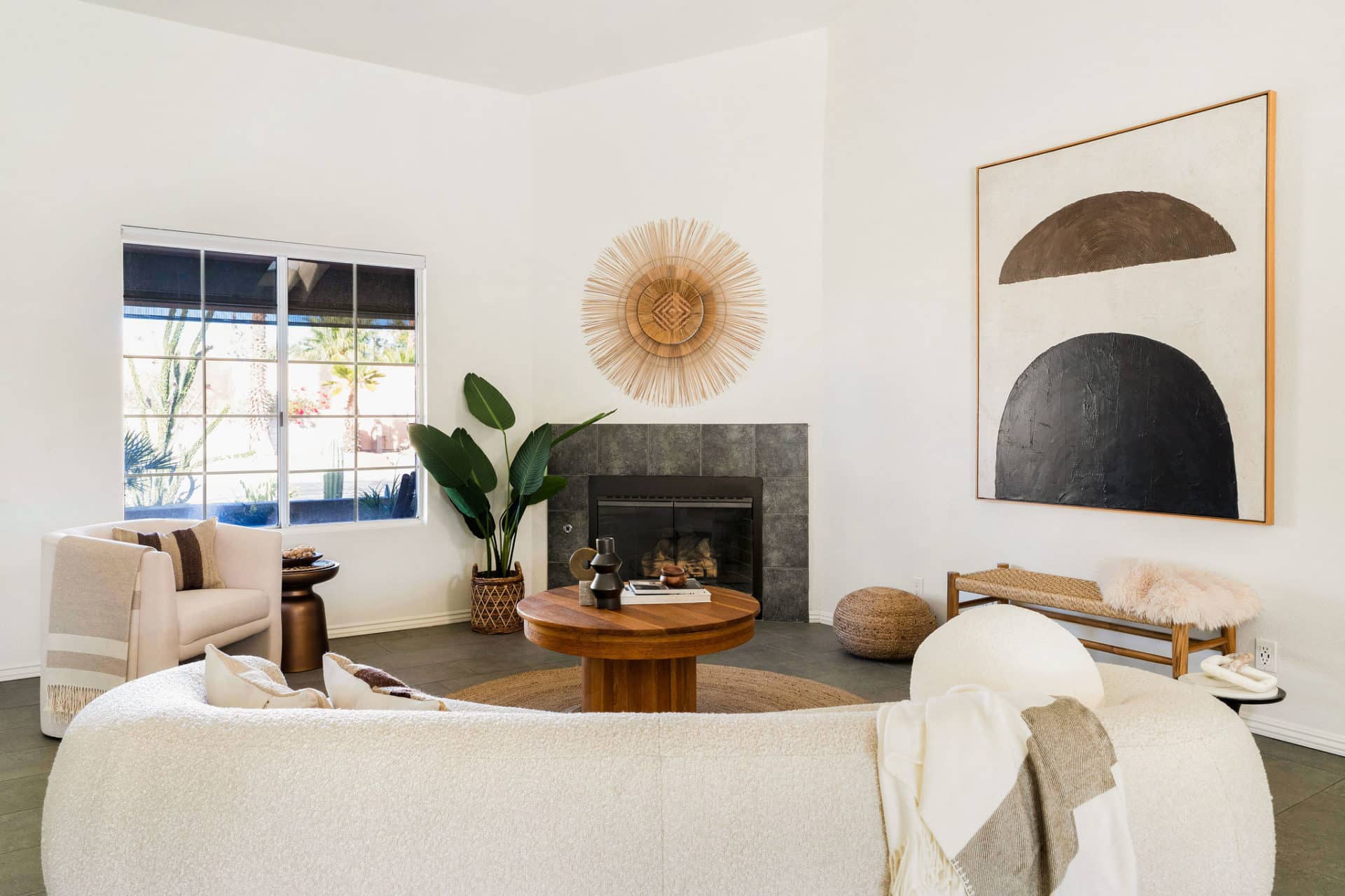 Cozy up to the fireplace on cool desert evenings in your oversized living room. Ample dining room with sexy sputnik designer lighting opens via sliders to the inviting pool and grassy yard. Lush landscaping includes mandarin, grapefruit and lime trees and a 30-year-old Washingtonian Palm!