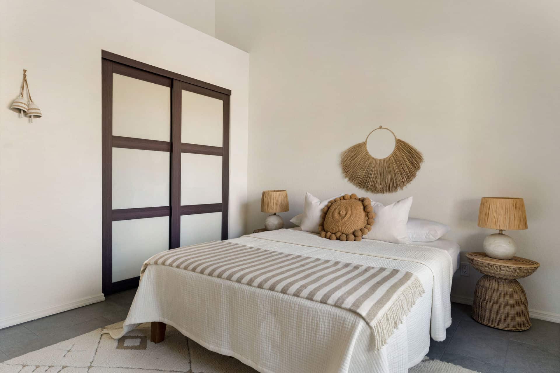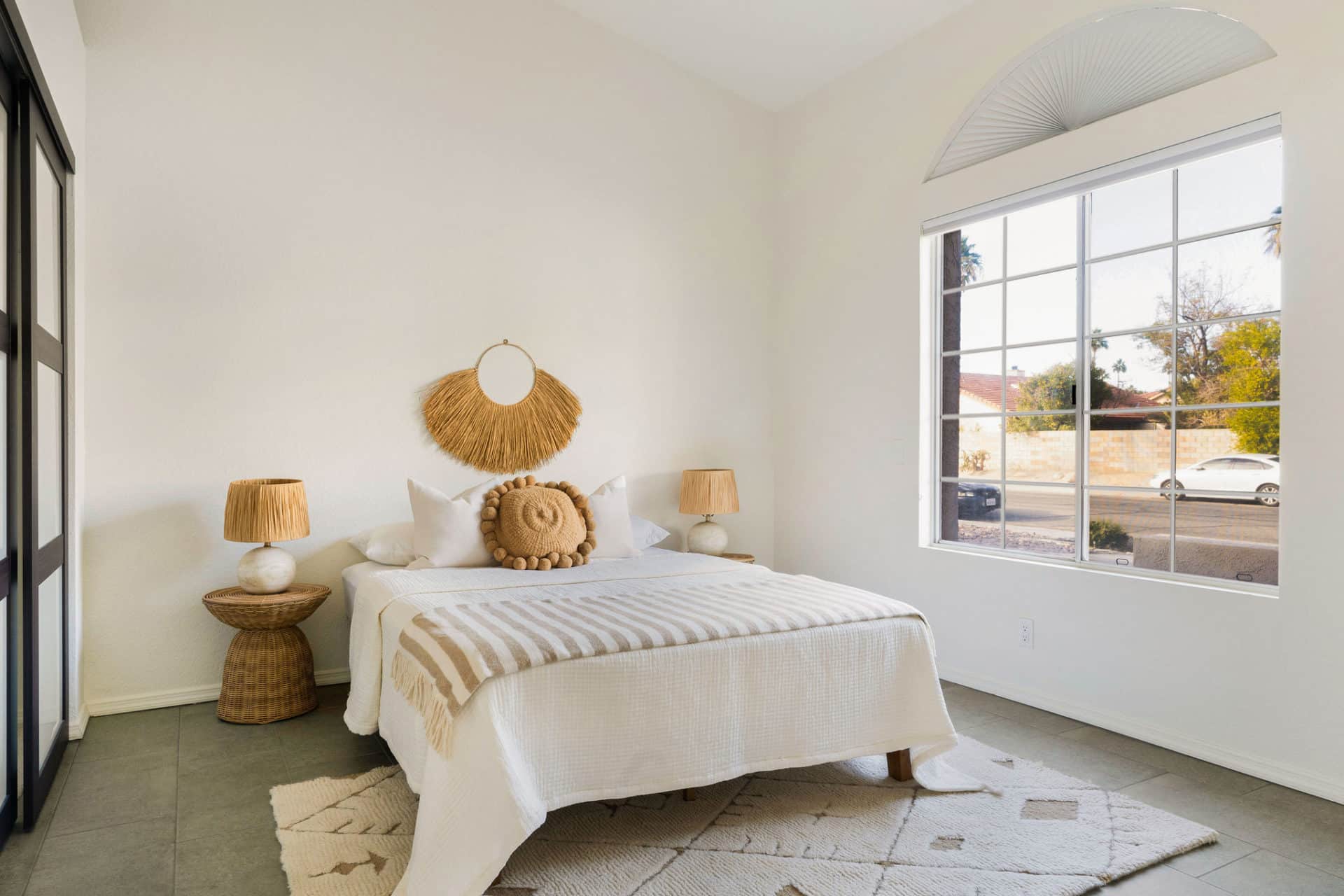 To the master! A fun and funky master suite provides an updated bathroom with dual vanity, new lighting, tile, and paint, plus a large bedroom, tons of closet space, and an attached bonus studio with new sliding barn door access, which can be your gym, Zoom studio, new office, and more! Featuring designer wallpaper and sliding door access to the pool area, the bonus room is where the party’s at!
