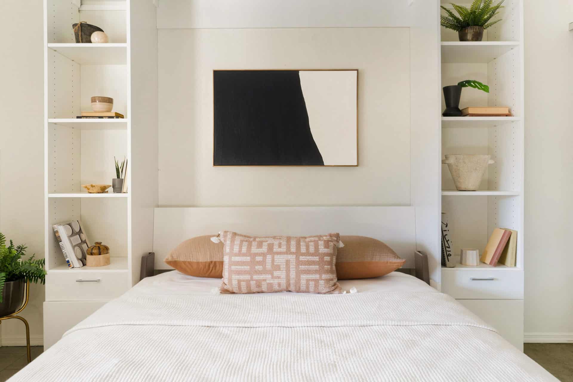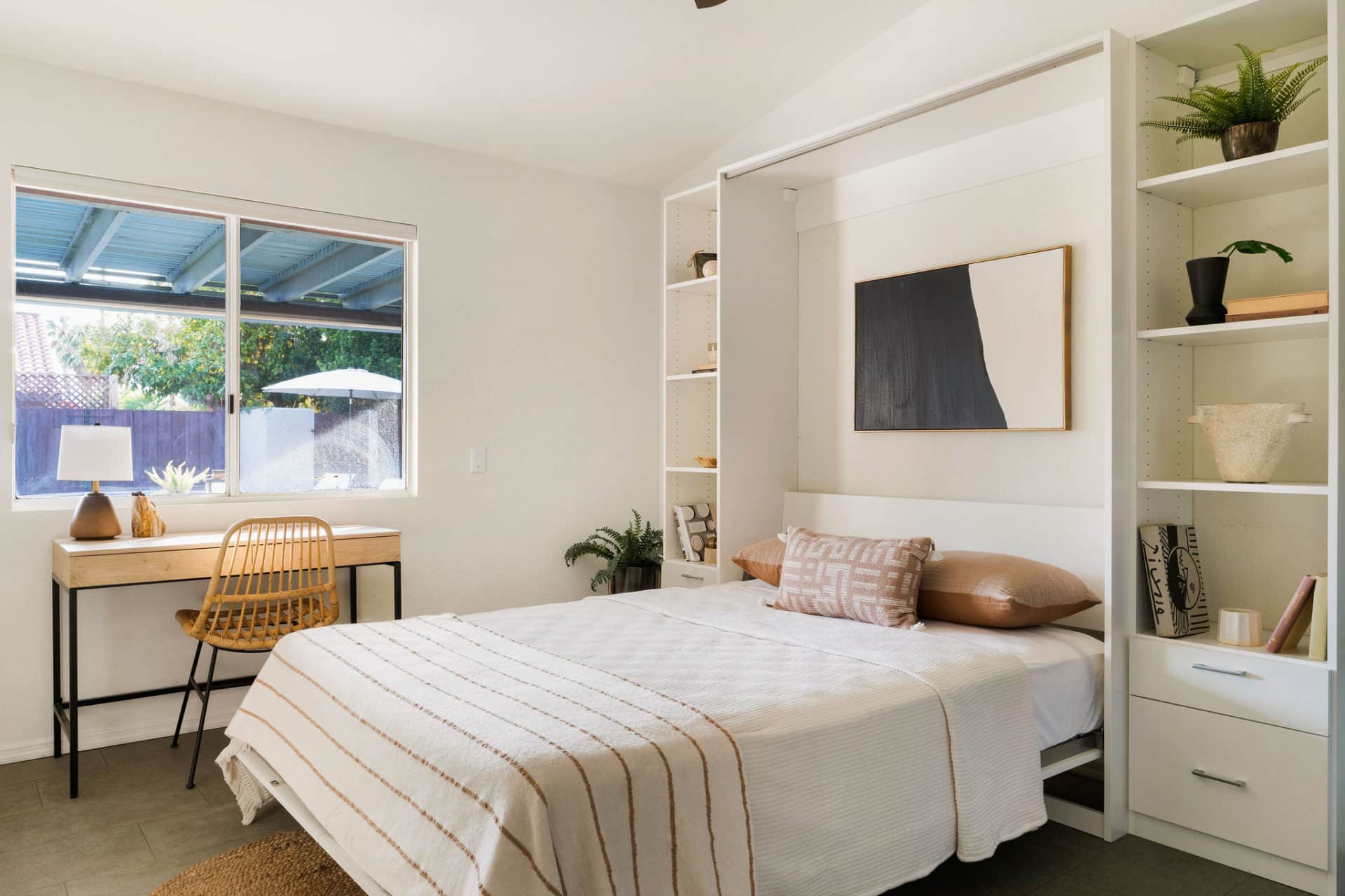 Two guest bedrooms provide plenty of space and privacy, with one boasting a custom California Closets Wall Bed which conveniently tucks away for flexible use. The alternate bedroom at the front is a good size, with plenty of closet space. Both share a hall bath with updated fixtures and lighting and shower over tub.