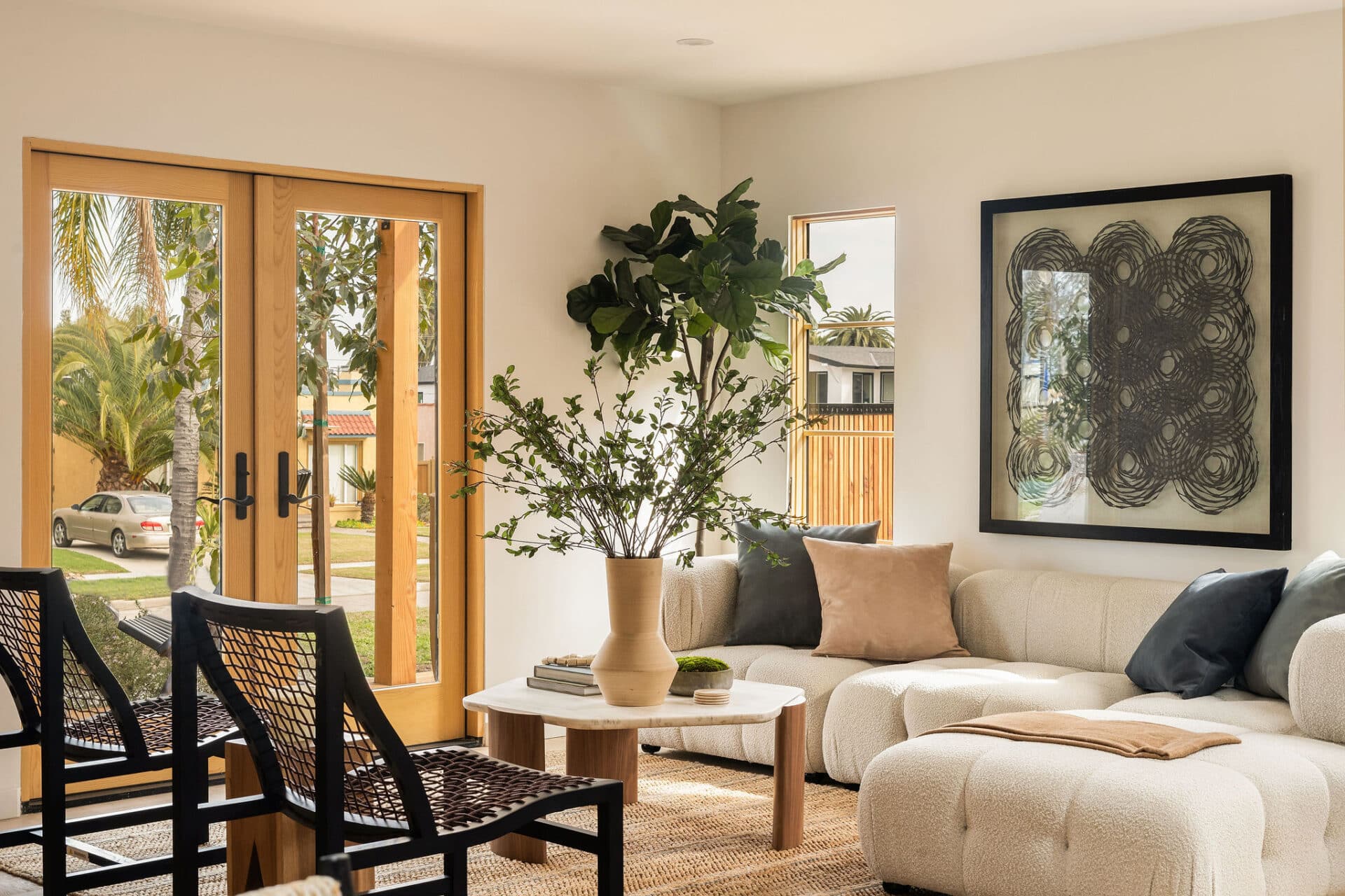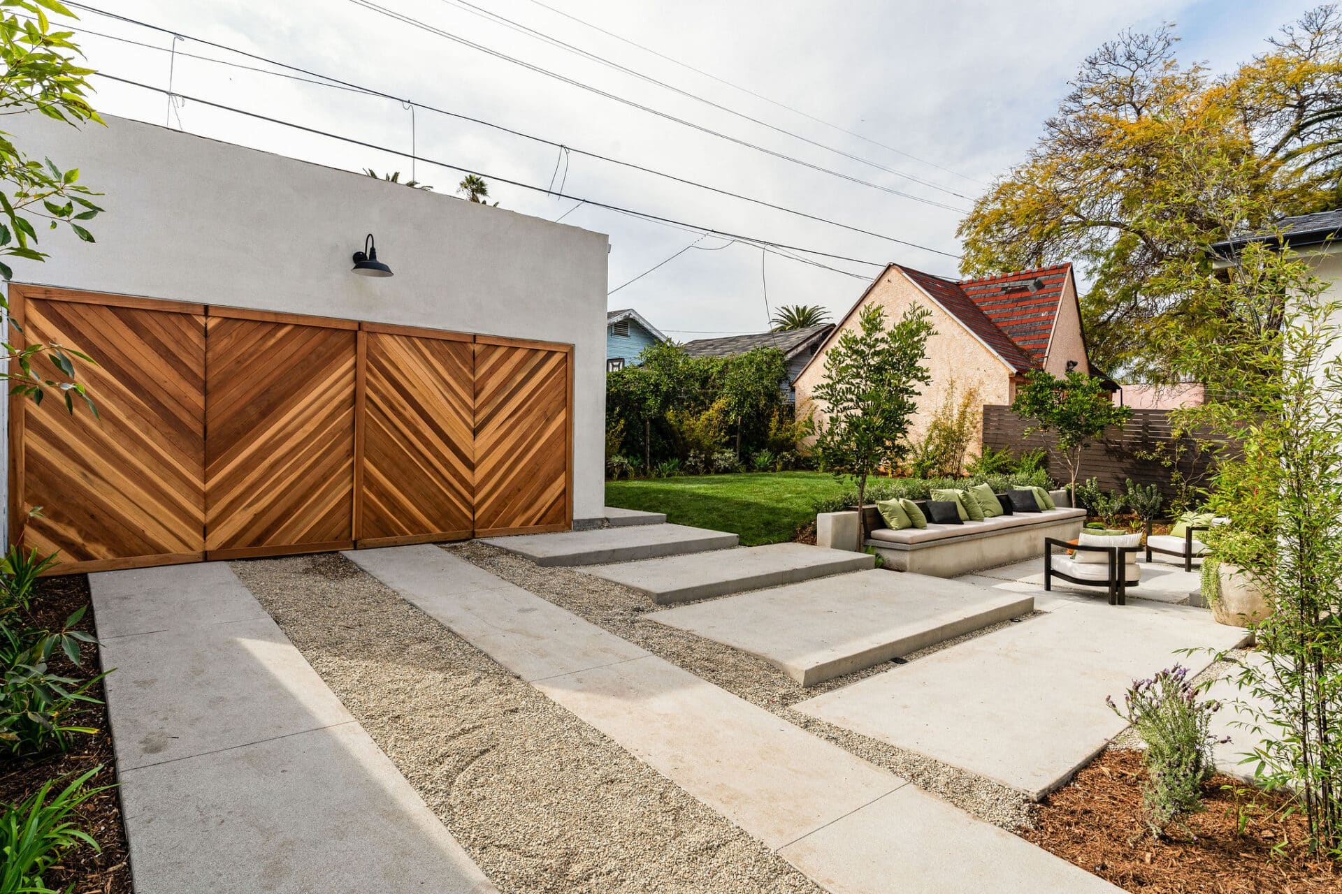 Sliding doors lead to the backyard dreams of which dreams are made. The garage is a brand-new build, with barn doors door detail and French doors to the entertainer’s terraced yard with built-in stone seating for dining under the stars.