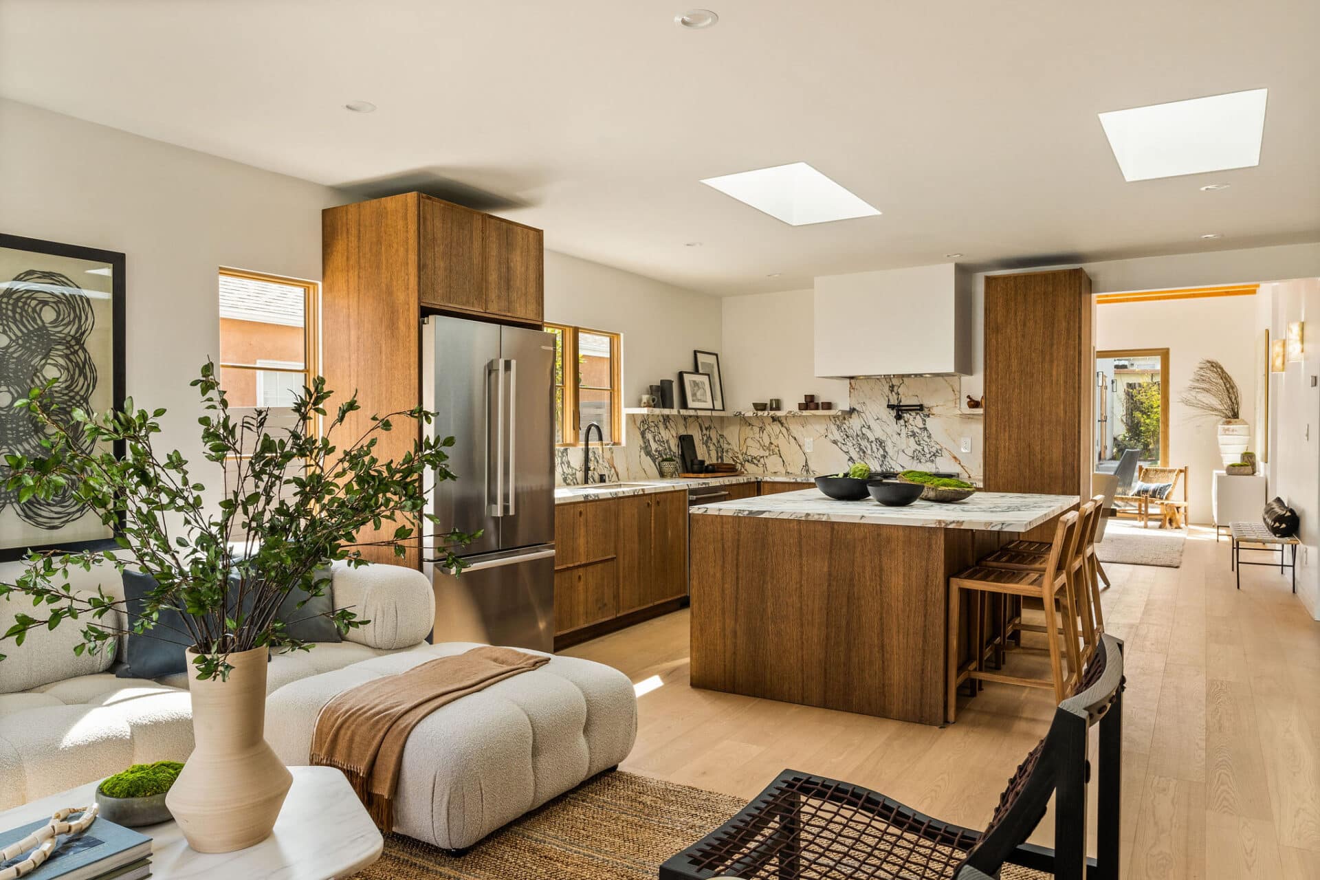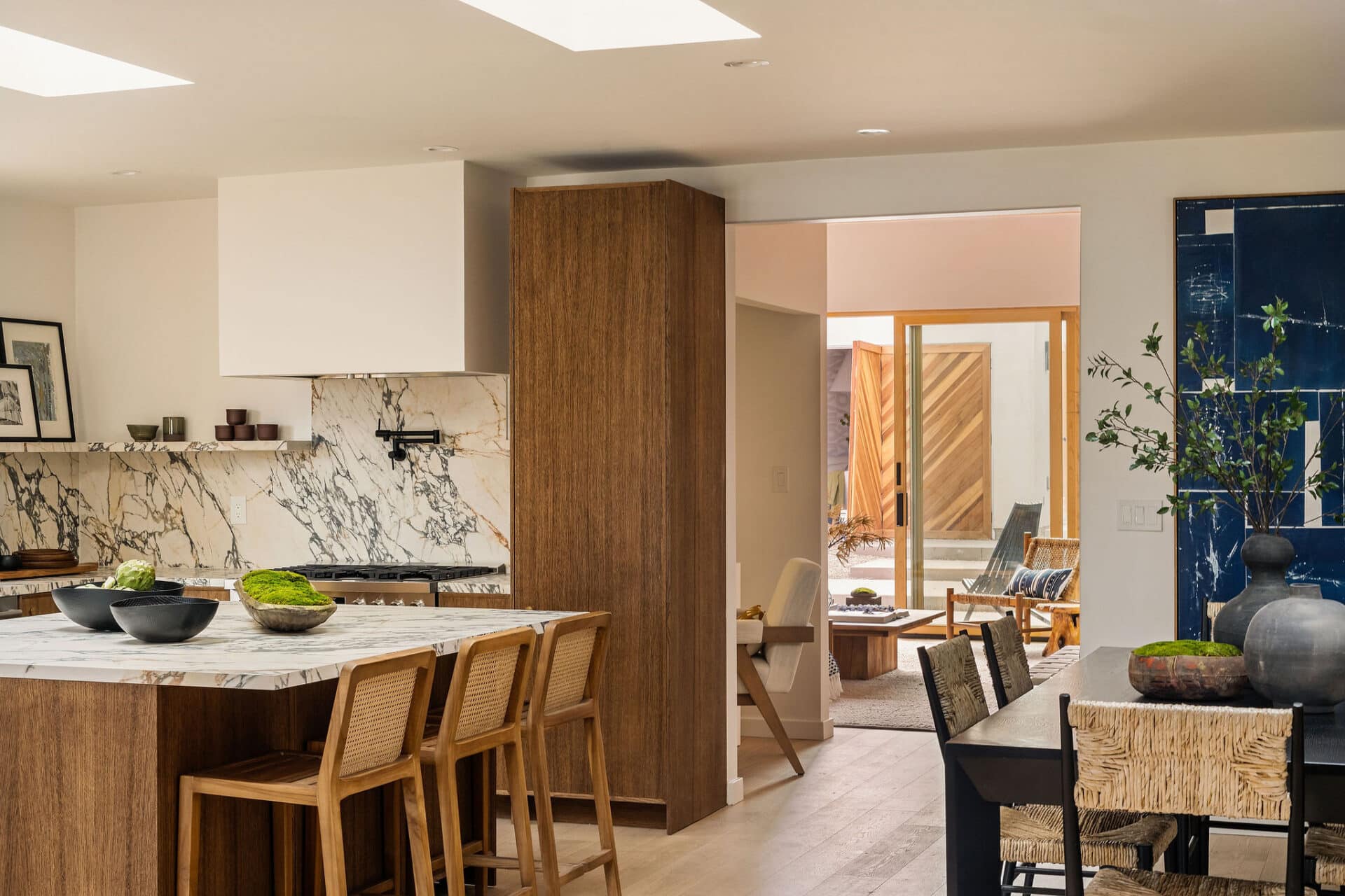 Immaculate custom wood cabinetry by reform showcases the open chef’s kitchen with dramatic porcelain stone counters and backsplash. An oversized island offers additional storage space and is the centerpiece of this space. The large, airy family room with vaulted ceilings and exposed beams is complemented by moody designer sconces.