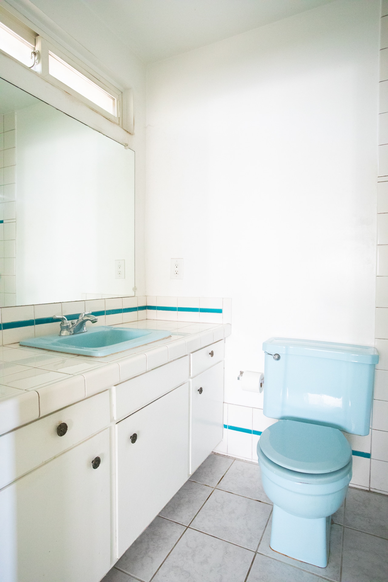 Powder your nose in the powder blue powder room with charming original built-in laundry box.