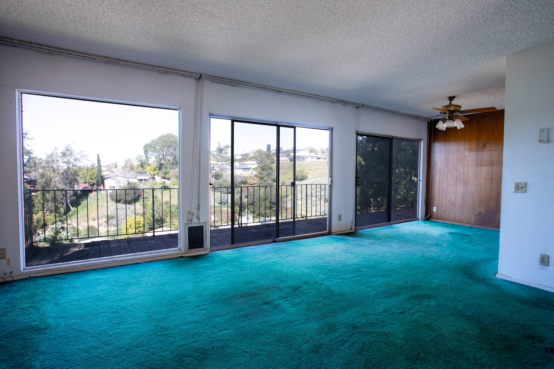 The living room is a true work of 1960’s art, with floor-to-ceiling wood paneled walls, sliding glass doors that let in the light and give you a panoramic view of the outdoors.