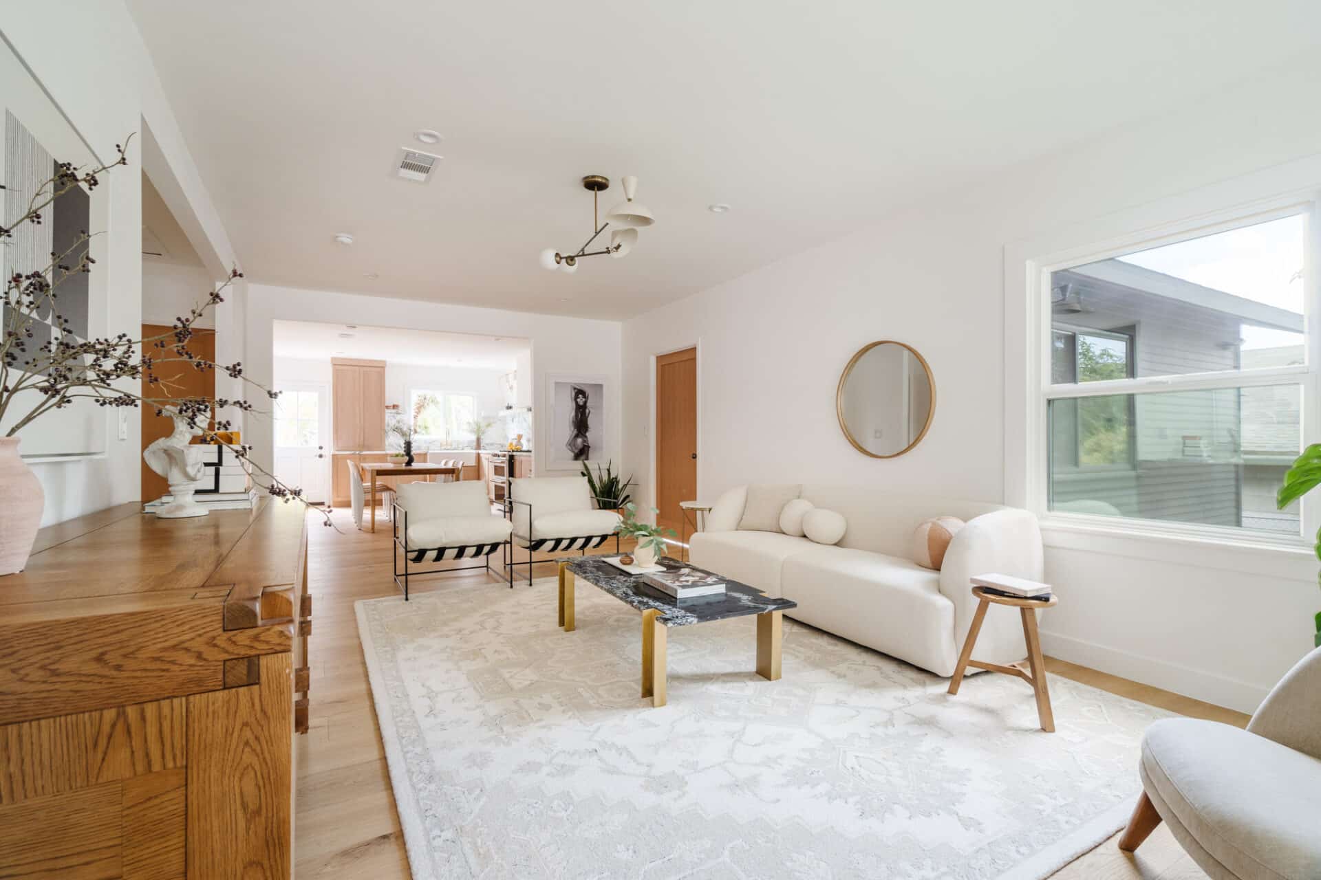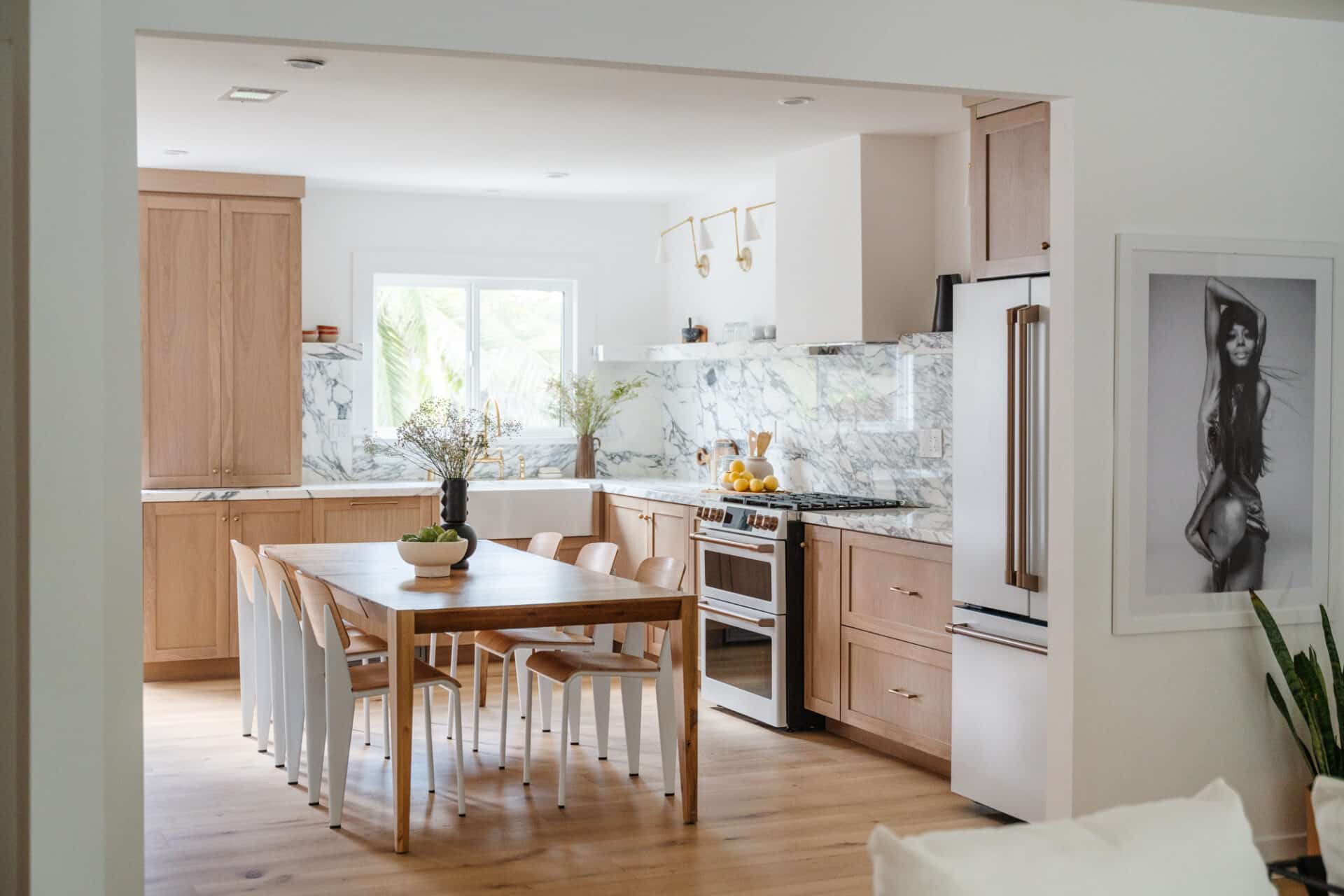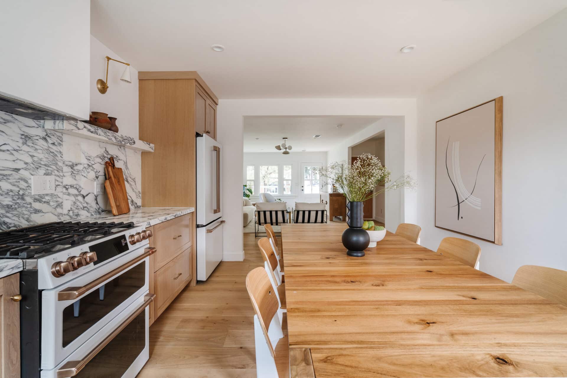 Inside, new oak floors and an open light-filled layout lead you from spacious living into dining + a magazine-worthy chef’s kitchen with dramatic Calacatta countertops + ledged backsplash, GE Café line appliances, beautiful brass faucet + farmhouse sink, and custom oak cabinets.