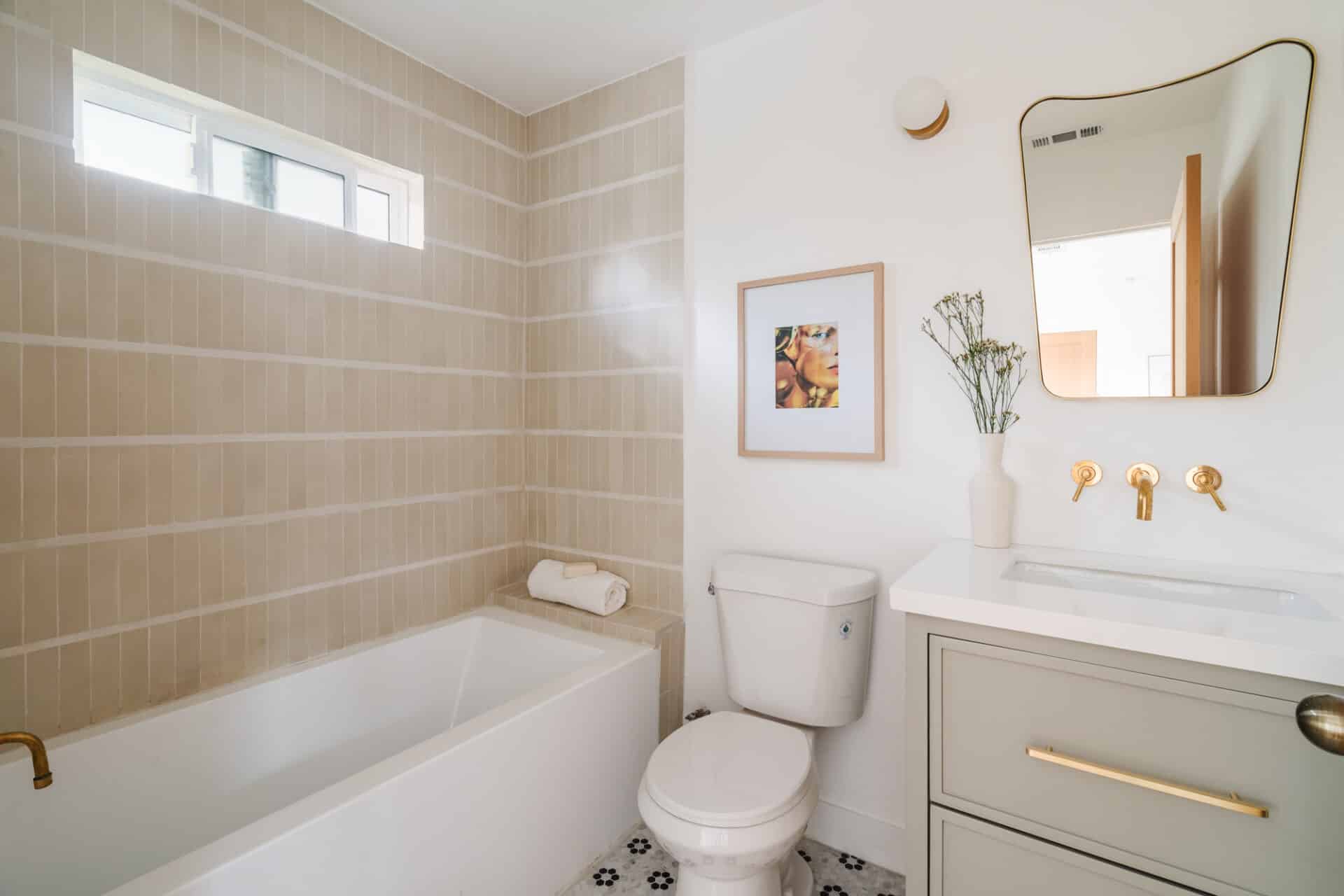 Home boasts 3 bedrooms, including a dreamy primary suite with direct access to patio + yard, and a stylish bathroom with Zia tile shower, brass fixtures, and Carrera White hex floor tile. Hall bath keeps the design vibes going with Zia tile shower, brass fixtures and stunning deep emerald Bedrosian tile floors. Designer light fixtures crown the inspired spaces throughout.