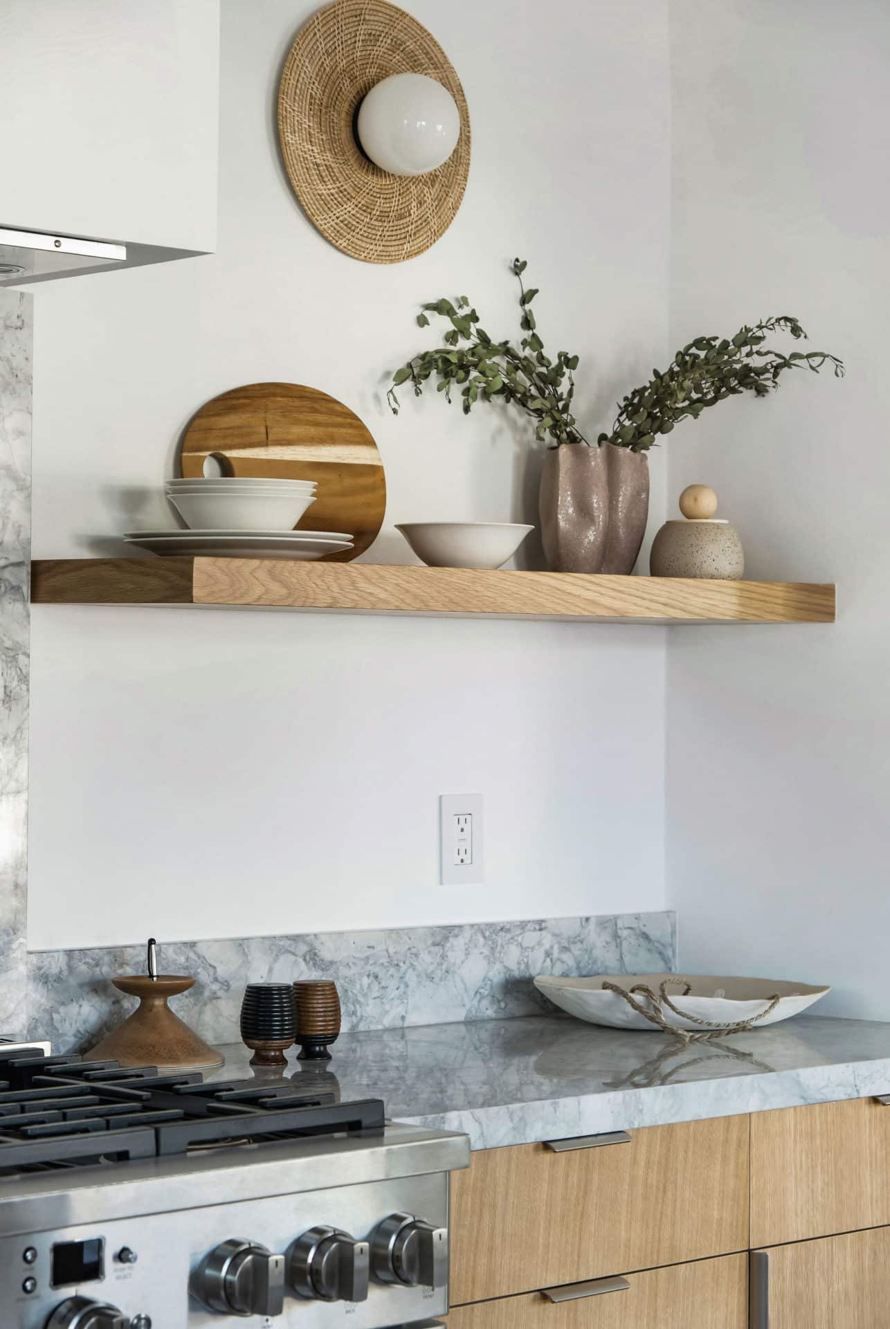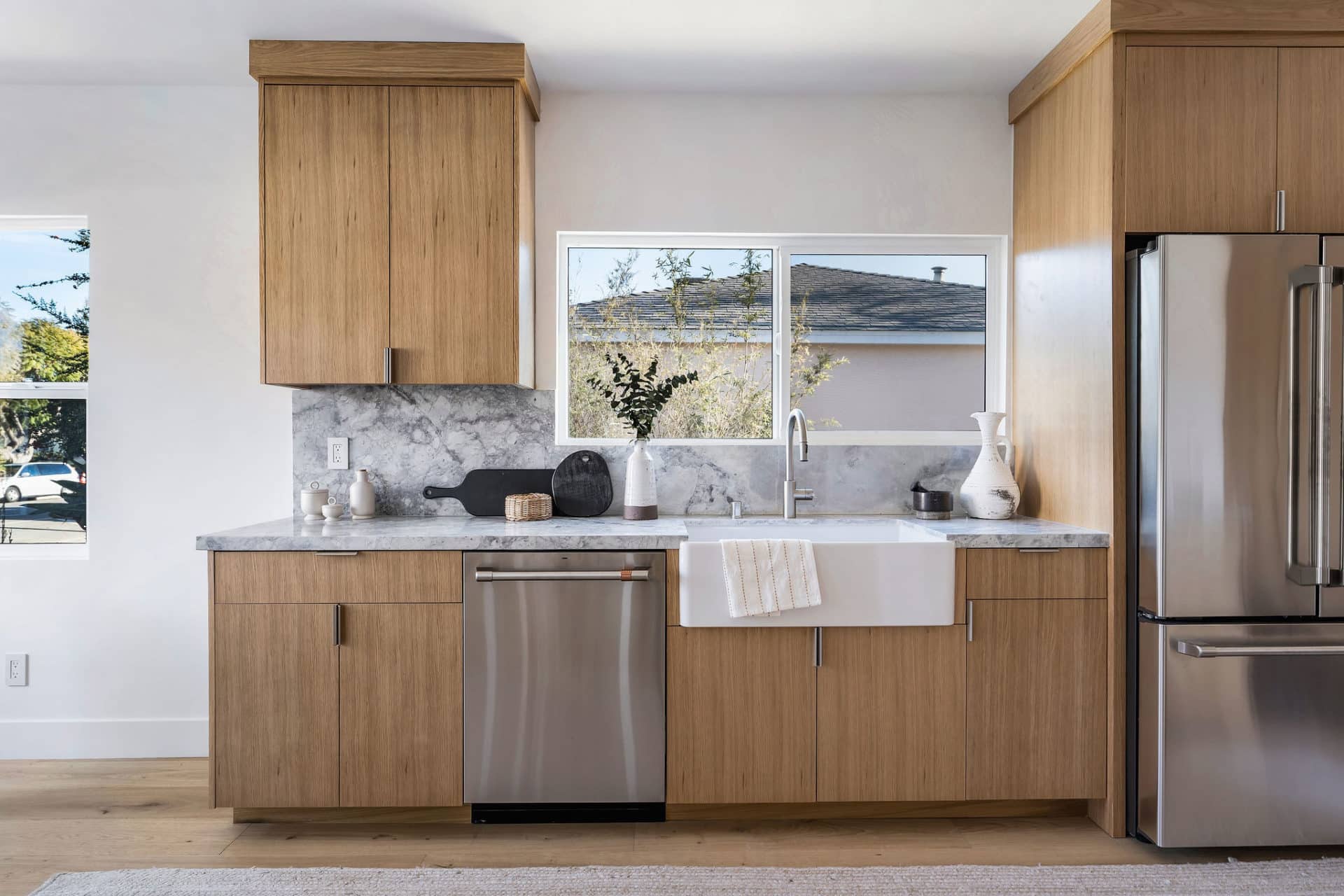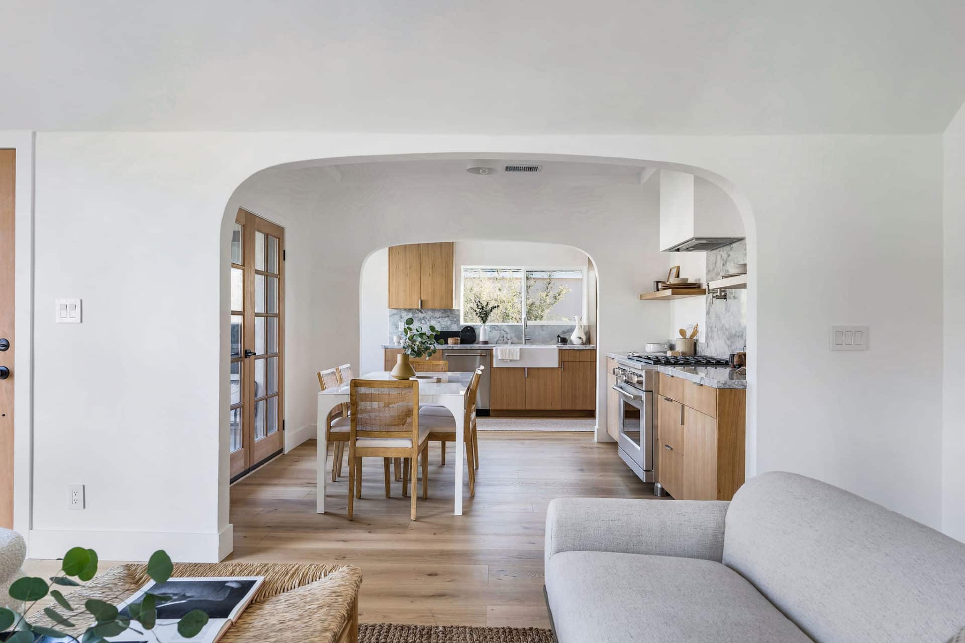 Archways lead you to dining with doors that open out to front porch for al fresco nights, and spacious kitchen with marbled quartzite counters, Café line appliances, custom cabinets, farmhouse sink, integrated hood, breakfast nook and laundry off-kitchen with back door access.