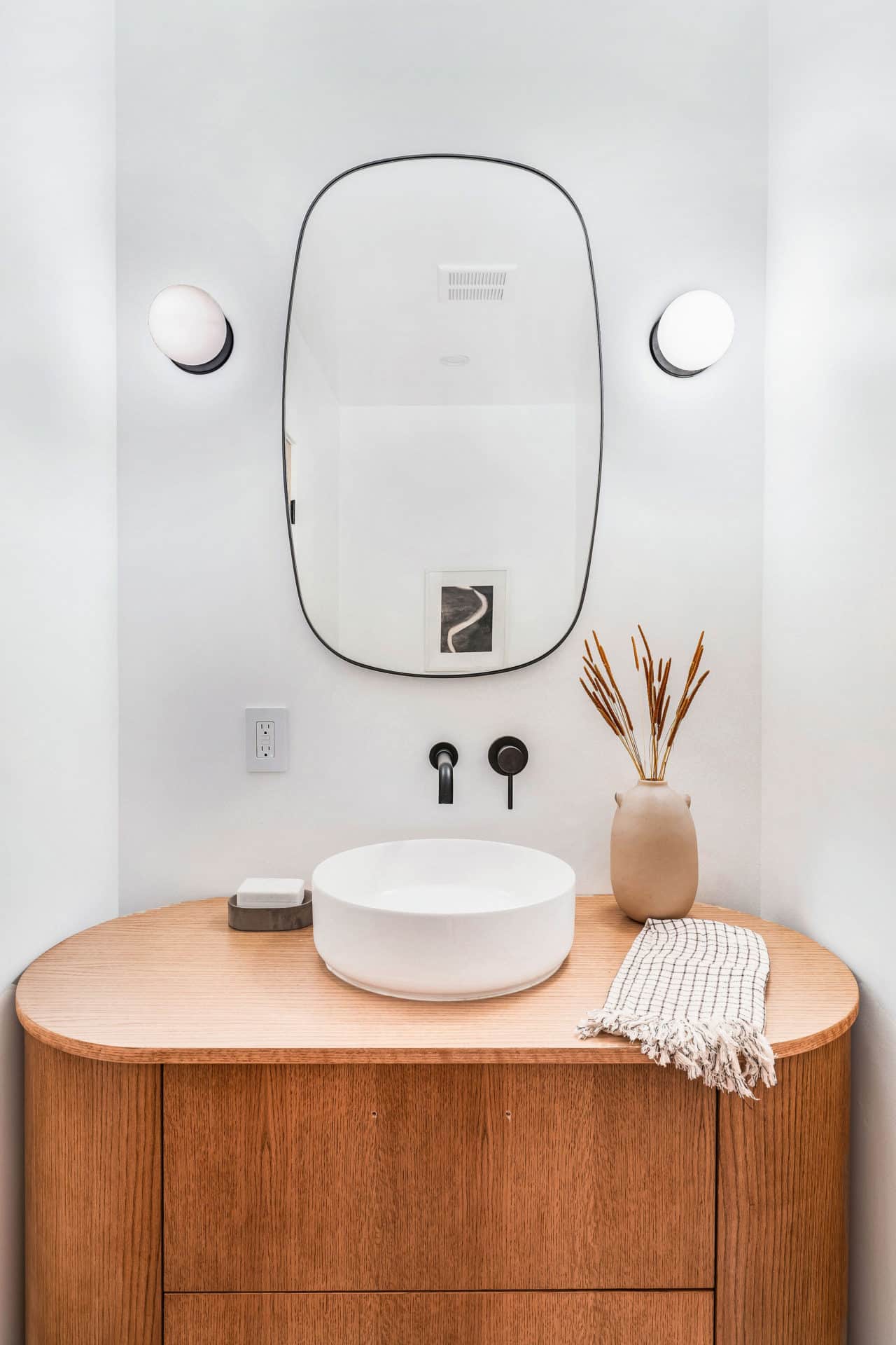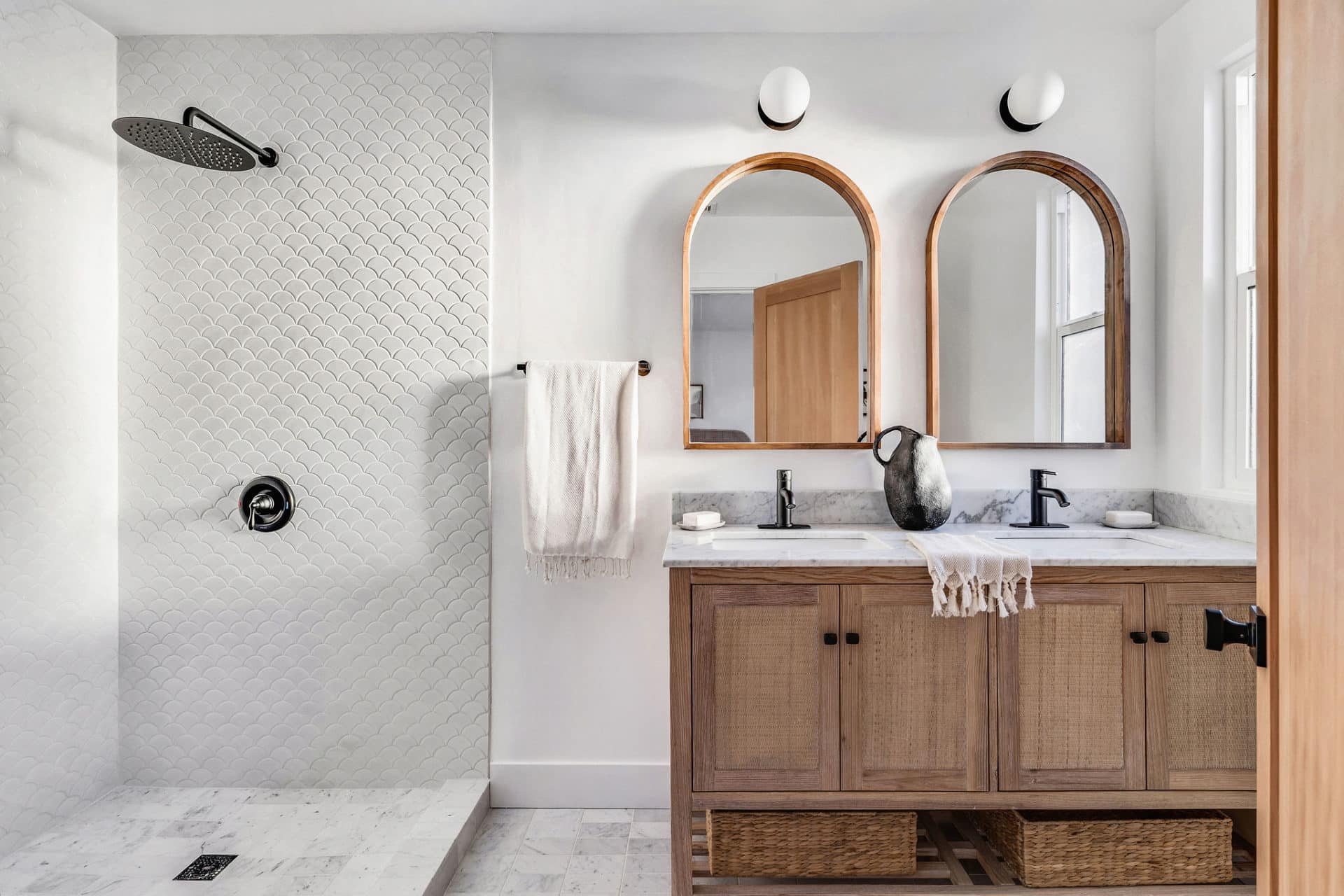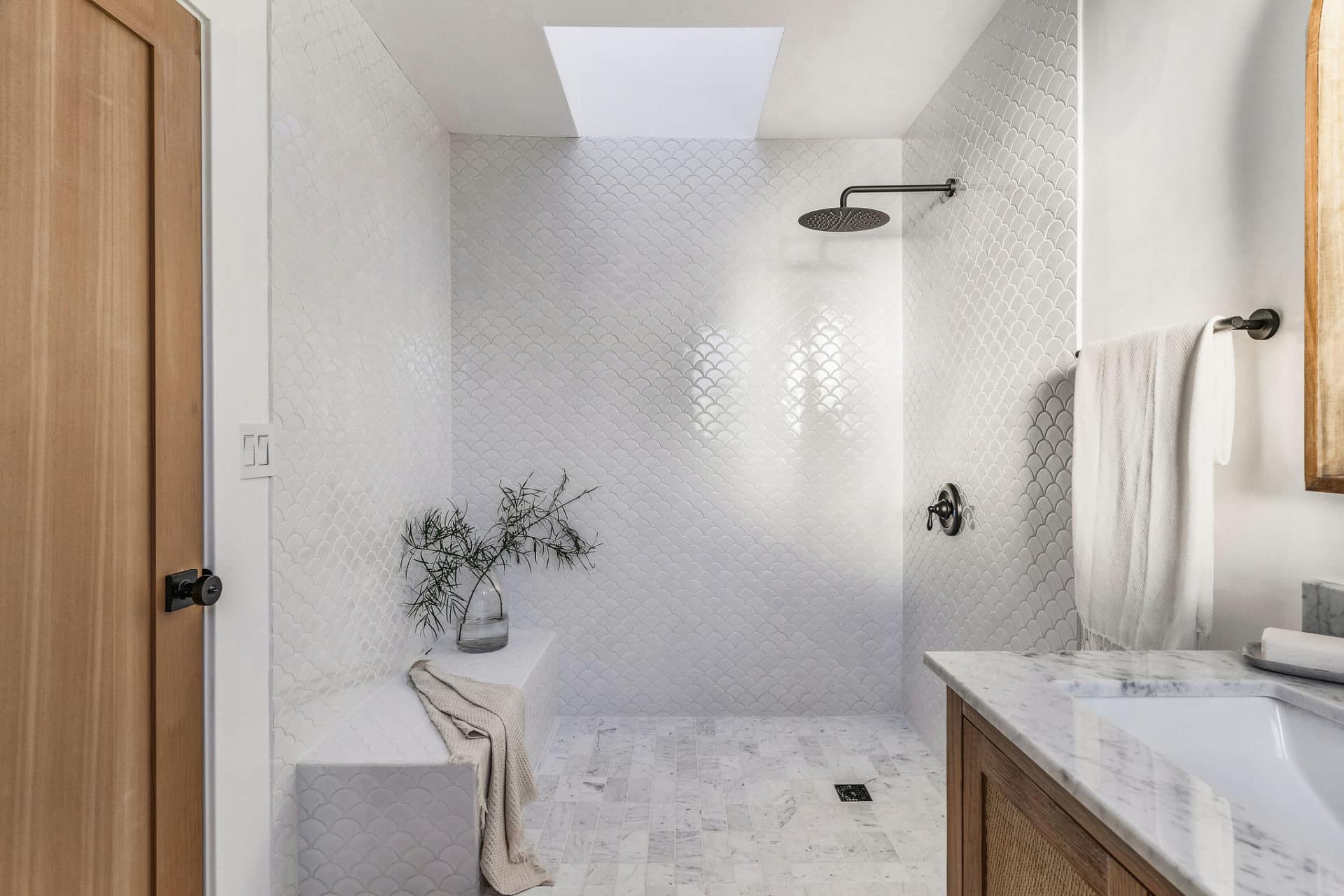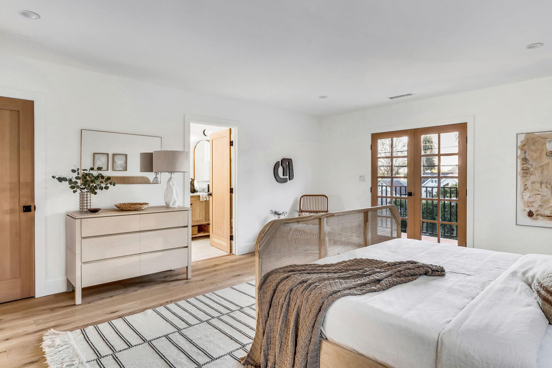 First floor boasts 2 spacious bedrooms with gorgeous ensuite bathrooms – one featuring square Zellige tile, rainfall shower and custom vanity; the other is chic simplicity with white shaker vanity and a stacked grid subway shower with matte black fixtures. First floor also features hall bath with custom vanity, perfect for guests. Upstairs awaits a grand primary suite with walk-in closet, double doors lead out to large Saltillo tile deck that overlooks yard and a beautiful palm-dotted sky, as well as an incredible ensuite bath with scallop tile shower, marble tile floors, and a beautiful double vanity.