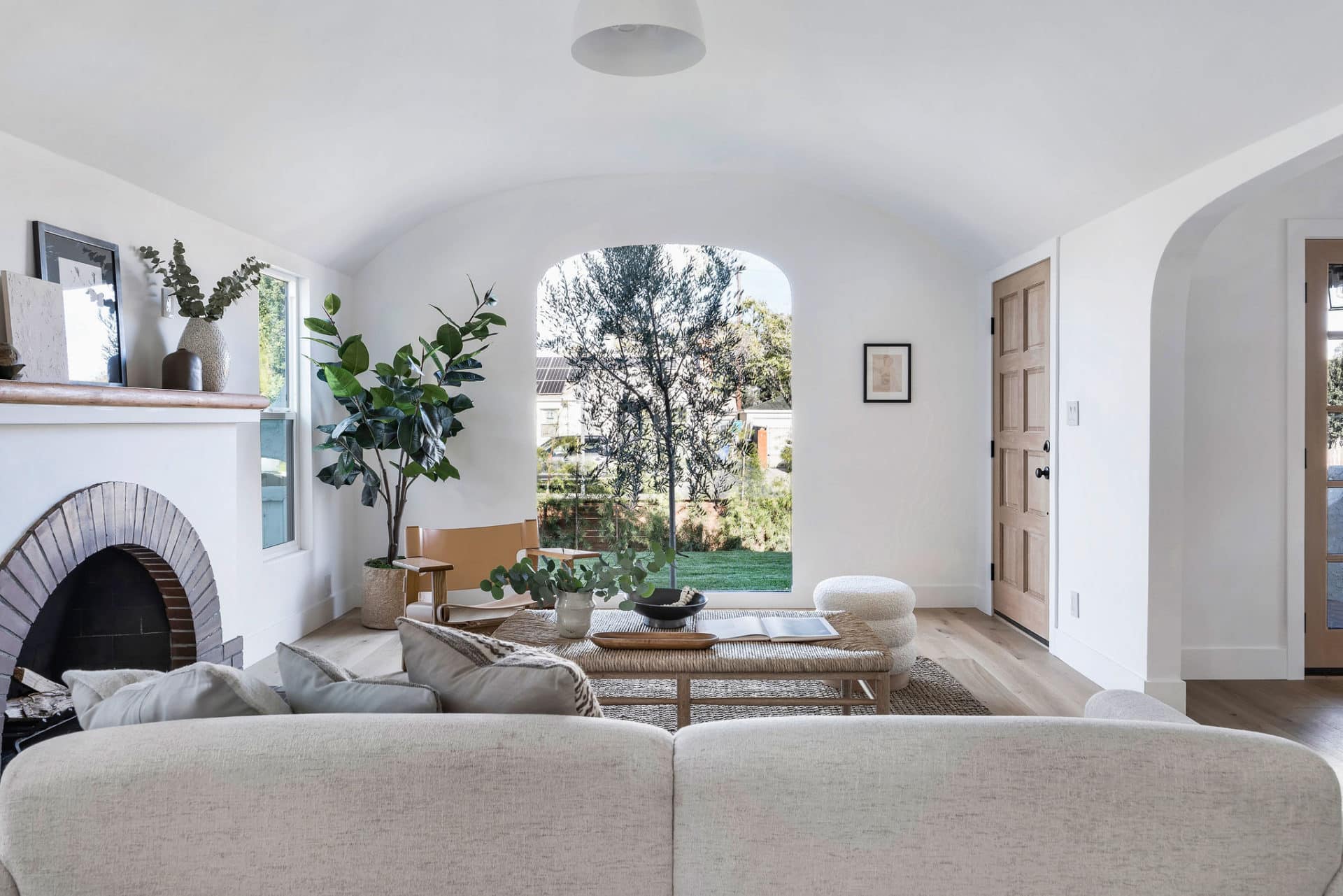 Living room with barrel ceiling, arching picture window and character-rich fireplace have you instantly feeling at home.