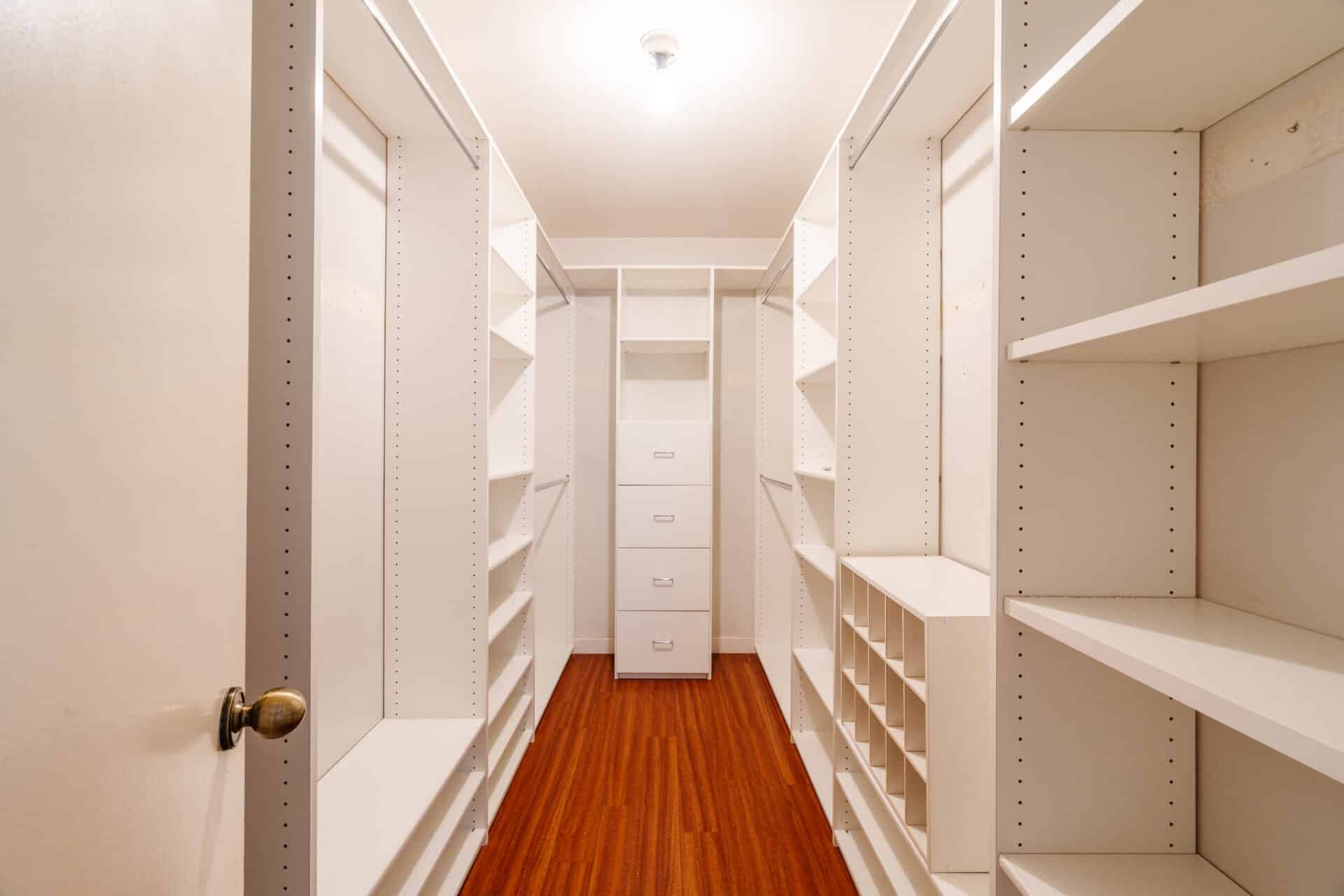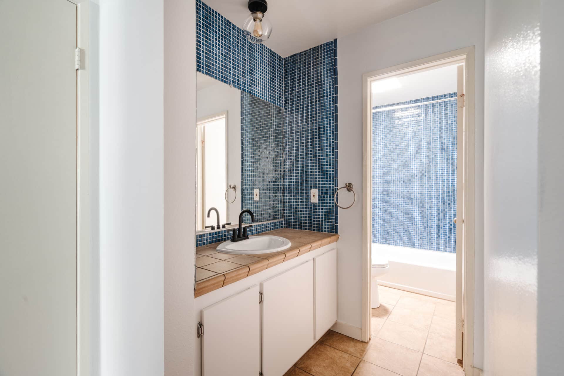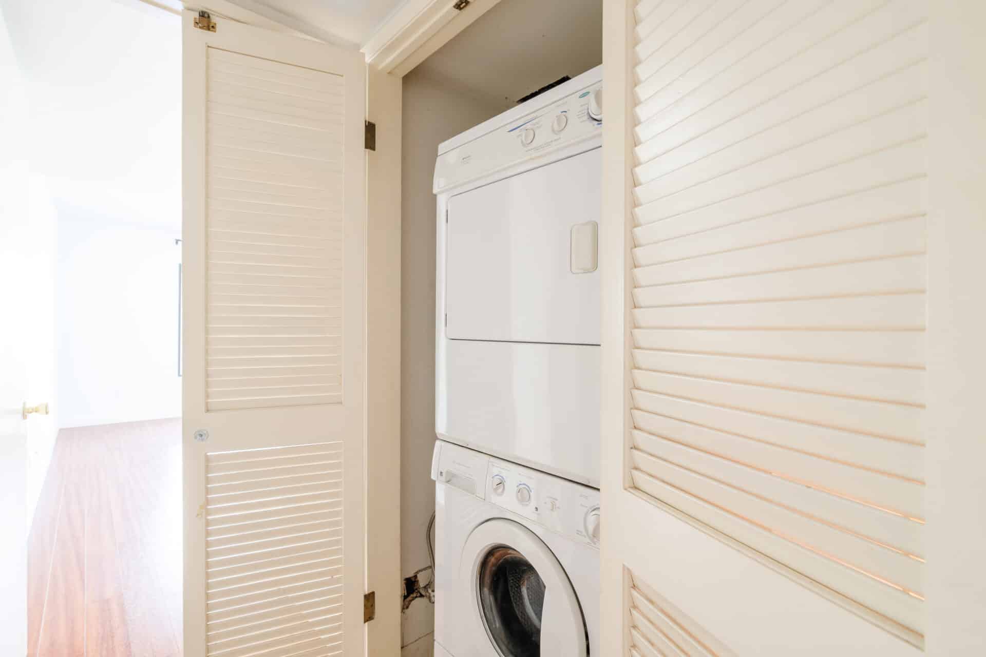 An In-Unit washer & dryer combo is perfectly nestled right outside the Primary Bedroom where we find an en suite bathroom with tub, built-in desk with shelving storage leading out to the bedroom area, and a sizable walk-in closet.