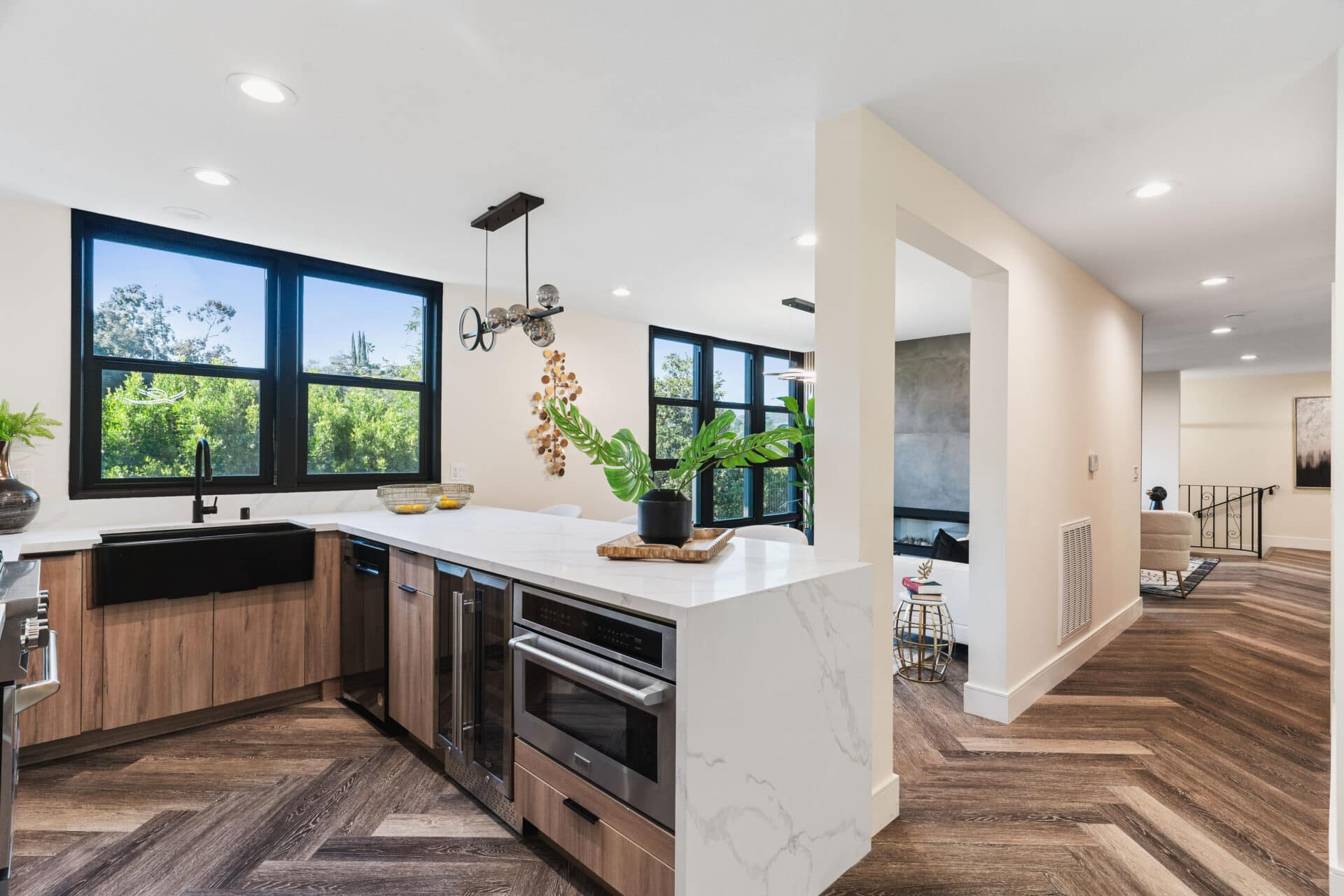 Down the hall opens to a sophisticated entertainer’s kitchen featuring waterfall-edge white quartz countertops, black apron-front trough sink, gas range, dishwasher, built-in microwave, and wine fridge and walk-in-pantry. Entertain two ways- in the cozy den in front of the sultry gas fireplace, or in the grand dining room under the chic chandelier.
