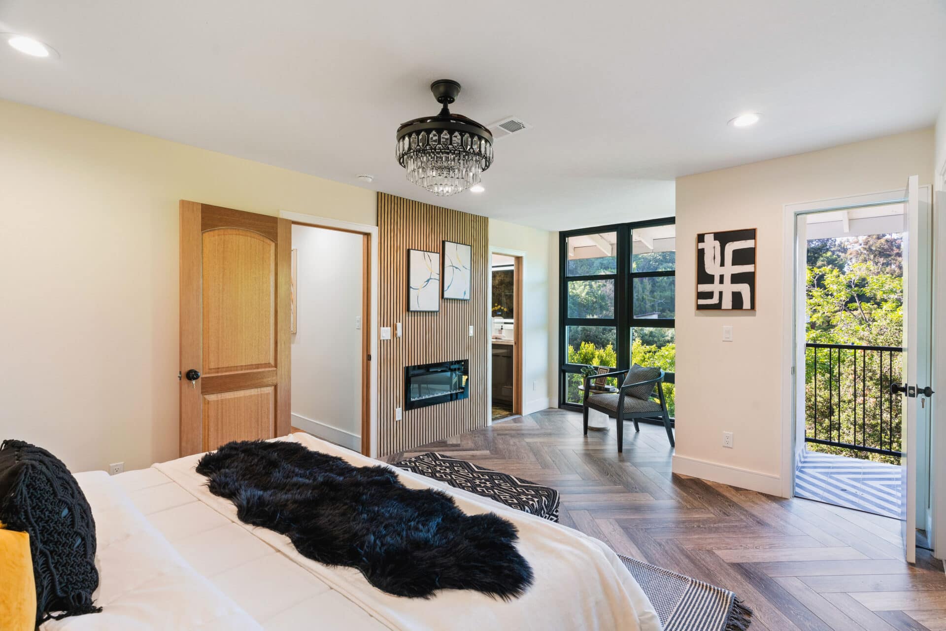Retreat upstairs to your deluxe principal suite, with sexy gas fireplace, reading nook, and private balcony overlooking peek-a-boo views of Hollywood Hills- perfect for enjoying your morning espresso.
