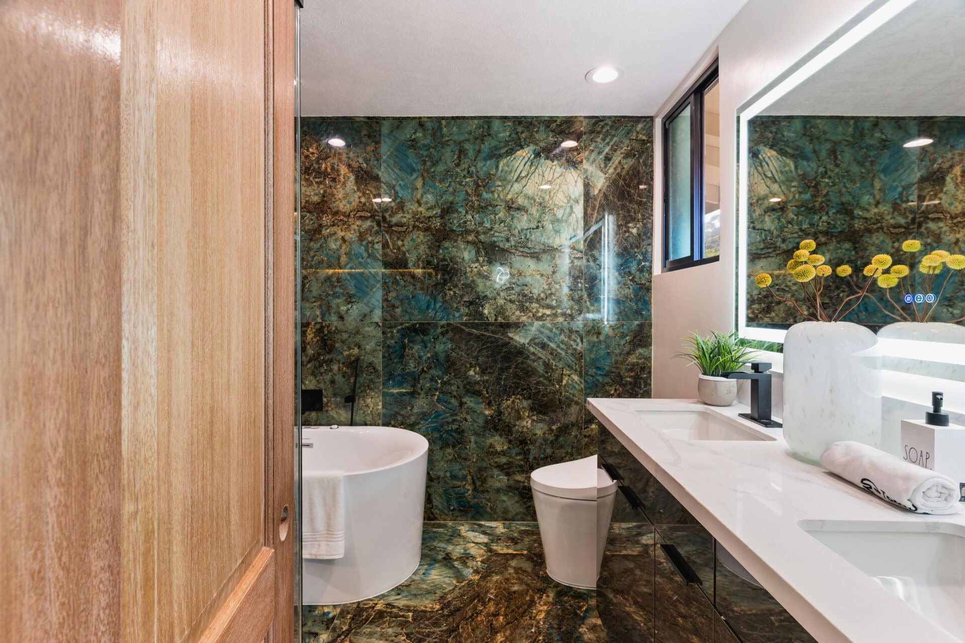 The ensuite bathroom has major wow factor with jade green porcelain walls, LED anti-fog, dimmable smart mirror over the double vanity, smart toilet with bidet, bluetooth fan, extra-deep soaking tub, and a roomy shower with elongated illuminated niche. Two more generously-sized bedrooms fulfill your expectations for space and comfort.