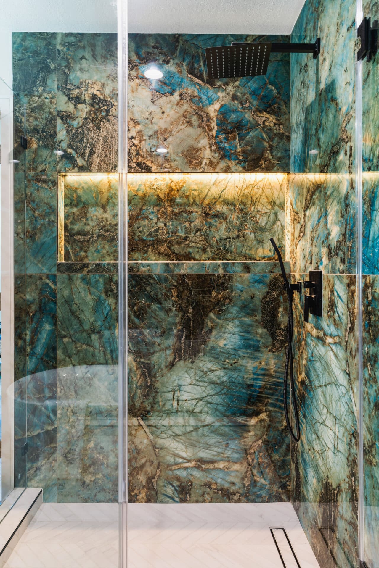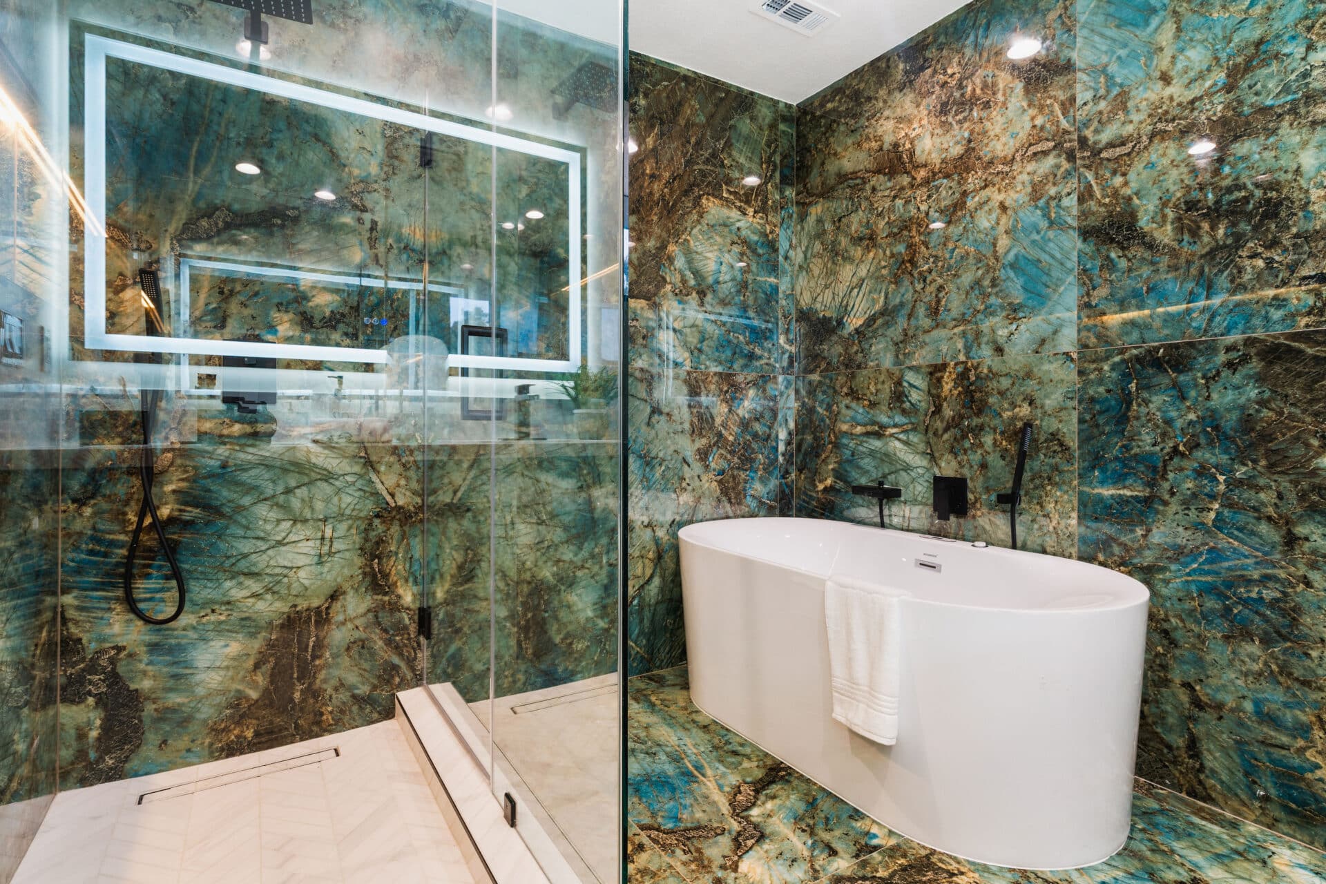 The second full bathroom boasts creamy porcelain walls, extra-wide vanity with LED anti-fog dimmable mirror.