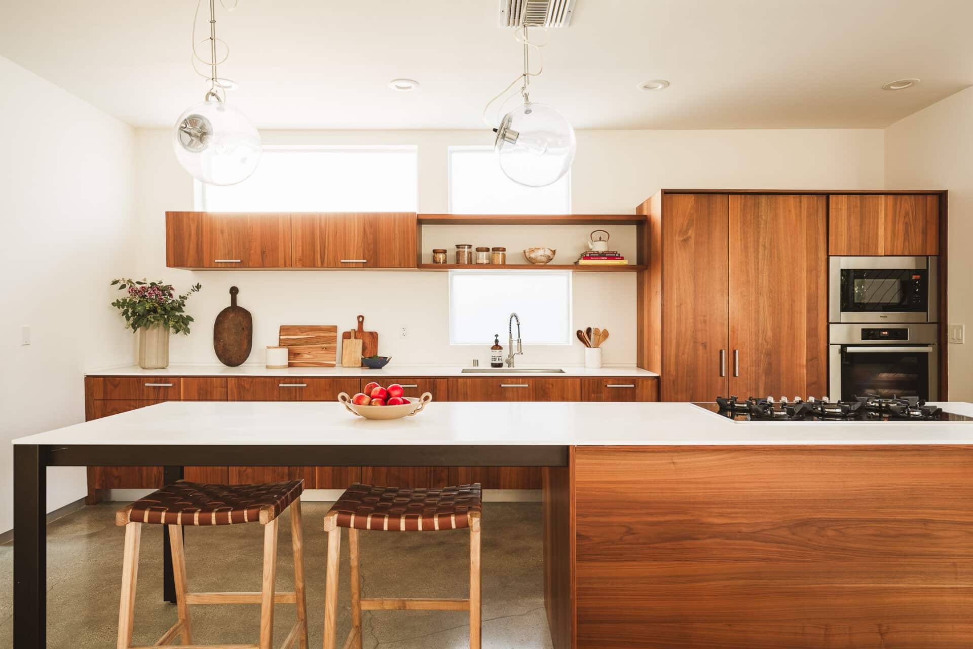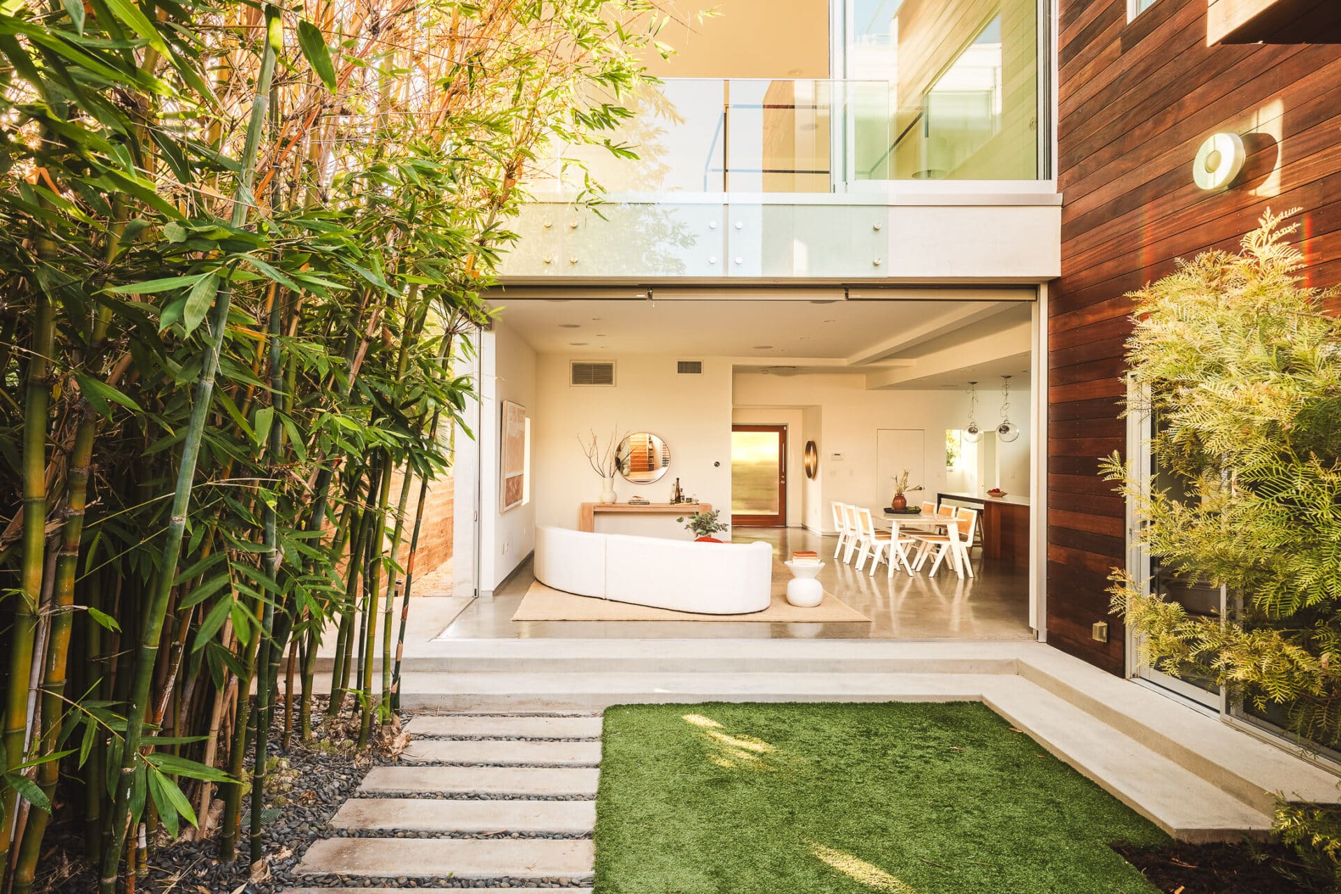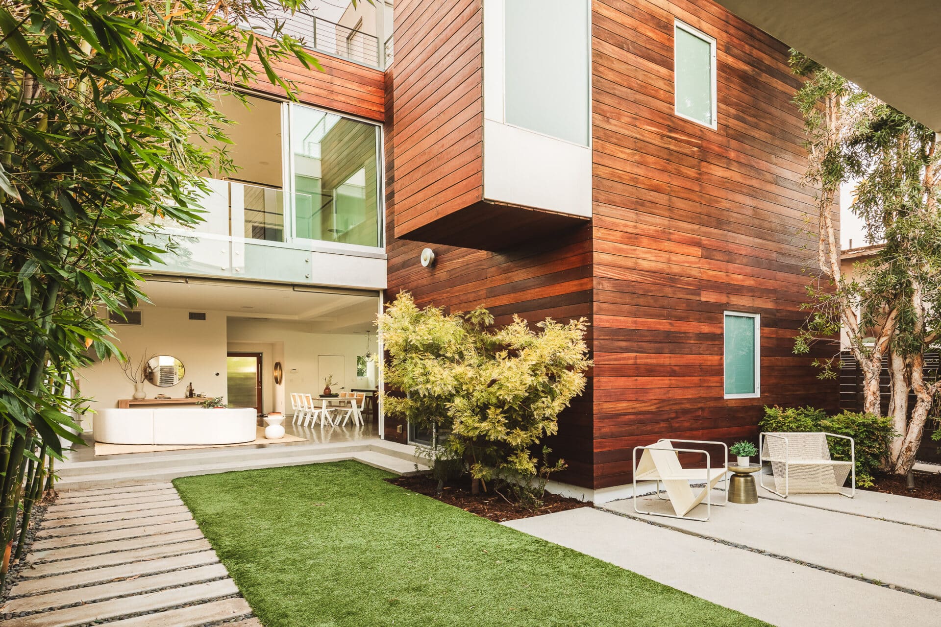 As you enter through the private gate and driveway, the serene ambiance of a koi pond, surrounded by lush greenery, beckons you into a realm of contemporary elegance. Both residences, adorned with a harmonious blend of rich Ipe wood siding and smooth stucco, exude a sophisticated yet natural aesthetic.