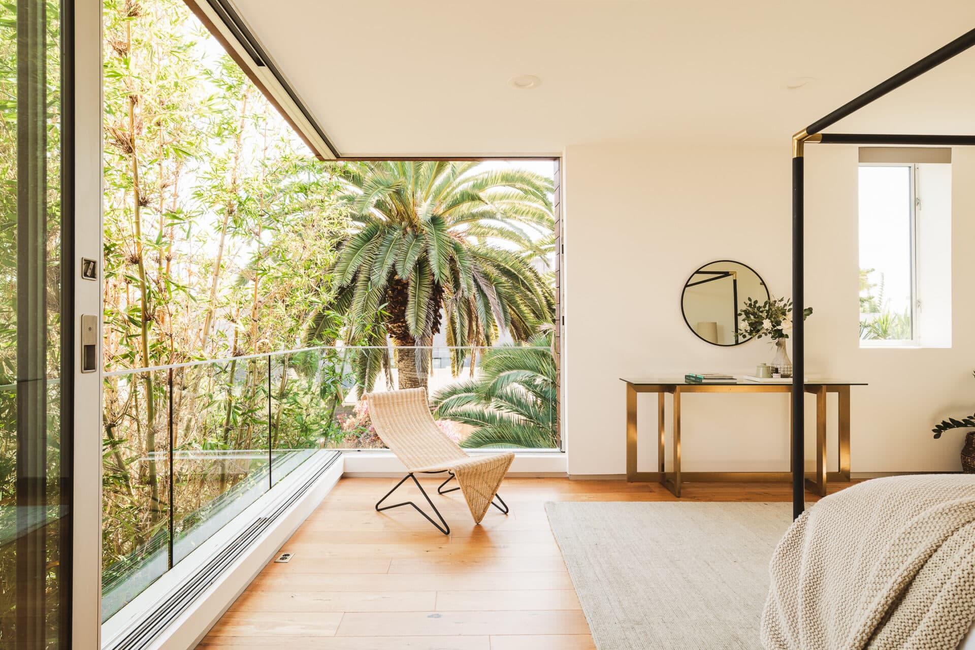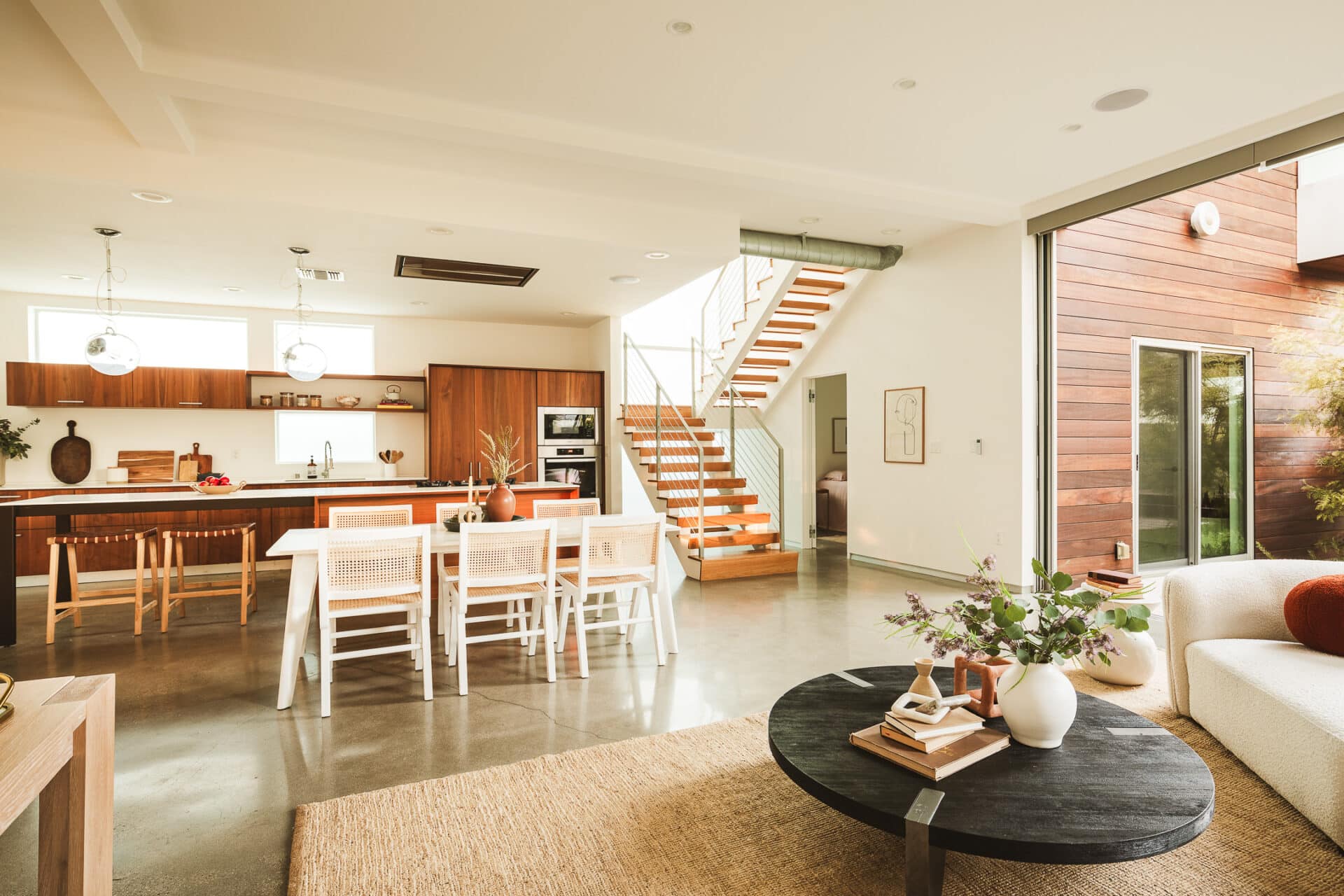 The main residence welcomes you with a sunlit living room that seamlessly flows into the dining area, creating an inviting setting for both intimate dinners and grand gatherings. Fleetwood floor-to-ceiling glass doors enhance the connection between the interior and the outdoors.