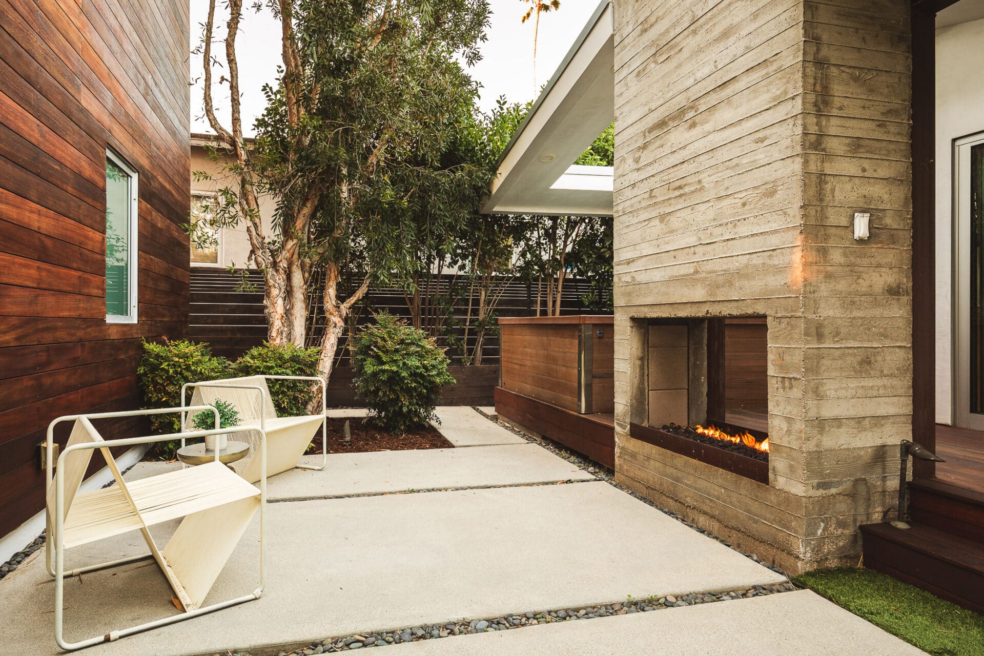 Nestled between the two homes is a verdant retreat. This outdoor sanctuary is enriched with a variety of fruit trees, including Eureka lemon, Blood Orange, Grapefruit, Kumquat, and Washington Navel Orange. The deck, connected to the back house, is the heart of outdoor relaxation, featuring a rejuvenating hot tub and an inviting fireplace, setting the mood for cozy evenings. A separate outdoor shower offers a refreshing escape.