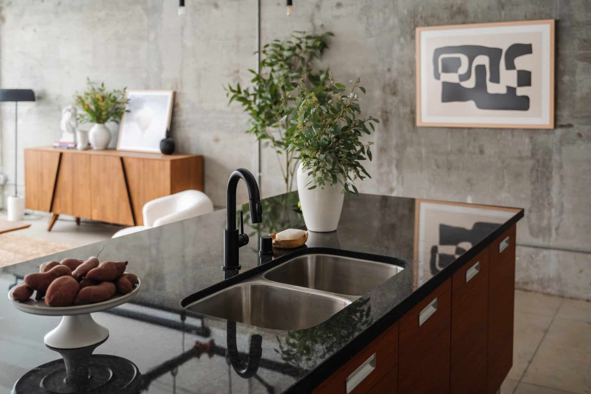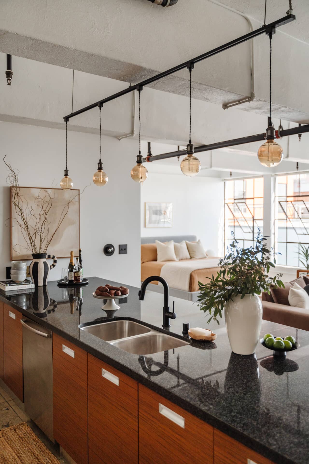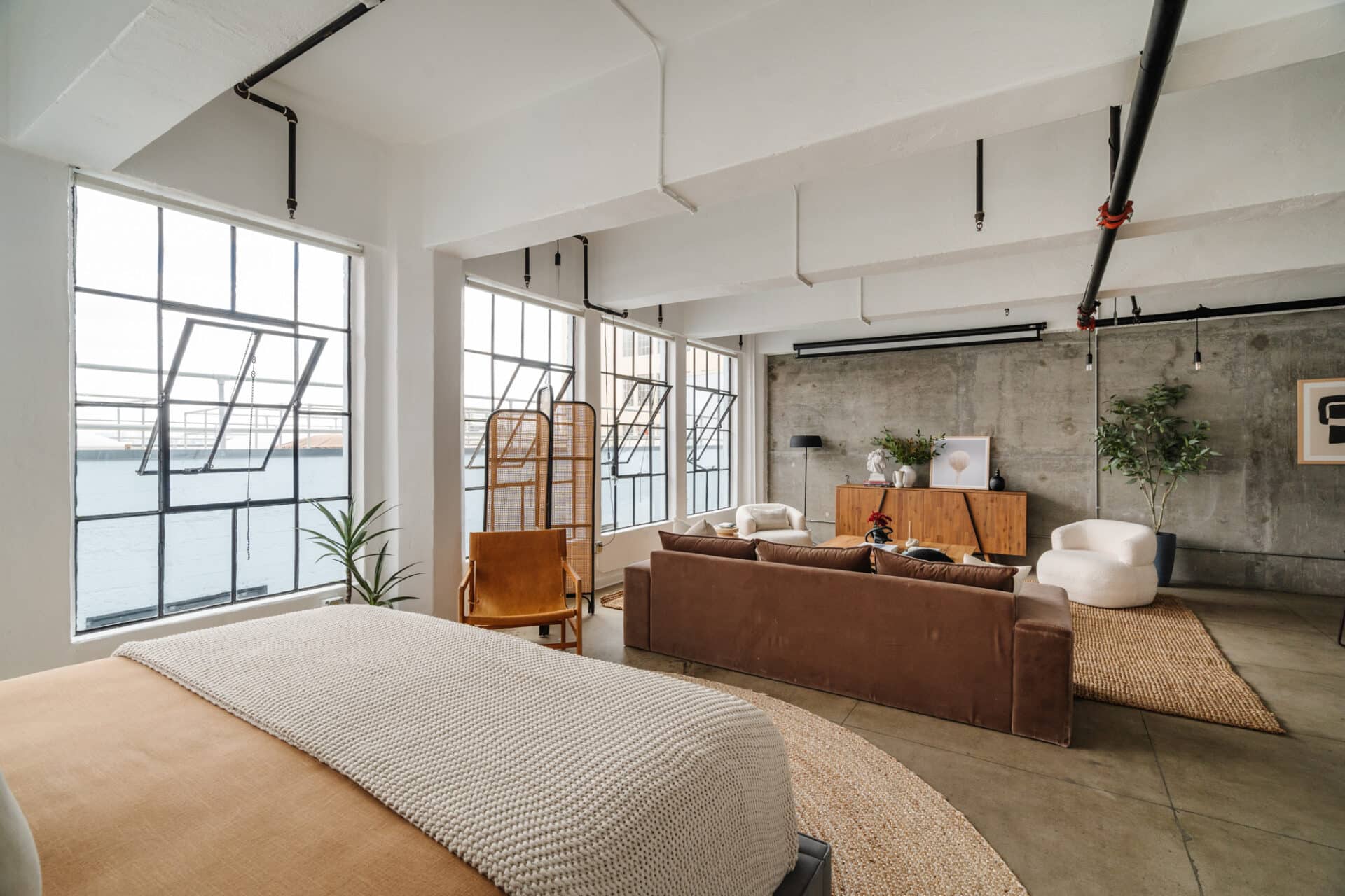 Nestled high up on the 9th floor, this unit is brimming with vintage character and breathtaking architectural elements: matte concrete floors, original steel framed windows, soaring concrete ceilings, exposed pipes, an array of Edison-style light pendants throughout, and a beautifully contrasting concrete wall completes the industrial feel of this serene urban oasis.