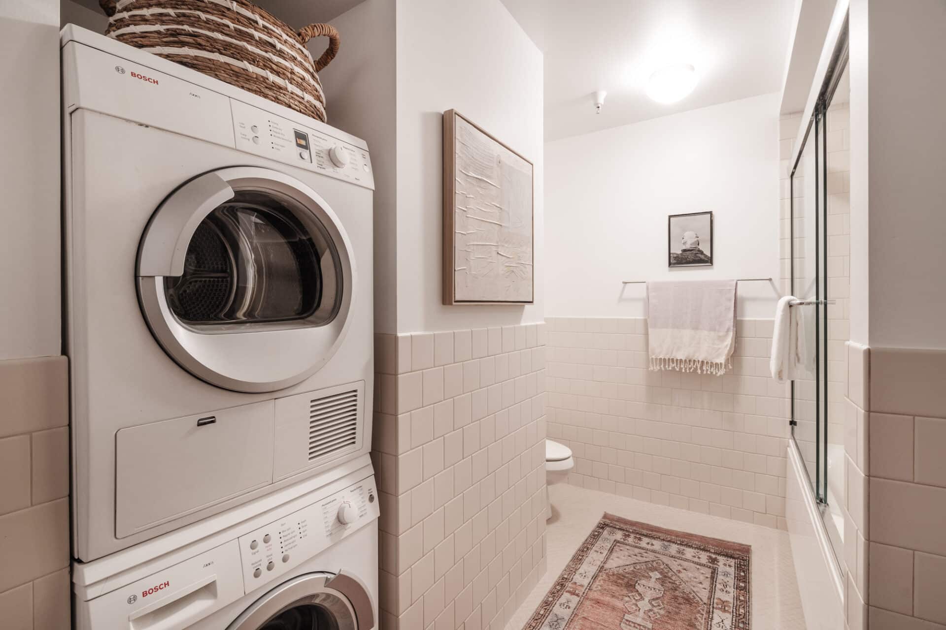 Spacious bathroom with mosaic tile, ample storage and stackable washer/dryer.