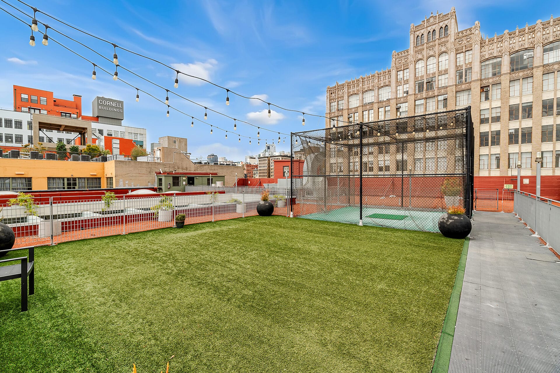 A wall of black steel windows bathes the space in natural light and looks out to a gorgeous downtown skyline standing proudly against LA skies and the mountains beyond.