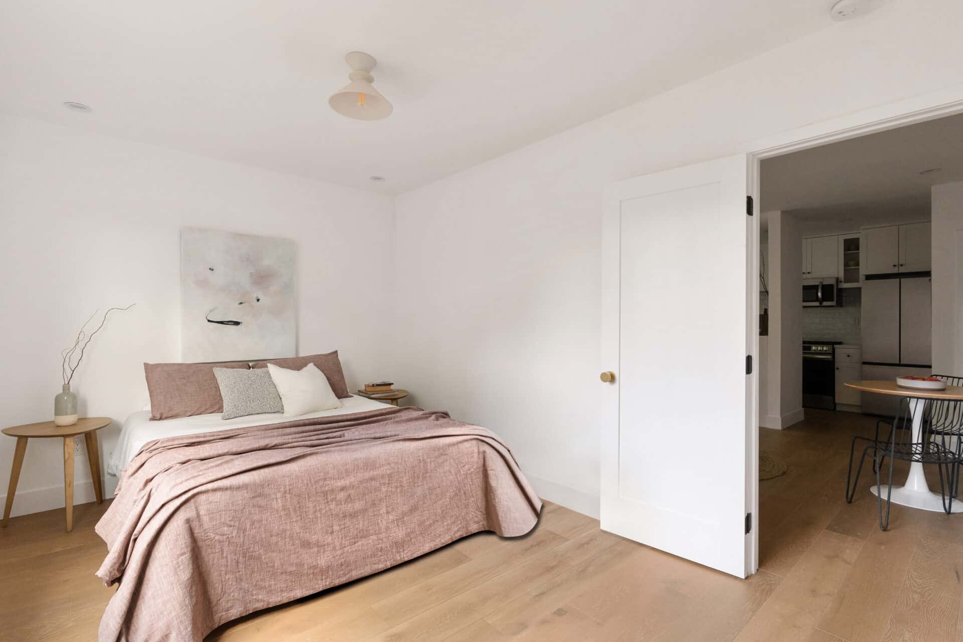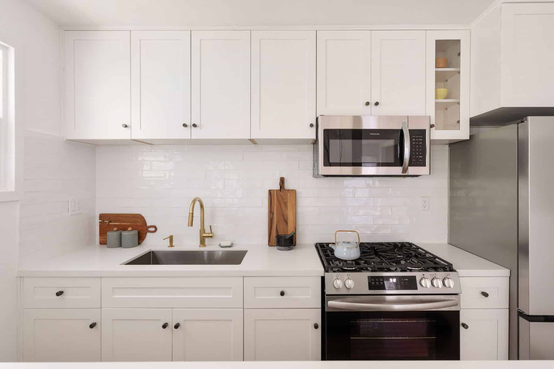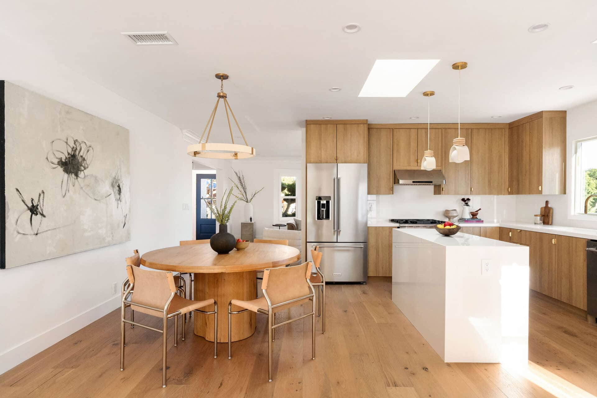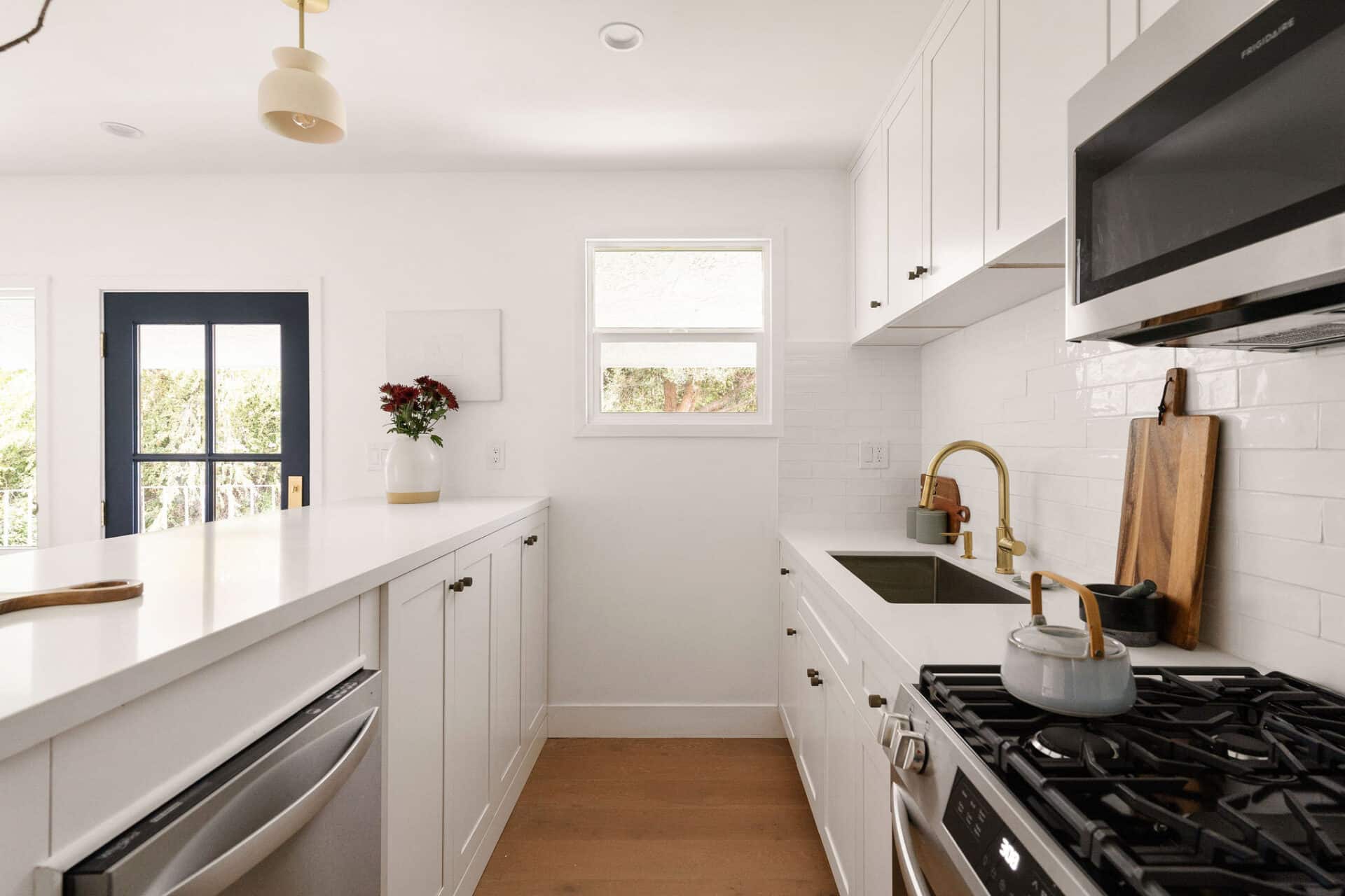 The open kitchen, dining, and second living room are an entertainer’s dream! The chef’s kitchen offers stainless steel appliances, pure white porcelain countertops and backsplash, brushed brass finishes, and custom cabinetry that perfectly complement the Hamptons aesthetic.