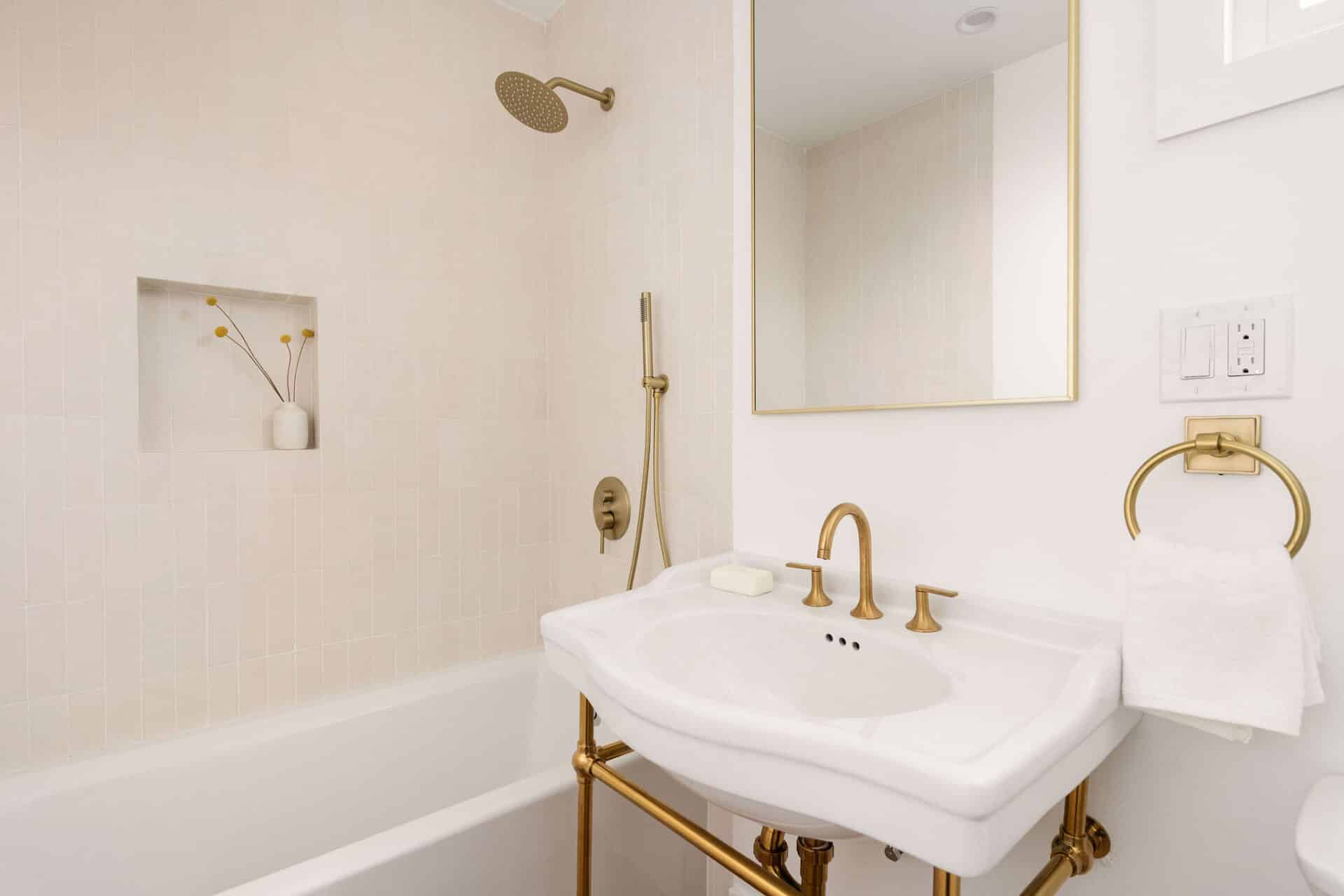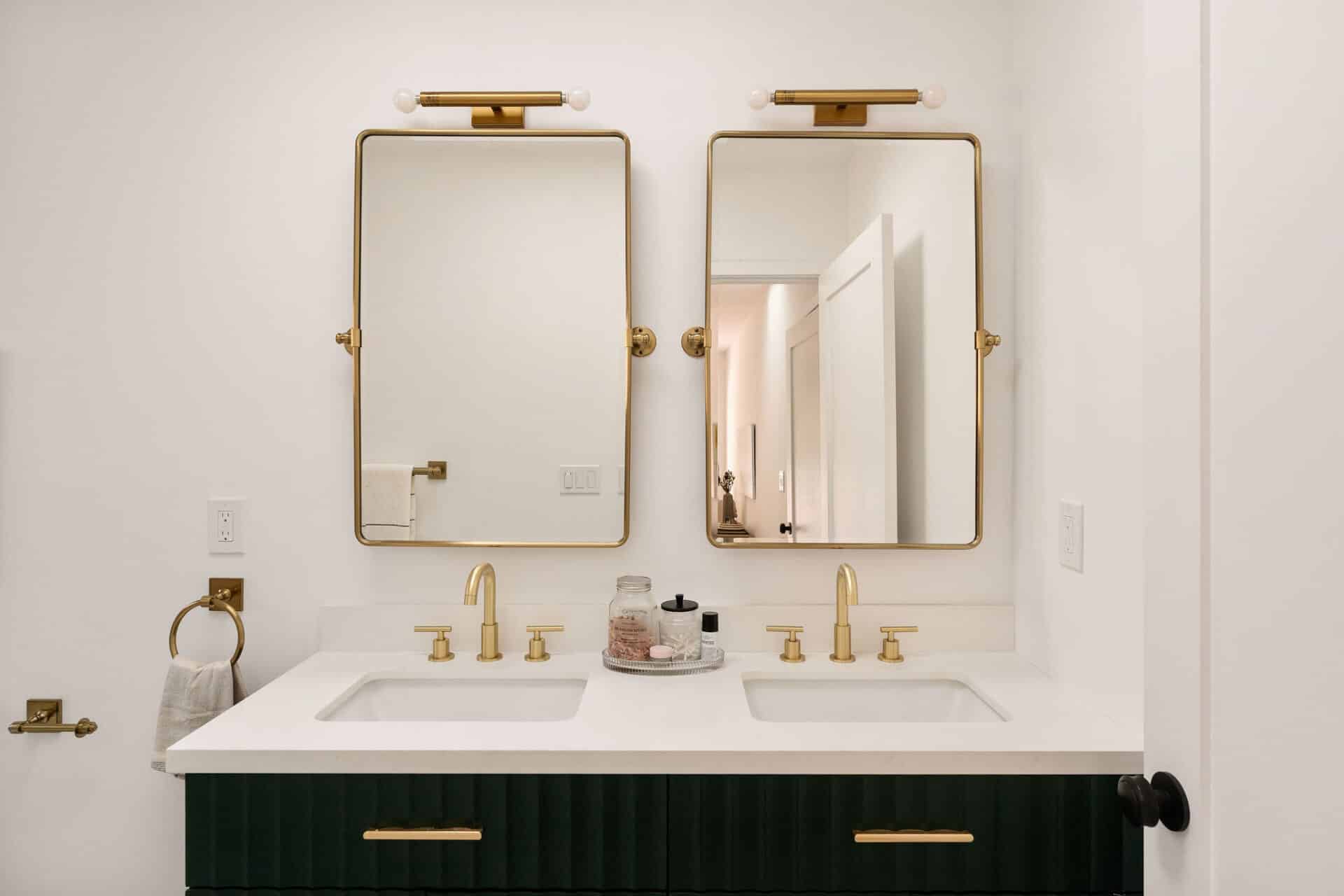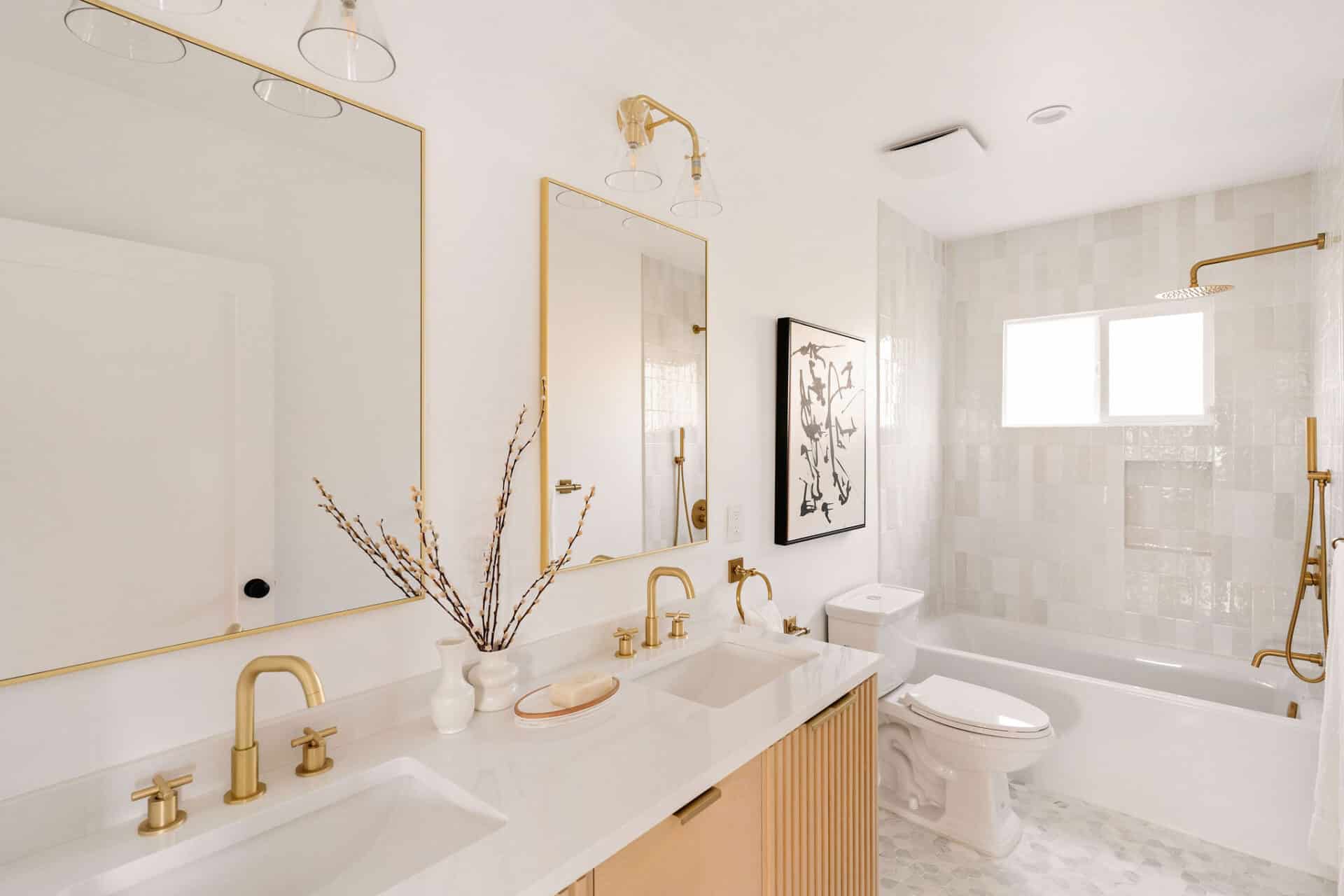 The sophisticated hall bath offers double vanity, honed marble, designer light fixtures, and brushed brass detail, and is flanked by two sizable bedrooms.