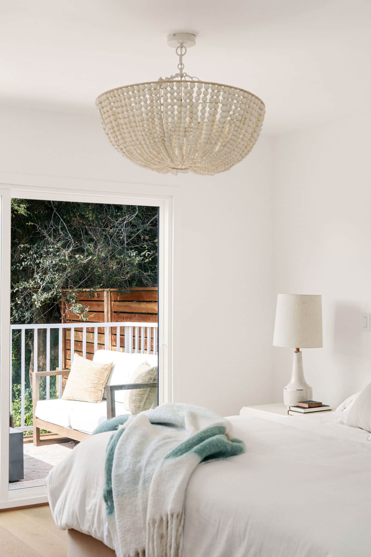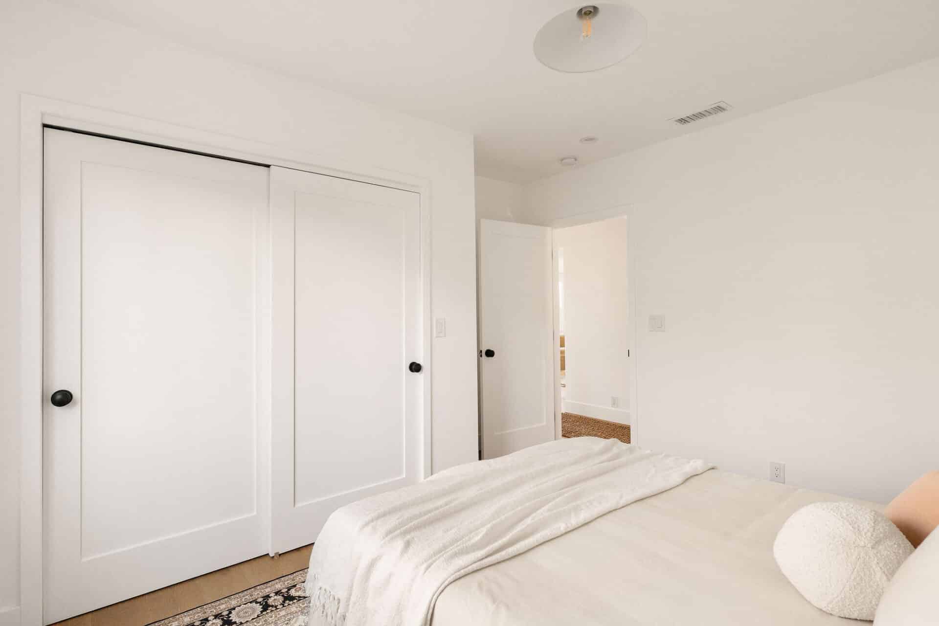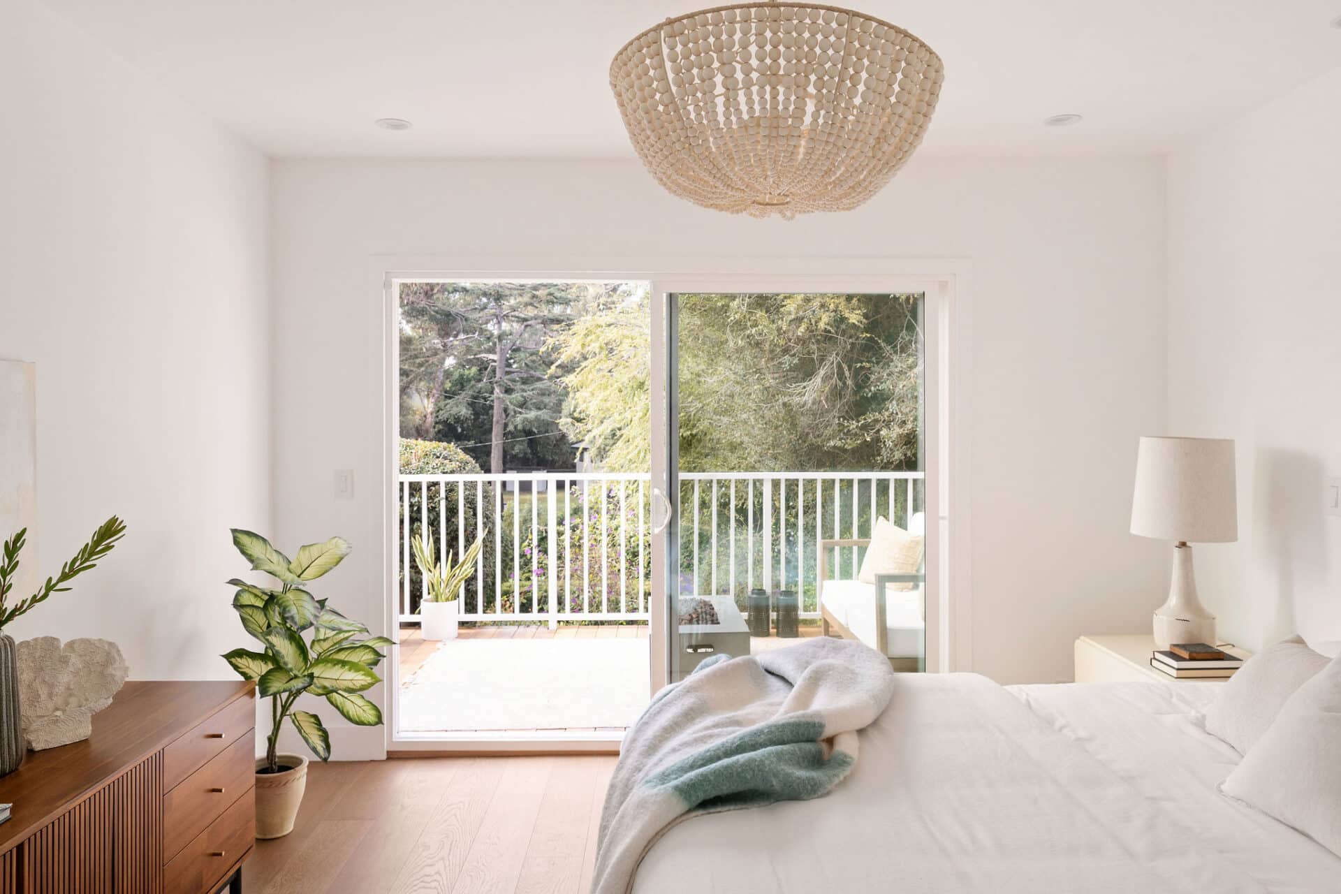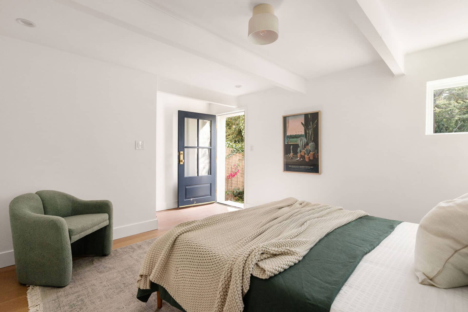The bright and airy principle suite boasts slider access to the back deck, has a custom walk-in closet and ensuite full bath with bold forest green double vanity, and marble floor and wall tile from Bedrosians.