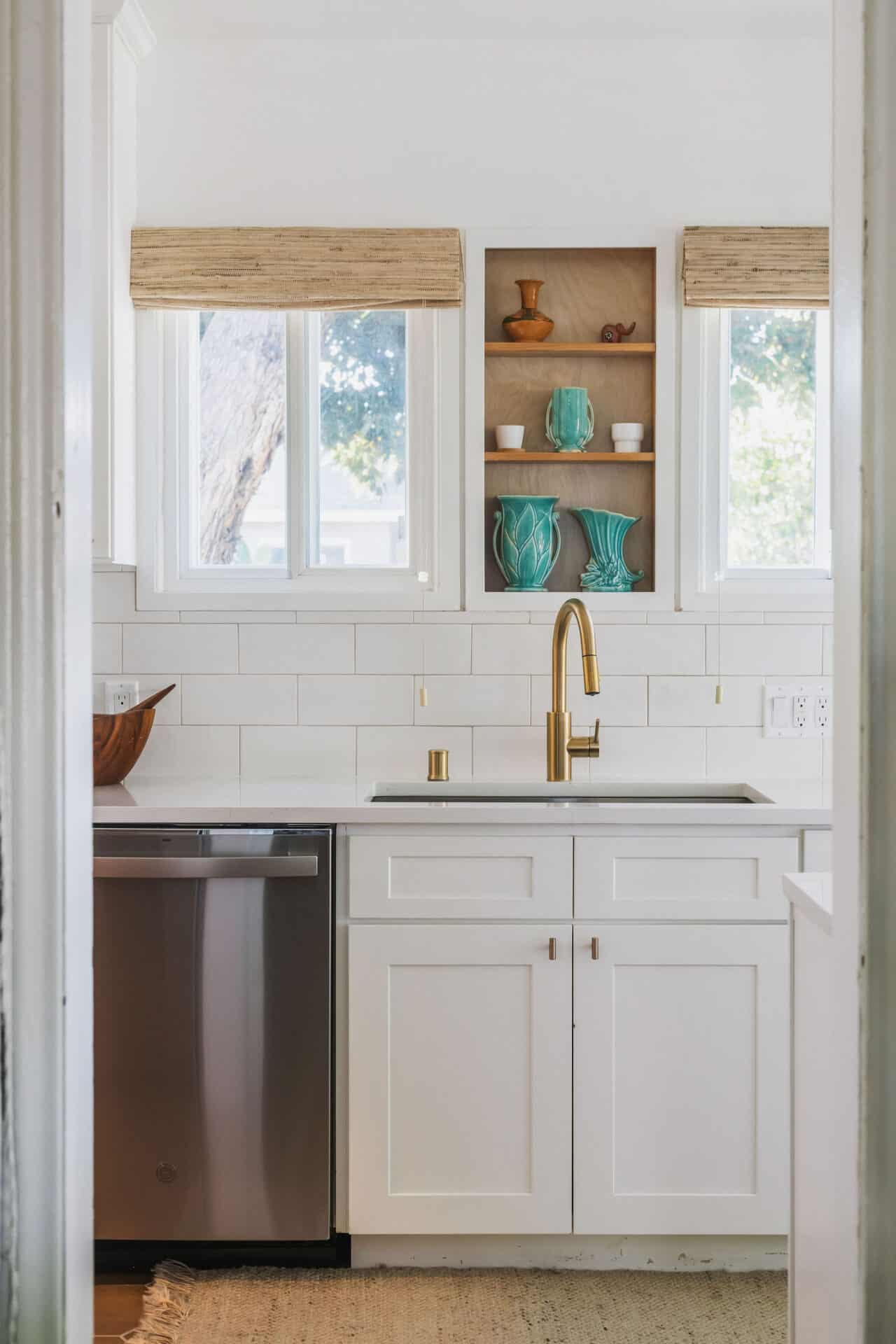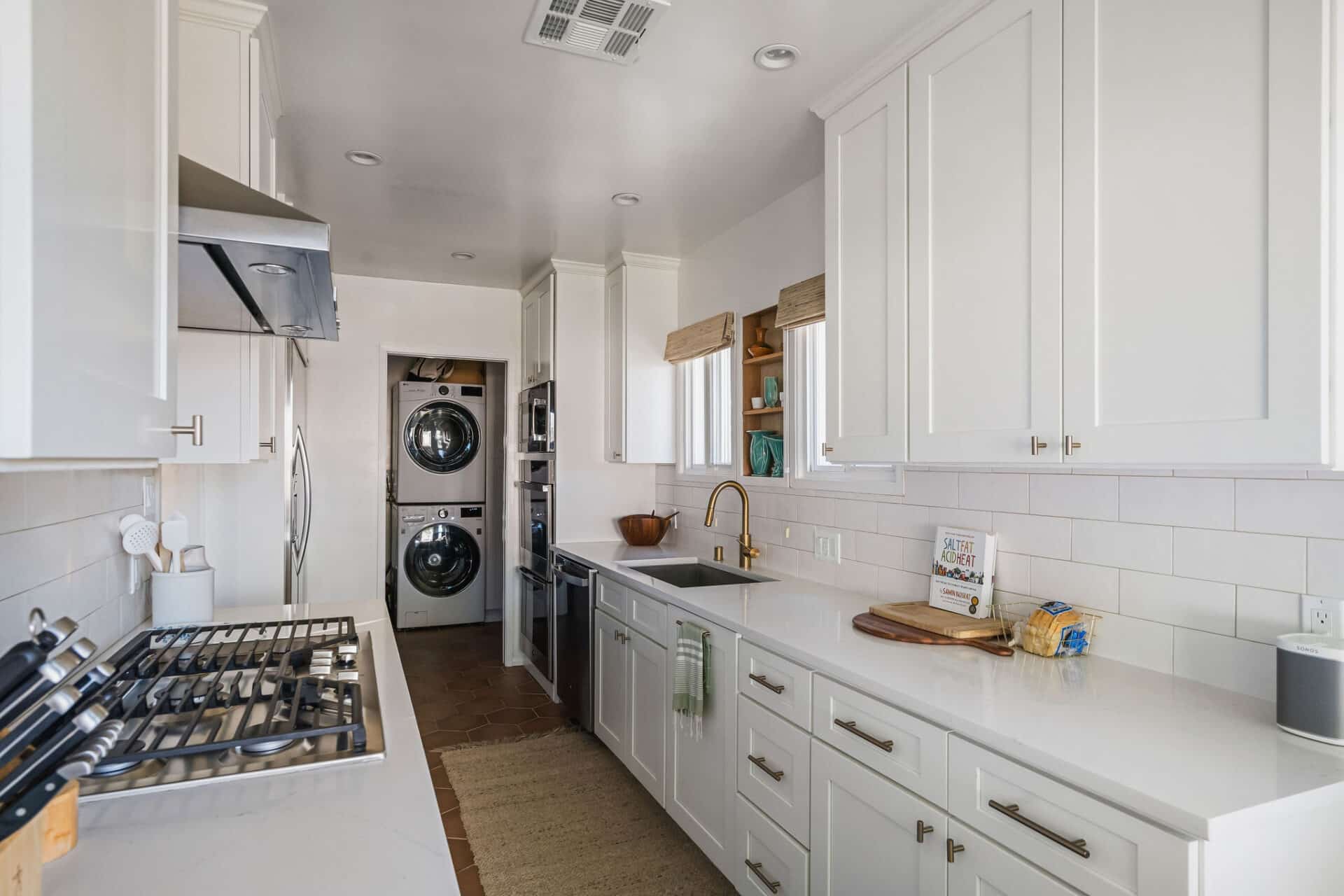 Through an arch adorned threshold find the dining area with plenty of room for Eyeswoon style gatherings. Whip up culinary masterpieces in the newly renovated kitchen, complete with envy-inducing newer cabinets with built in stainless steel appliances, cement hex tiles and a breakfast nook for added charm. An adjacent laundry room offers a convenient side door and extra pantry storage.