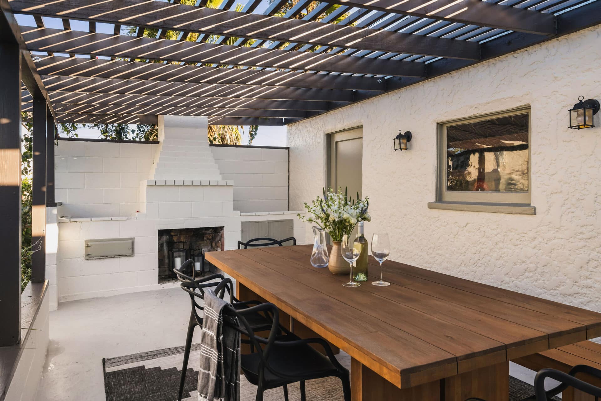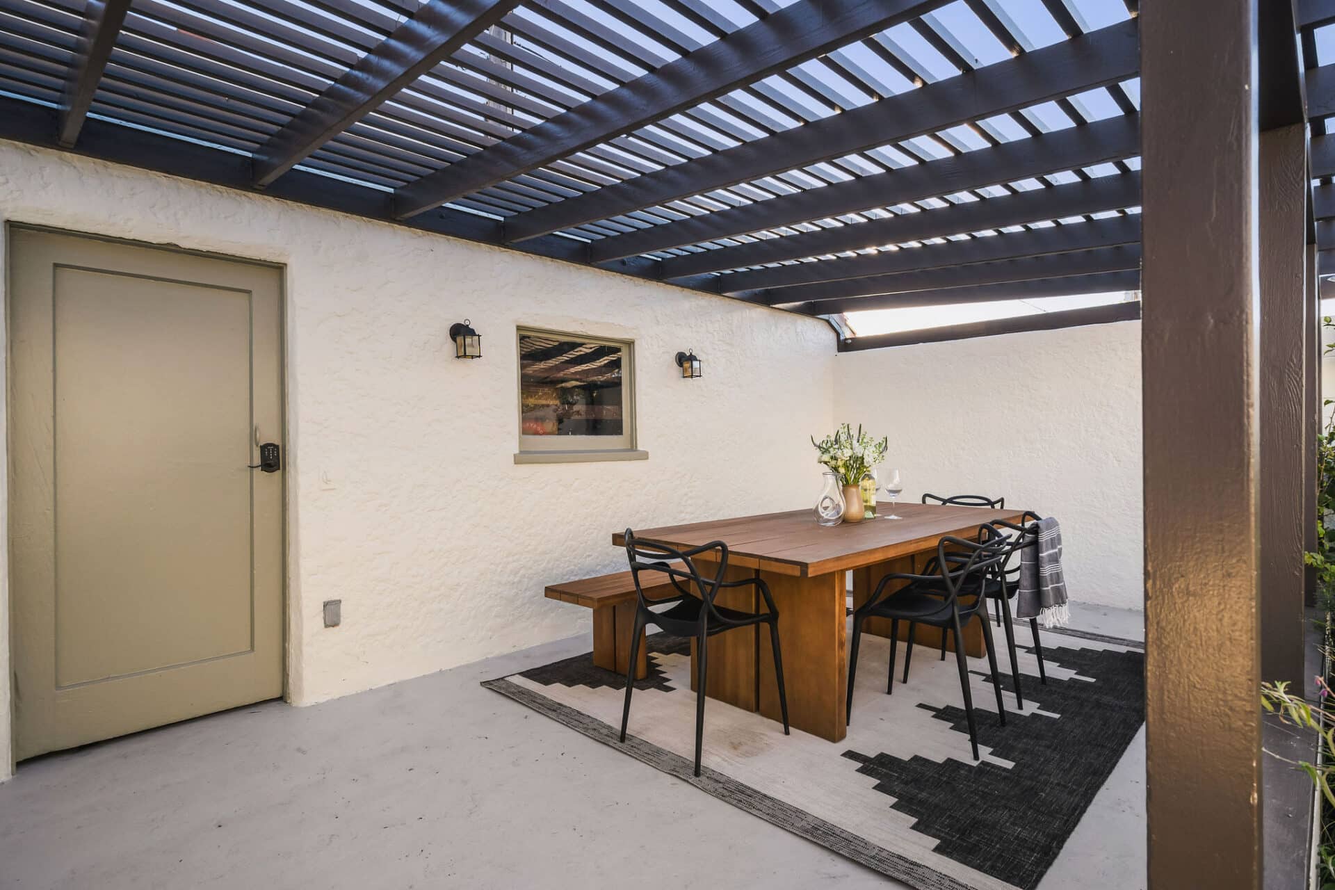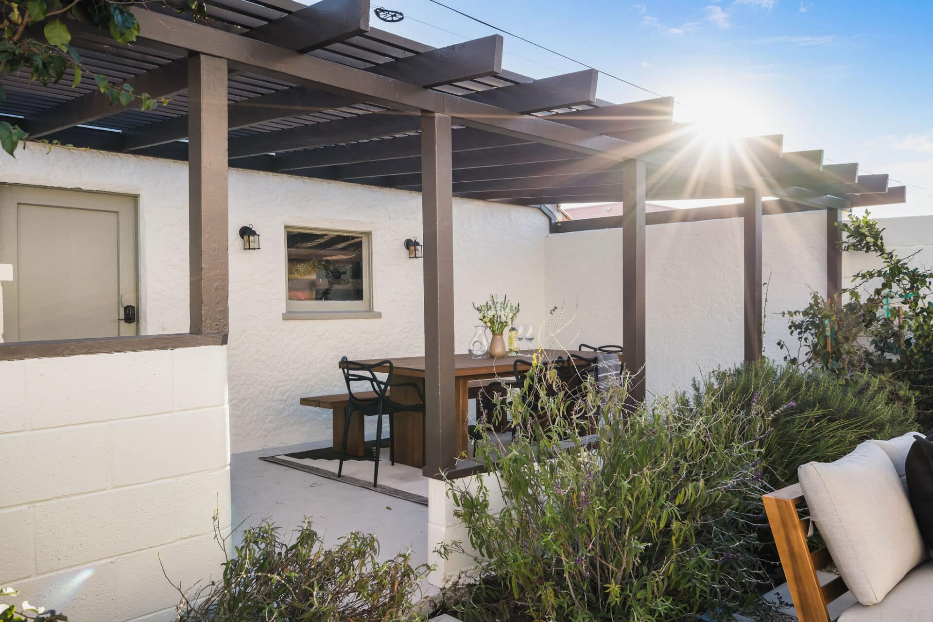 Three spacious bedrooms with two refreshed bathrooms complete the space. A well sized soaking tub offers a warm retreat at the end of each evening, a place for self care and relaxation. Nearby in the third bedroom sliding doors encourage smooth indoor outdoor flow to the ample yard space. Bask in your private sanctuary: a sprawling yard complimented by fruit trees, colorful florals, and a pergola-shaded dining area perfect for al fresco nights in front of the outdoor chimney.