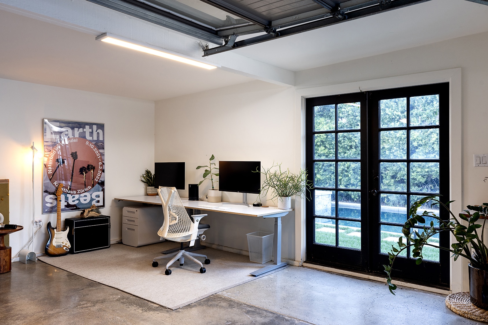Master bathroom enjoys ample closet space and remodeled bathroom featuring plaster walls, marble vanity, modern lighting fixtures and sleek stone shower. 2 additional bedrooms, one with french door backyard access, share a chic plaster hall bath replete with marble vanity, and generous shower. The backyard is an entertainer’s haven with breathtaking 8’ salt water pool and spa, fire pit with ample seating area surrounding, and private garden–grow your own fruits and veggies! 2-car garage is partially finished with polished concrete floors, drywall and electrical and offers the perfect work from home/gym or potential ADU. Plus, property includes outdoor shower and pool bathroom for added convenience!