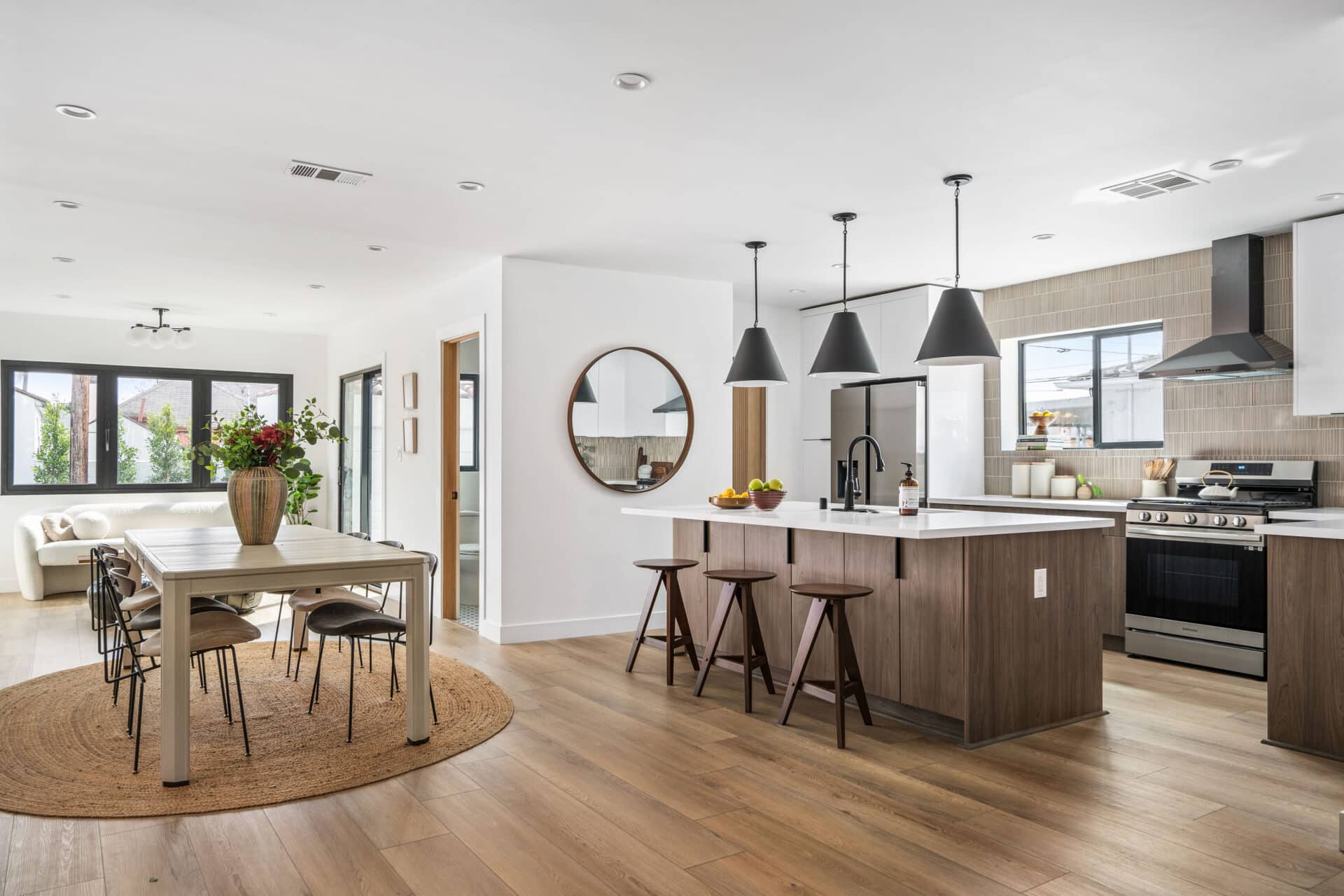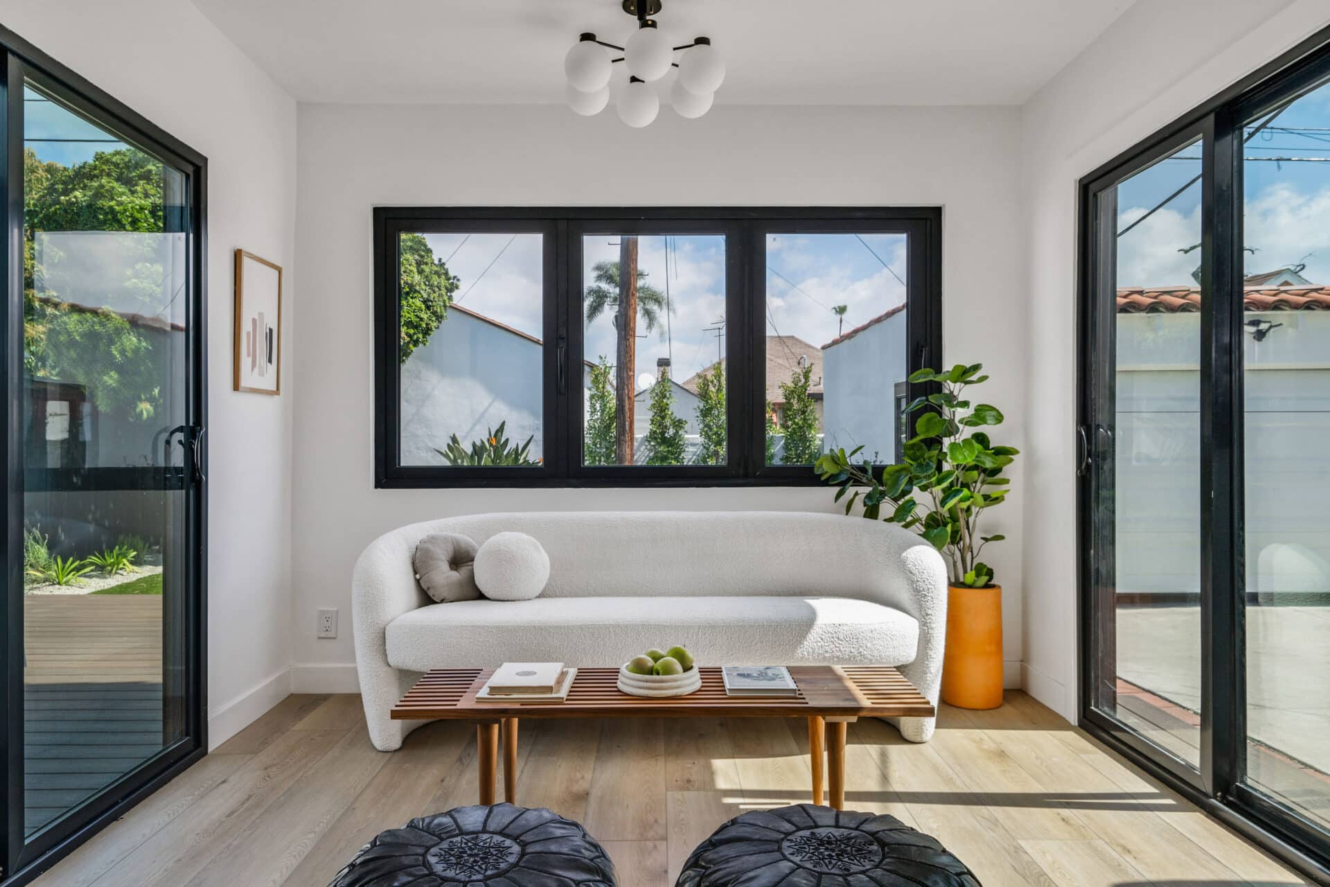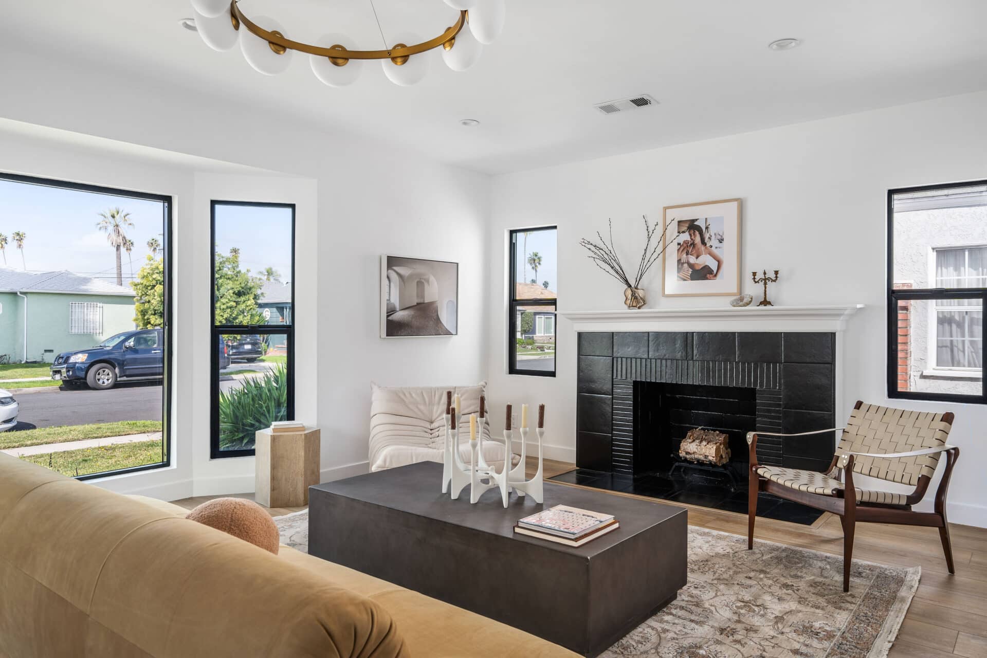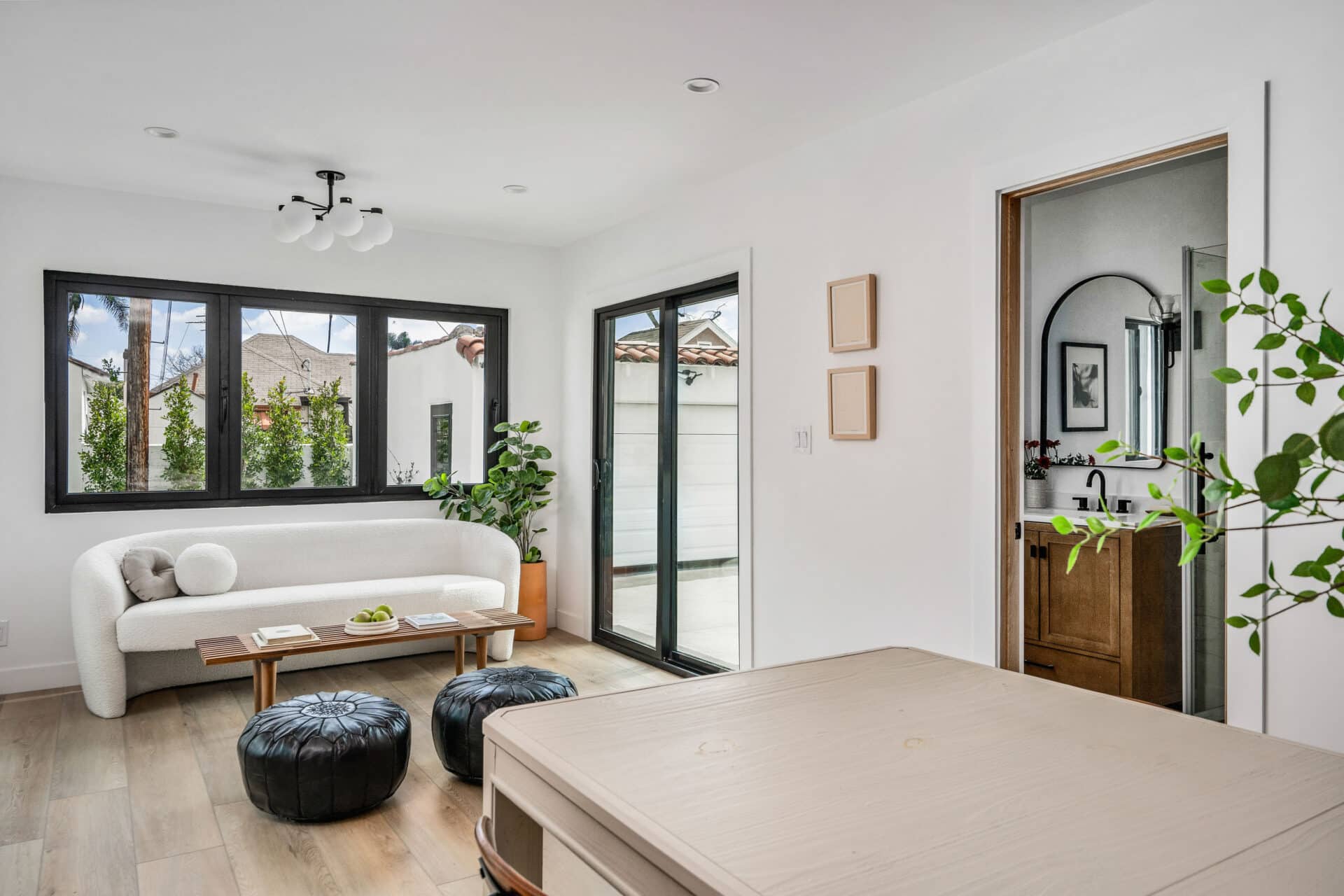 A stylish CB2 light fixture dazzles overhead in front of an original fireplace, ensuring this will be your favorite space to hang on rainy days spent inside. Test your cooking skills in the newly curated kitchen featuring new cabinetry, new Stainless Steel built-in appliances, quartz counters and an island with ample built in storage + seating. The adjacent dining area begs for a long table for hosting gatherings and dinners. Imagine evenings with the bi-folding window + double sliding doors open from the nearby den, welcoming in a breeze while revealing an outdoor sanctuary for all to enjoy. Three spacious bedrooms provide tranquil retreats, with two featuring en-suite bathrooms for a luxurious touch.