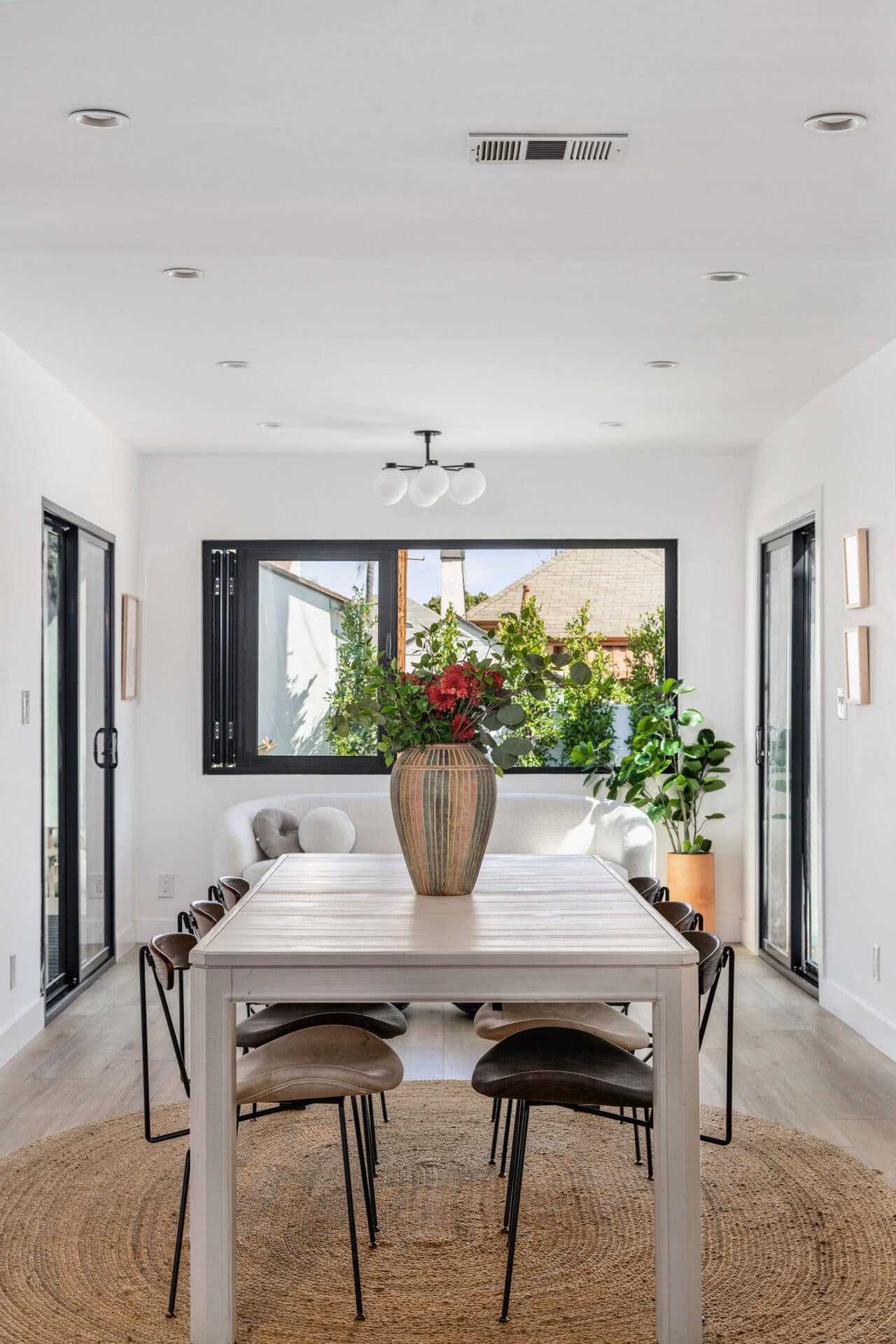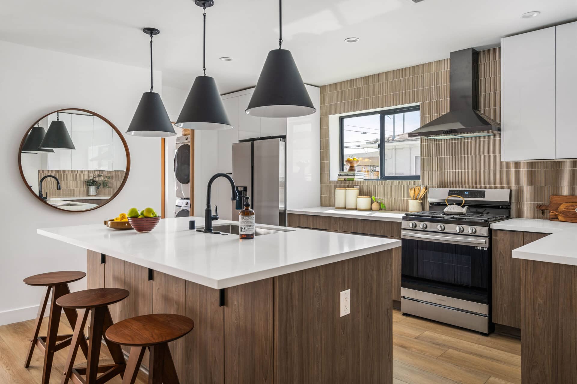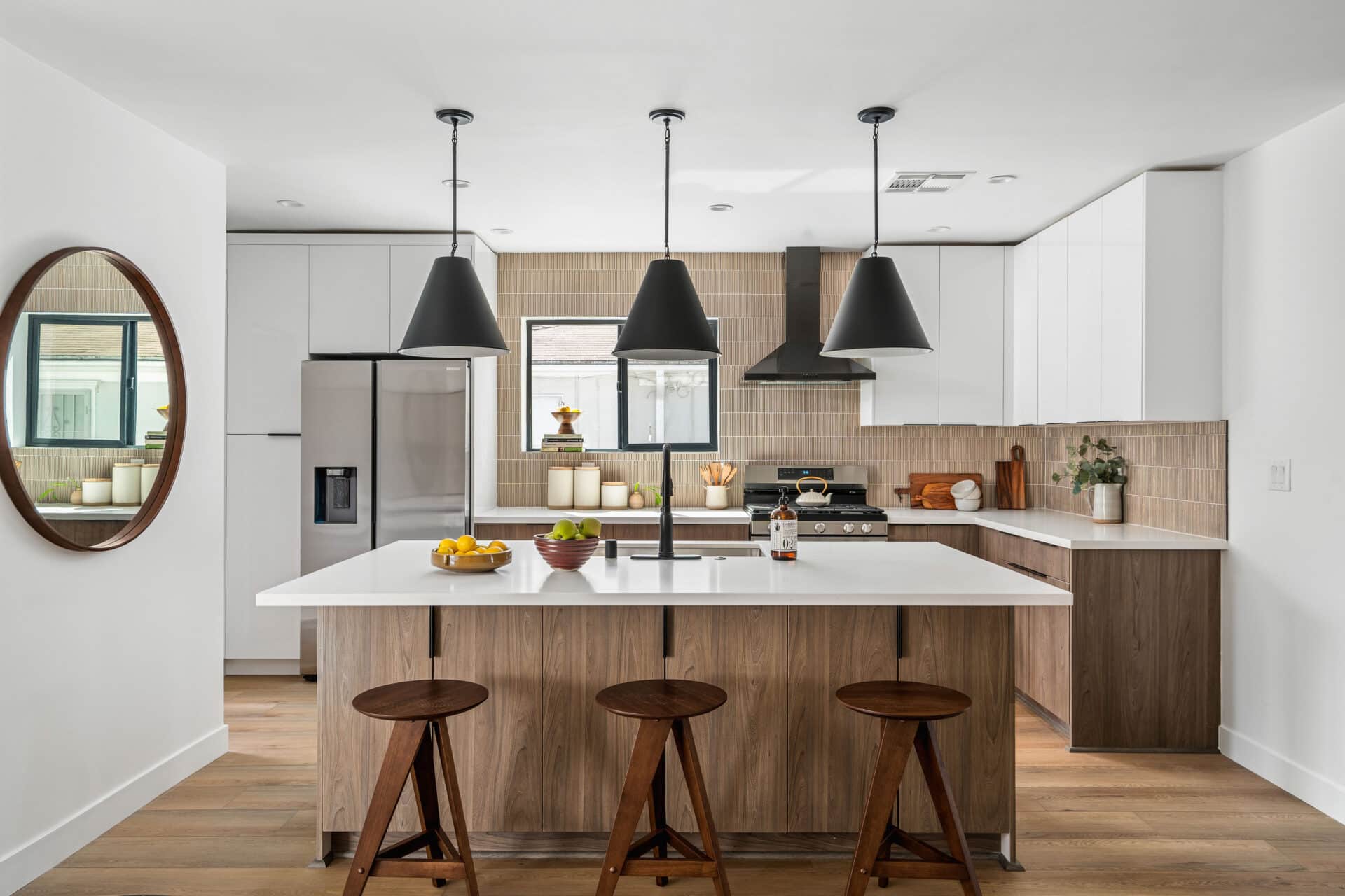 A stylish CB2 light fixture dazzles overhead in front of an original fireplace, ensuring this will be your favorite space to hang on rainy days spent inside. Test your cooking skills in the newly curated kitchen featuring new cabinetry, new Stainless Steel built-in appliances, quartz counters and an island with ample built in storage + seating. The adjacent dining area begs for a long table for hosting gatherings and dinners. Imagine evenings with the bi-folding window + double sliding doors open from the nearby den, welcoming in a breeze while revealing an outdoor sanctuary for all to enjoy. Three spacious bedrooms provide tranquil retreats, with two featuring en-suite bathrooms for a luxurious touch.