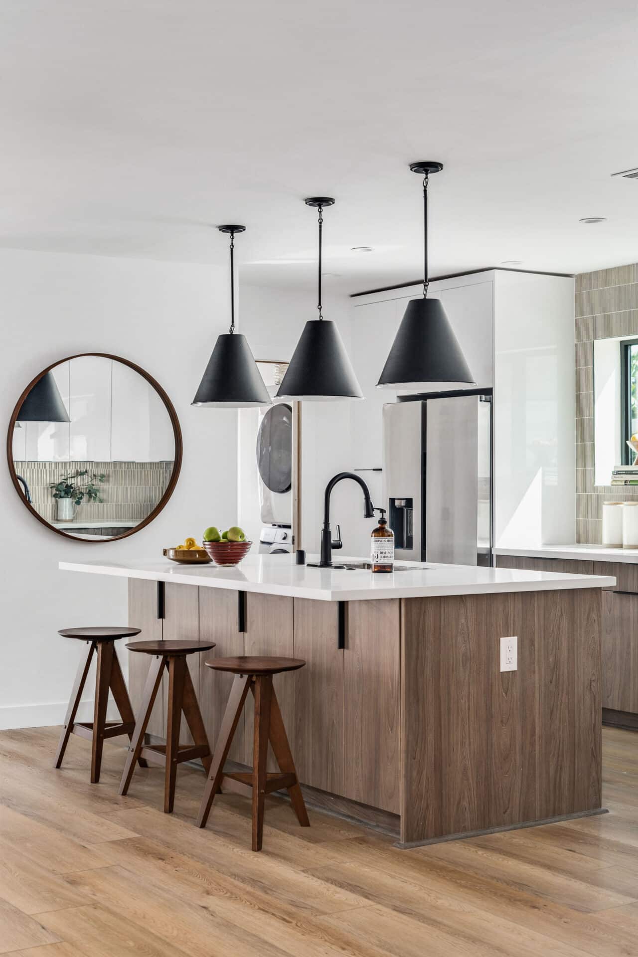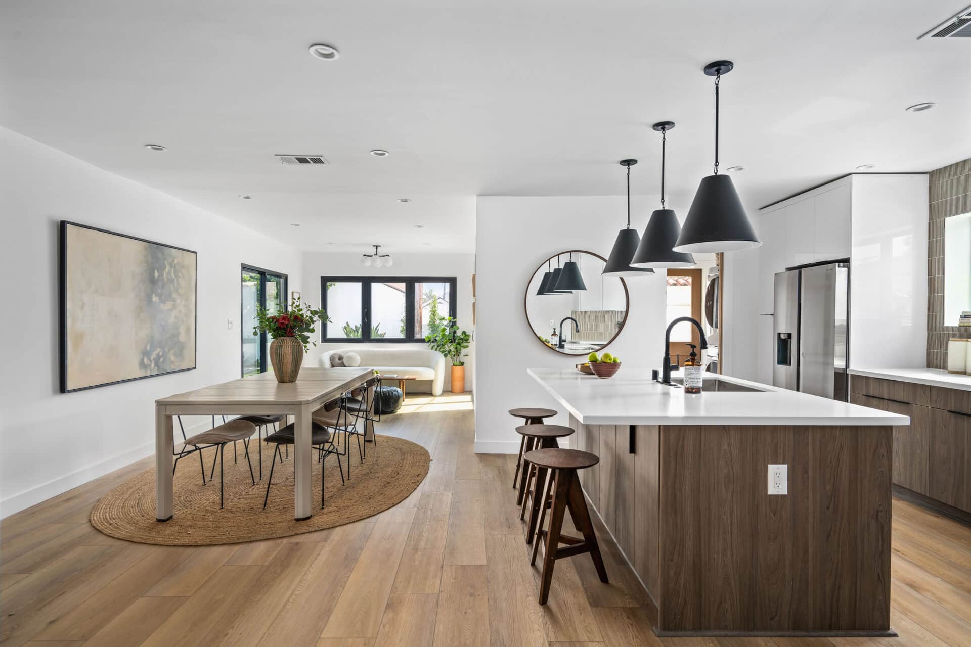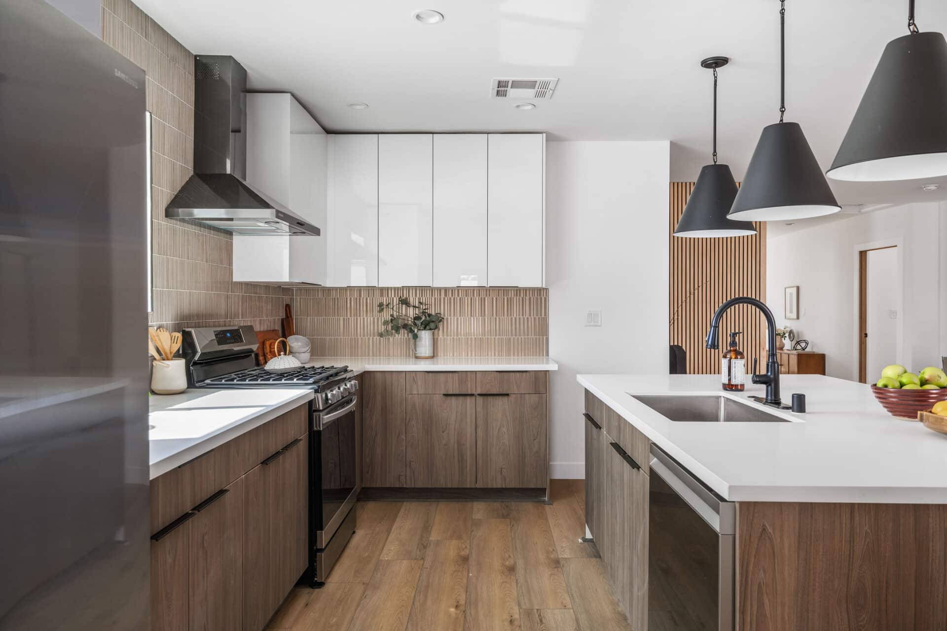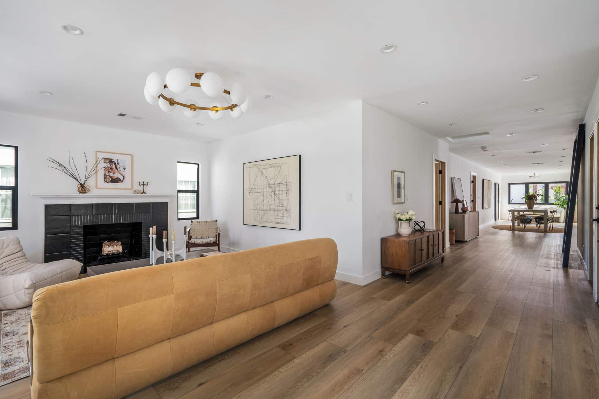 A stylish CB2 light fixture dazzles overhead in front of an original fireplace, ensuring this will be your favorite space to hang on rainy days spent inside. Test your cooking skills in the newly curated kitchen featuring new cabinetry, new Stainless Steel built-in appliances, quartz counters and an island with ample built in storage + seating. The adjacent dining area begs for a long table for hosting gatherings and dinners. Imagine evenings with the bi-folding window + double sliding doors open from the nearby den, welcoming in a breeze while revealing an outdoor sanctuary for all to enjoy. Three spacious bedrooms provide tranquil retreats, with two featuring en-suite bathrooms for a luxurious touch.