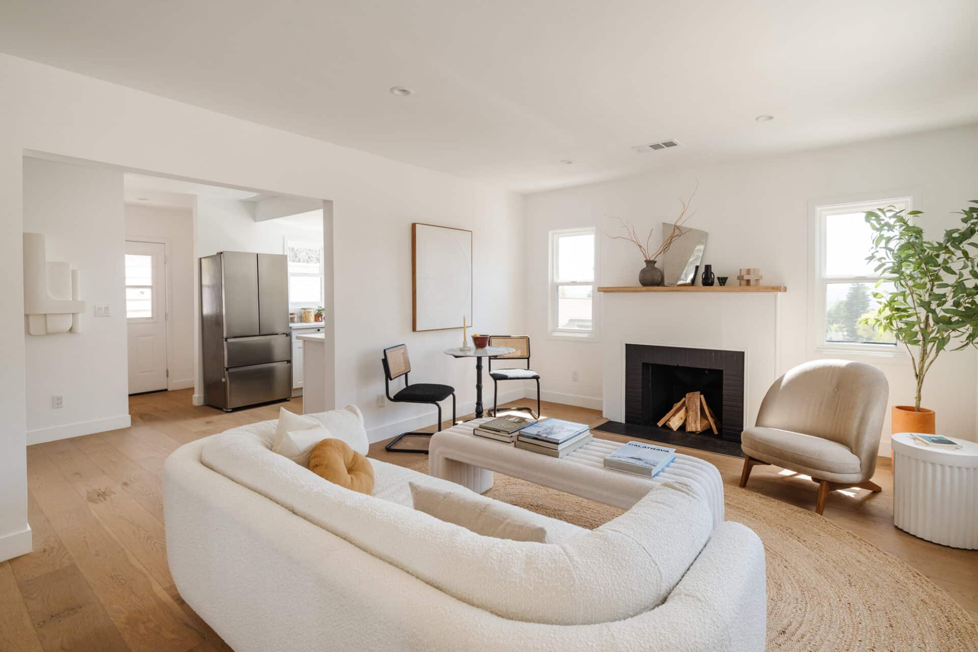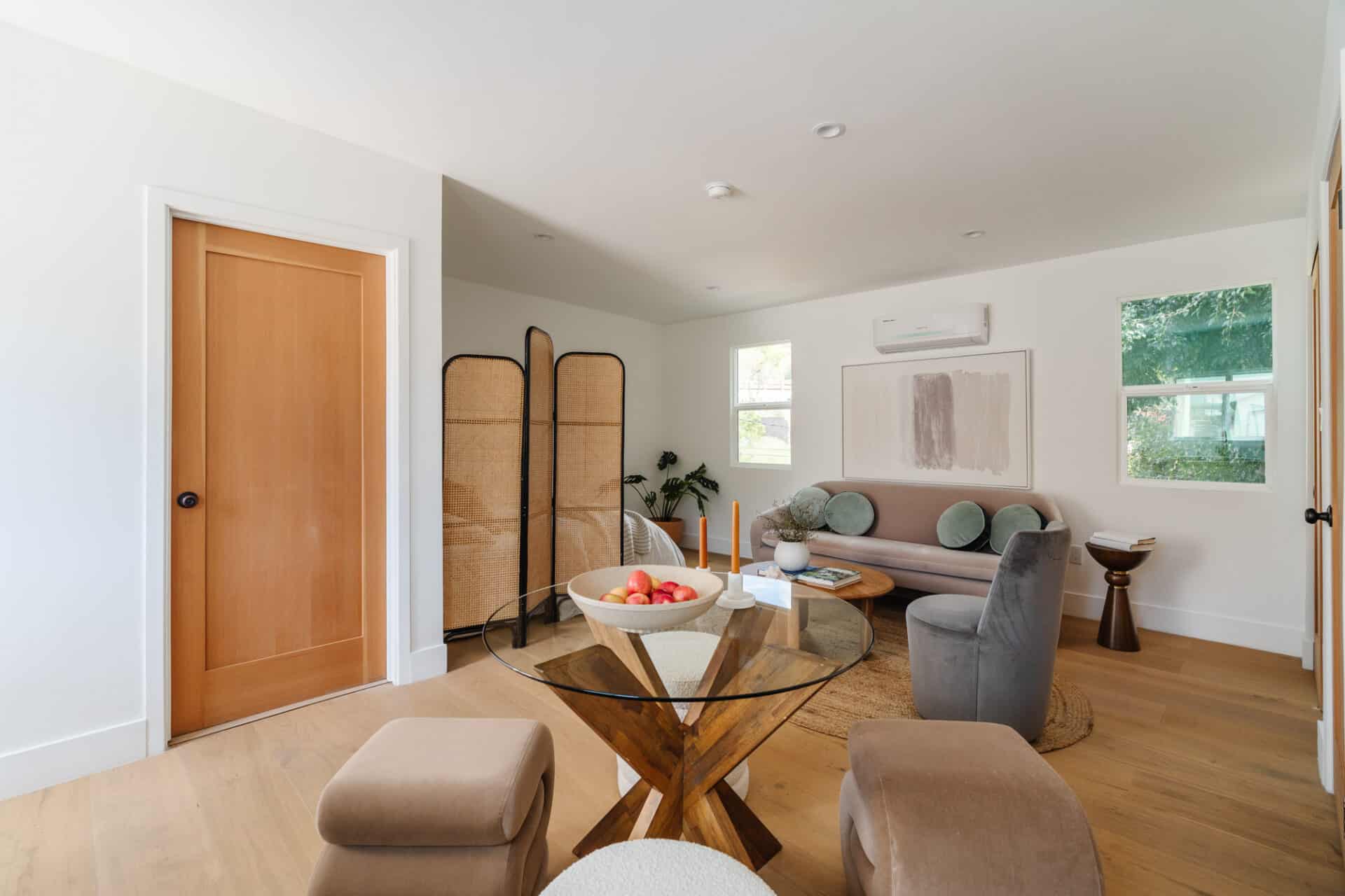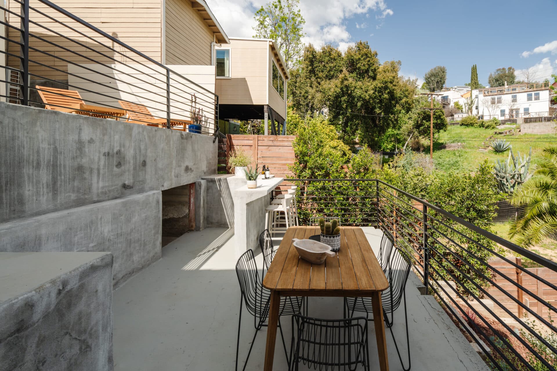Bright & breezy 2BR/2BA Craftsman Bungalow nestled in the hills of Highland Park, thoughtfully renovated with lush hillside views and a newly constructed studio ADU with its own bathroom and kitchen. Step inside the main home’s sun-splashed interior, where new oak wood floors flow throughout, leading you from a formal living room with decorative fireplace and optional dining area, to a newly renovated kitchen with quartz counters, marble tiled backsplash, open shelving, integrated hood, new stainless steel appliances and windows that overlook lush hillside neighborhood views. Main home features 2 bedrooms, including a primary with ensuite bath with freshly reimagined bathroom with chic matte black fixtures. Hall bath with stacked tile shower and hex marble floor tiles is perfect for guests.